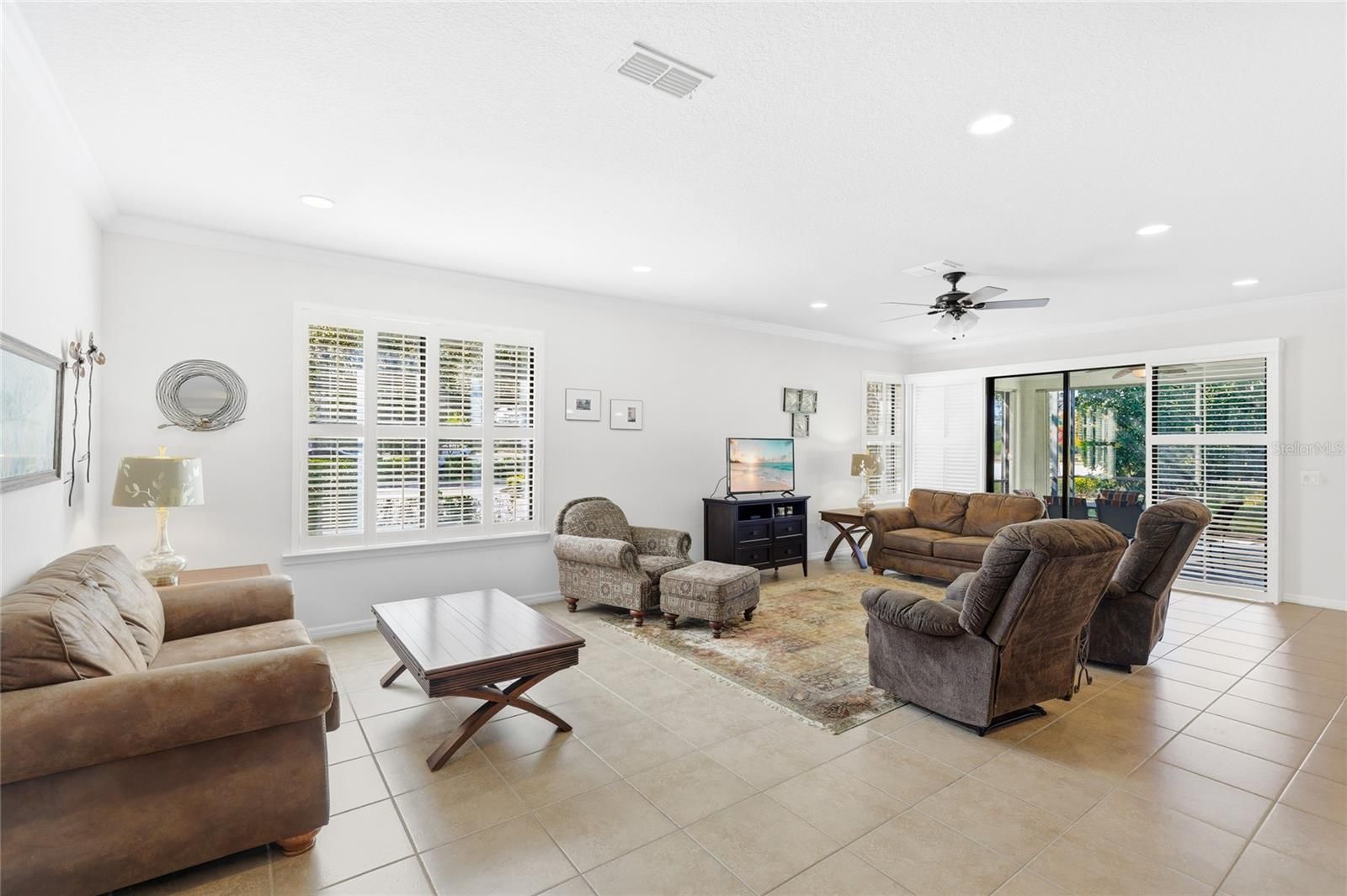 PRICED TO SELL WITH A LOCATION THAT MAKES THE BEST OF WHAT 55+ VENETIAN FALLS OFFERS WITHIN FOOTSTEPS OF YOUR FRONT DOOR. This beautiful and well-kept home is one of the largest single-level plans in Venetian Falls, offering a spacious and versatile layout designed for comfortable living. This ranch-style residence boasts 2,165 square feet of living space, with three bedrooms plus a den (which can serve as an office, hobby room, or additional guest space), two bathrooms, and a two-car garage. Interior highlights include elegant porcelain tile throughout, plantation shutters for a touch of sophistication, beautiful dark granite countertops, quality raised panel cabinetry, and French doors leading into the den. Additional features of this versatile, open floor plan encompass a kitchen nook for casual dining, a separate formal dining area and an exceptionally spacious living area, plus a covered lanai that extends outdoor living space—perfect for enjoying Florida's mild climate. For added peace of mind, the home is equipped with hurricane accordion shutters. This home's design emphasizes open flow and functionality. Just outside your front door and literally steps away from this home is Venetian Fall’s impressive 16,000-square-foot clubhouse, which serves as a hub for recreation and socializing. Residents enjoy amenities such as a state-of-the-art fitness center with cardiovascular and strength-training equipment, an aerobics studio for yoga and classes, billiards and card rooms, an arts and crafts space, a grand ballroom with a dance floor and catering kitchen, an internet cafe, a library, and a meeting room. Outdoor facilities include a resort-style heated swimming pool, a resistance walking pool with a whirlpool spa, four bocce ball courts, a 9-hole putting green, scenic walking and biking trails, and picturesque ponds. The homeowners' association (HOA) handles lawn maintenance and landscaping, as well as periodic roof power washing, fostering a low-maintenance environment that allows residents to focus on enjoying their retirement. Proximity to everyday conveniences like grocery stores (Publix and Winn-Dixie), restaurants, and marinas adds to the appeal, making Venetian Falls an ideal spot for those seeking an active, community-oriented life in sunny Southwest Florida.