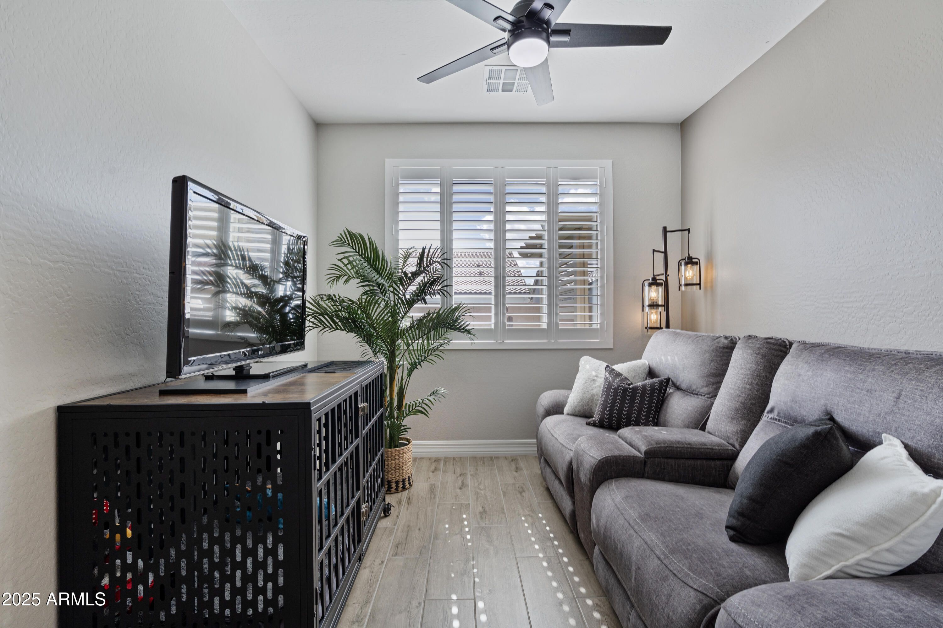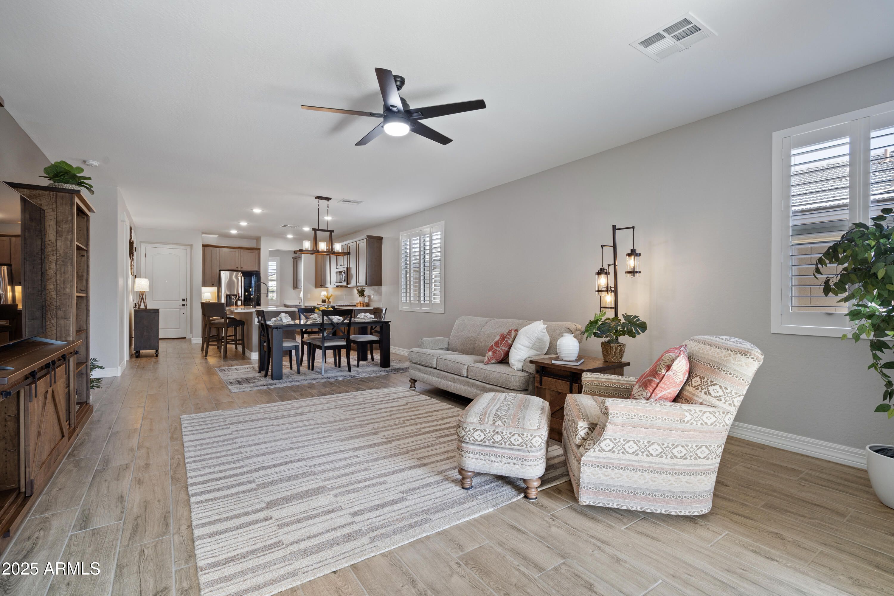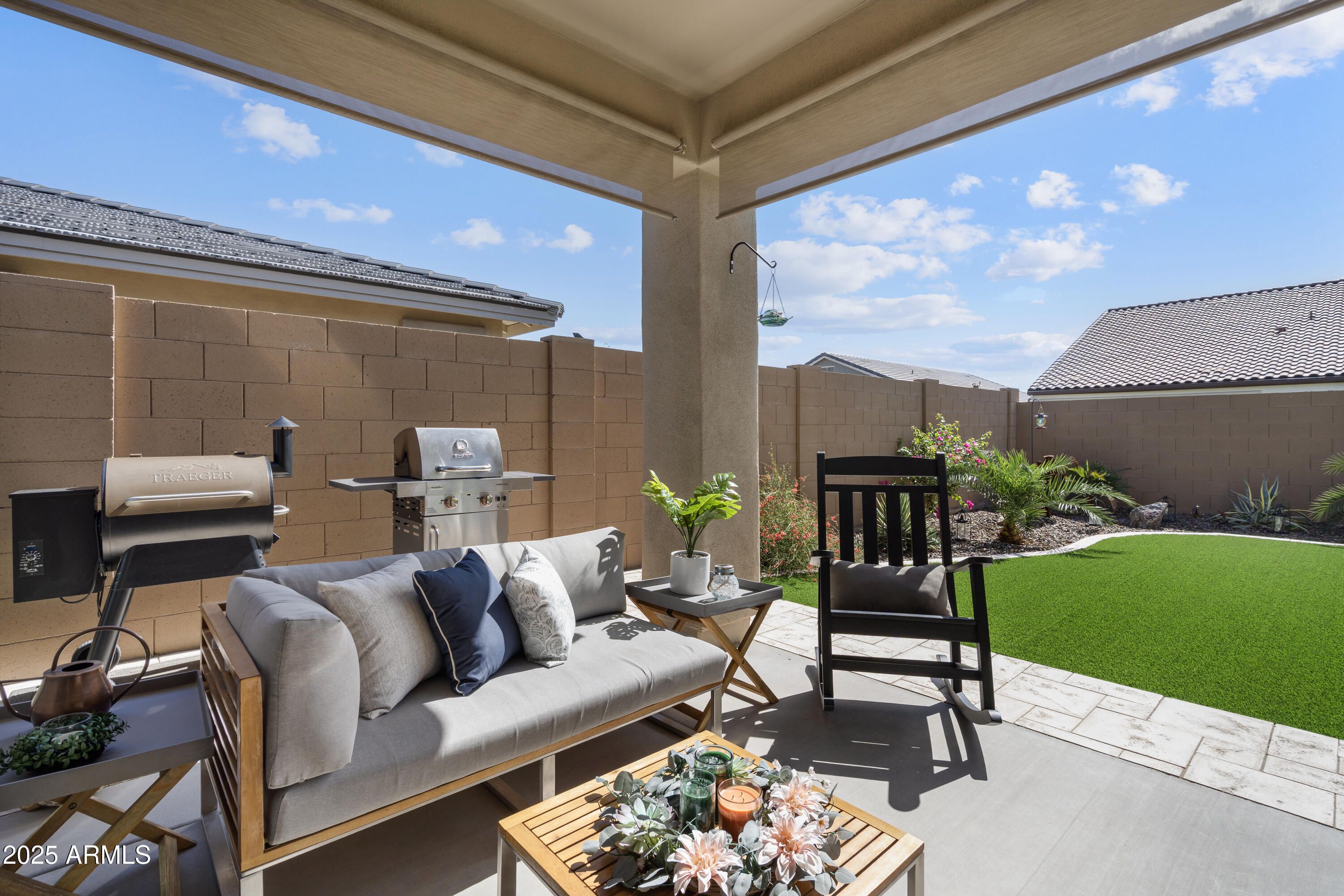 Welcome to Victory, where every day feels like a vacation. Cradled by the White Tank Mountains, this beautifully upgraded home offers the perfect blend of comfort and resort living. Inside, you will find wood shutters throughout, upgraded appliance package, an added flex space and an extended garage ready for your truck and toys. Step outside to your front enclosed patio with views of the mountains, or unwind under the custom pergola by the fire pit surrounded by pristine desert landscape. The backyard is turfed for easy backyard maintenance. With pickleball courts, resort pools, a fitness center and restaurants just moments away--this turn-key home lets you live the lifestyle you've been dreaming of. Why build new, when Luke Ave is perfect! This is Vacation Living in Victory.