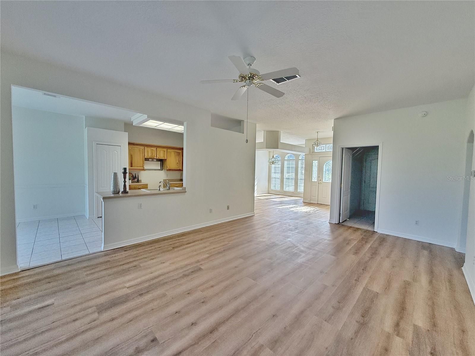 HURRY! This lovely one-of-a-kind, move-in ready GOLF course view St Laurent floor plan is COMPLETELY REMODELED with a spectacular view of the Executive Course is waiting for you. Upon entering the home through the beveled glass front door and side windows, you will immediately notice how light and bright it is as it has been freshly PAINTED with neutral colors and NEW Laminate flooring throughout.. To the Right is a separate formal dining area featuring a decorative shelf and open to the Kitchen. The great room or Living room has laminate flooring, located off the Kitchen with stackable SLIDING glass doors onto the Lanai and has a AMAZING view of the GOLF course. The Kitchen has SOLID wood cabinets, a closet pantry, under cabinet lighting, ceramic tile flooring and all NEW STAINLESS steel appliances on order awaiting delivery. . There is BAR top seating and a Dinette area with a Wonderful view of the Golf. There are also Sliding doors that lead you to the large screened in and ceramic tiled floor lanai to enjoy the expansive view. Another view of the golf course is offered from the Primary bedroom from sliding glass doors leading into the covered and screened in lanai, laminate flooring, a walk in closet, and a en suite bathroom with linen closet. The Primary bath offers DUAL sinks with a make up vanity, solid wood cabinets, shower, separate GARDEN tub and private commode area with ceramic tile flooring, and a linen closet There are some built in shelves within the Primary walk in closet with laminate flooring. Bedrooms 2&3 have a SPLIT floor plan. Bedroom 2 allows another opportunity to enjoy the golf course view, built in closet, and laminate flooring. Bedroom 3 could be a den/study if needed also has laminate flooring and a built in closet. Bathroom 2 located between bedrooms 2&3 has ceramic tile flooring, solid wood cabinet, shower with a glass sliding door. There is a linen closet as well. There is a TILED screened in lanai across the entire back of the home with NEW ceiling fans with lots of space to watch the golfers, wildlife and sunsets, entertain friends and family or just relax. The AC is 2019 and all the ducts have just been cleaned. The HOA fees include: Exterior painting every 6 years, Exterior lawn maintenance including mowing, fertilizing, mulch and irrigation with reclaimed water, Basic Cable and Internet, all amenities, private maintained roads. Kings Ridge is a 55+ GATED community and has 2 pools, a clubhouse that features a library, computer room, fitness center, dance room, arts and crafts room, card tables, Theater, pool tables, gathering space and so much more. The is Basketball, Pickleball, shuffle board, hot tubs, cabanas that have tables, chairs and grill, Hot Tub, sauna and so many activities to choose from.
