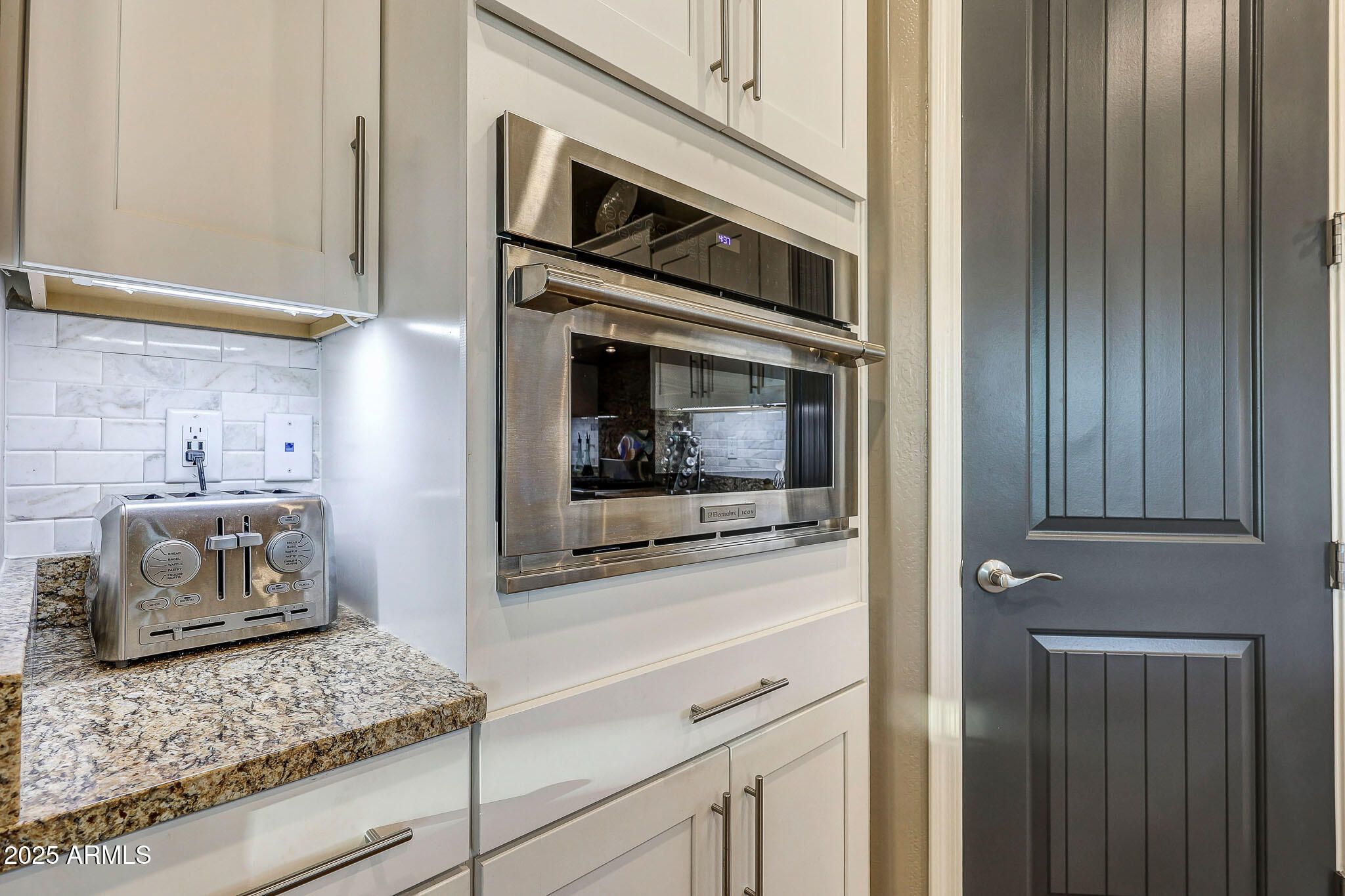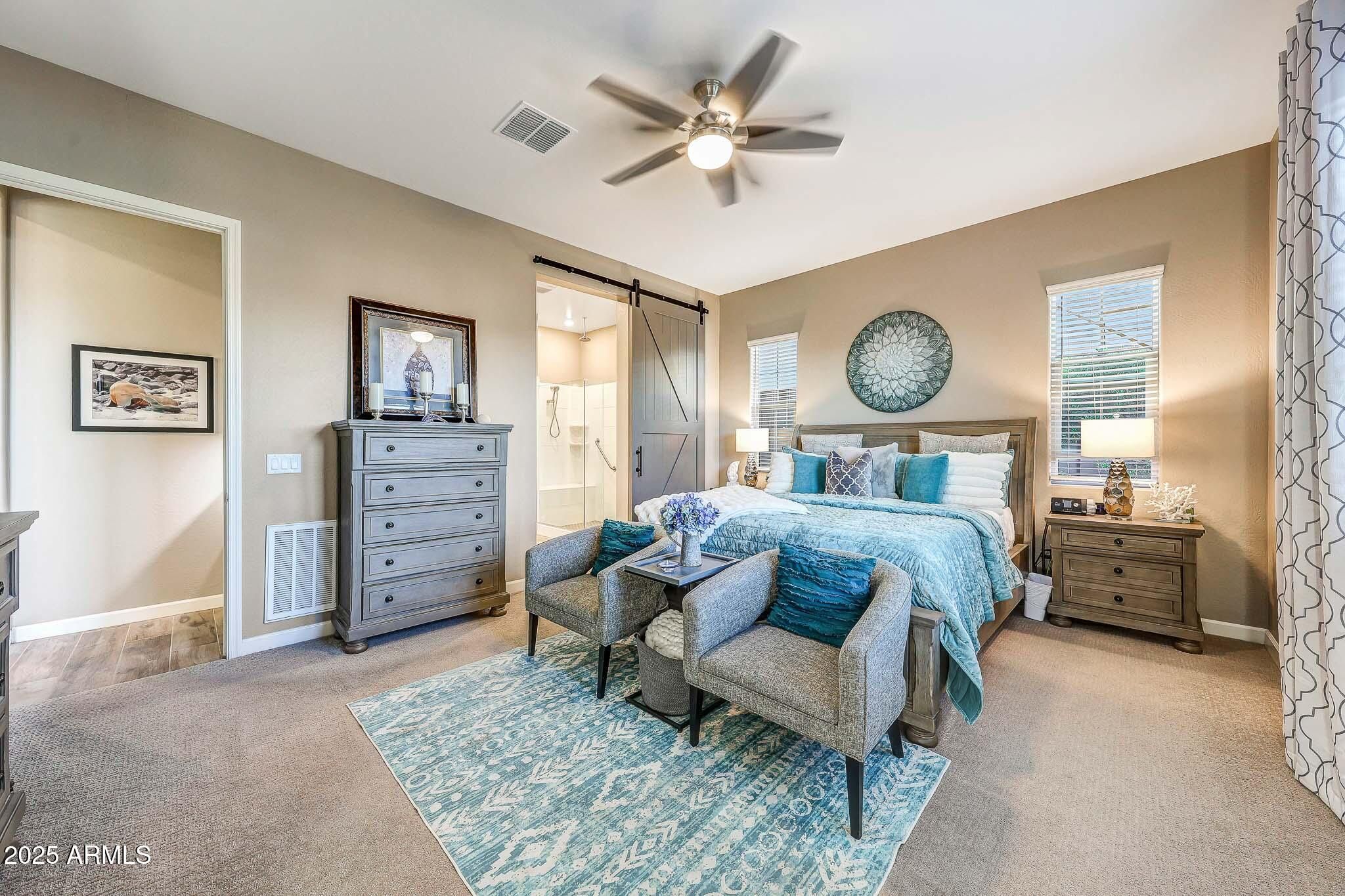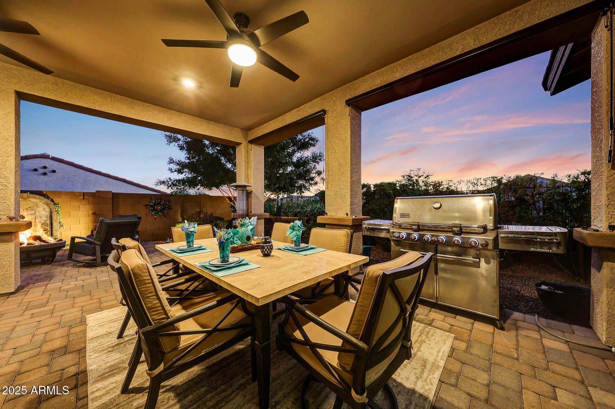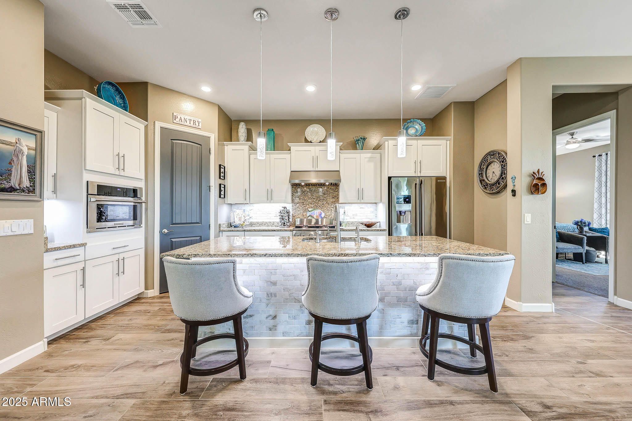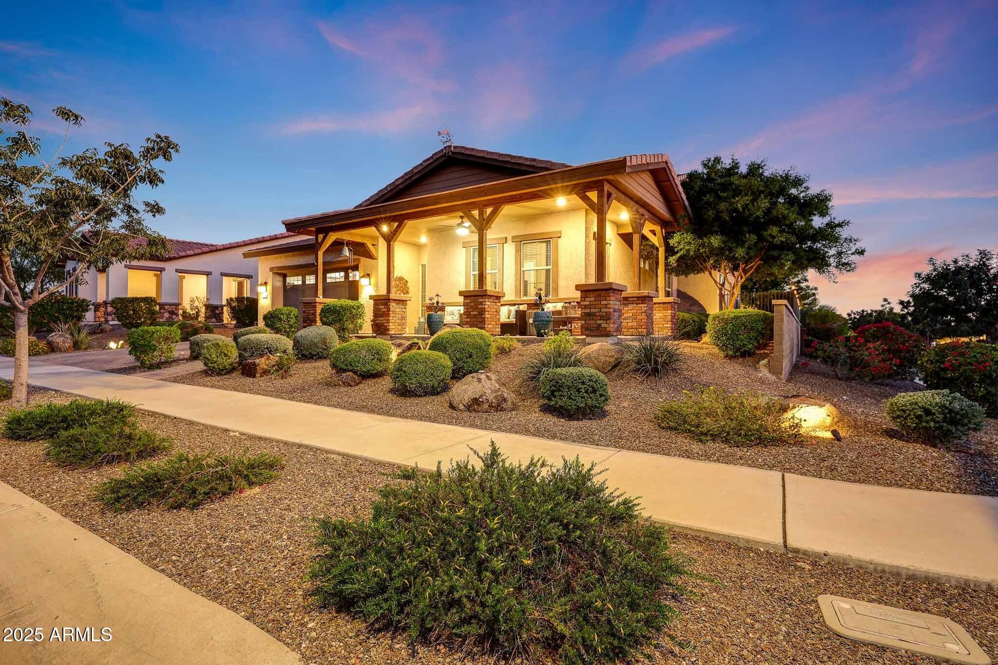 This home shows like a model! The highly desirable Super Summit floor plan features 2 bedrooms, 2 bathrooms, a den and an extended great room, designed with open-concept living. With over $100,000 in designer upgrades, this home is truly move-in ready. The inviting entry showcases a stunning glass-and metal door, wood-like plant tile flooring, and custom two-tone paint throughout. The gourmet kitchen is a chef's dream with white cabinetry, a beautiful marble backsplash, granite countertops, and SS Electrolux appliances. The spacious great room features a built-entertainment wall and dual sliders, filling the space with natural light. The serene primary suite includes a custom barn door, granite countertops, dual sinks, and walk in shower. Step outside to a resort-style backyard complete with an extended covered patio, pavers, a built-in fire pit, two custom water features, astroturf, and lush mature landscaping. The 2.5 car garage offers epoxy floors, built-in cabinets, and plenty of storage. Every detail of this home has been meticulously designed for comfort, elegance, and easy living.