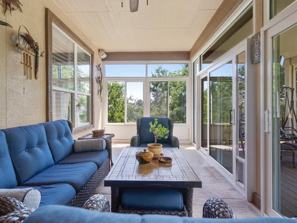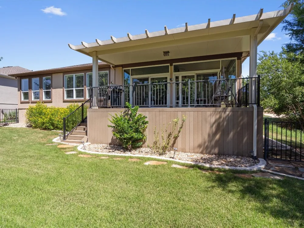 A sparkling Sun Room overlooks a winding greenbelt flush with native trees at this joyful Sun City Texas Cumberland Hall plan mere minutes from myriad activities of Cowan Creek Amenity Center and Golf Course. After greetings from a large Front Sitting Porch, a Gallery Foyer invites you inside. There, French doors open into the Study/Computer Room, where a trio of shuttered windows reveal the landscaped front yard and streetscape. Across the Foyer, the spacious Breakfast Room repeats the view, while a nearby Butler's Pantry makes an ideal Wine Bar or Bonus Storage Room. The Laundry complete with soaking sink is adjacent. Ahead from the Foyer, the sizable Great Room touts a wall of windows viewing the private and fenced back yard, while a perfectly-placed Dining Area can be as dressy or casual as you wish. Meanwhile, a granite bar top gently separates the Great Room from the Island Kitchen, where a bounty of cabinets with roll-out shelves and a double-door Pantry Closet join with the granite counters and stainless-steel appliances for a thoughtful Heart of the Home. Off the Great Room full-view glass doors open onto the before-mentioned Sun Room, where heat & air makes its a year-around treat. A gorgeous easy-care covered deck with underneath storage resides off the glassed retreat and is a wonderful place for outdoor cooking or entertaining. Yet another wall of windows in the separated Primary Bedroom views the private back yard, while the en suite bath flaunts a wide dual vanity, a choice of tub, or shower and a generous Walk-In Closet. Across the home, a well-placed Powder Room is ideal for entertaining, while the Two Guest Bedrooms share a Jack & Jill Bath with dual vanities. What a perfect set-up for visitors! Don't miss the Extra-Wide Two-Car Garage with Golf Cart Parking, where proximity to the Island Kitchen makes bringing-in groceries an easy task. *Whole-house water filter in Garage. * Roof replaced - 2020. *A/C - 2023.