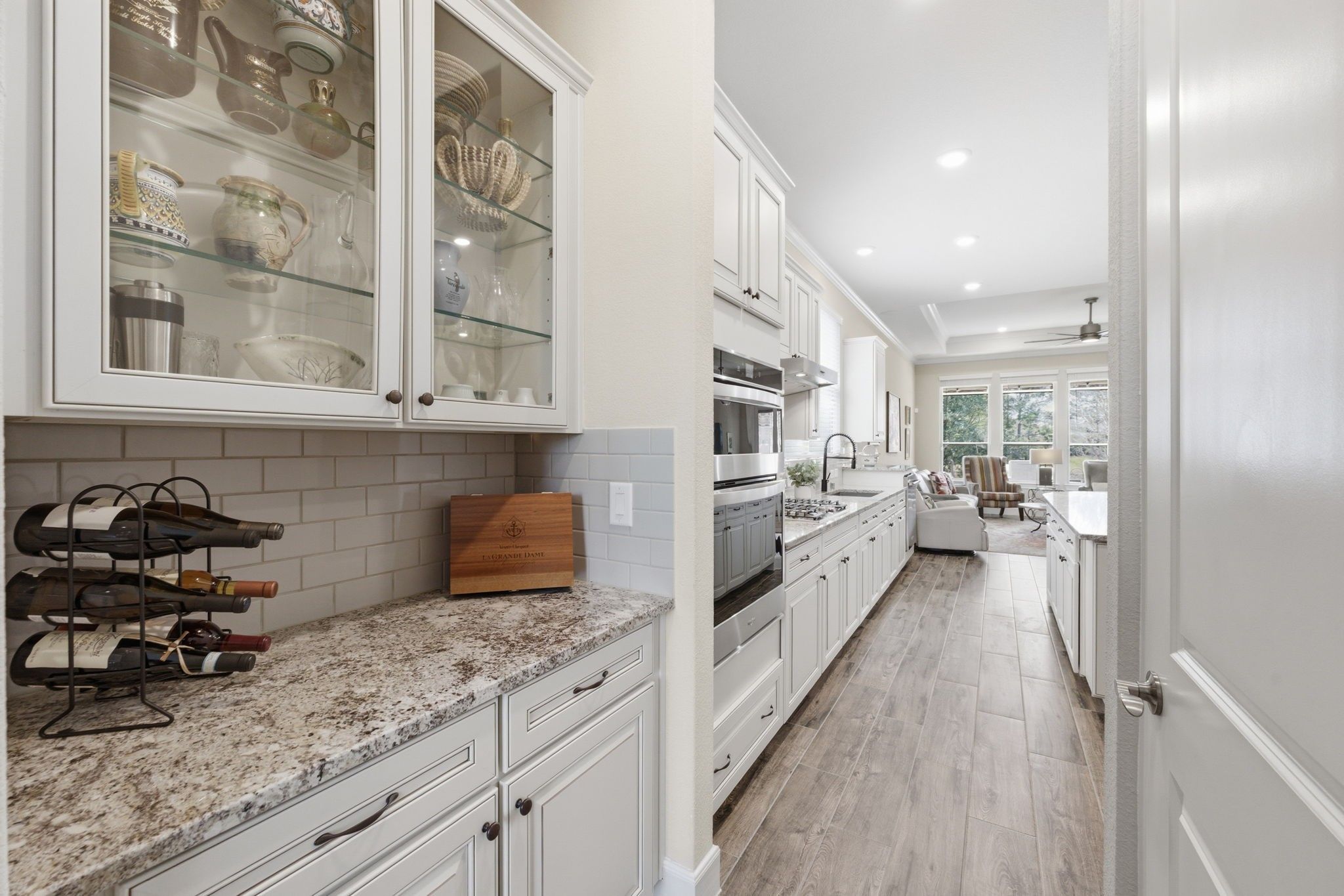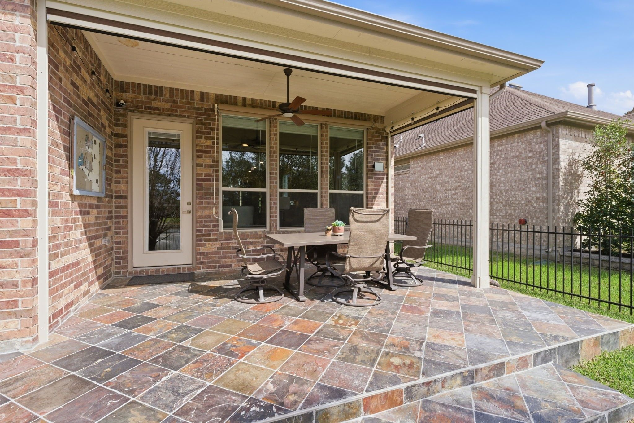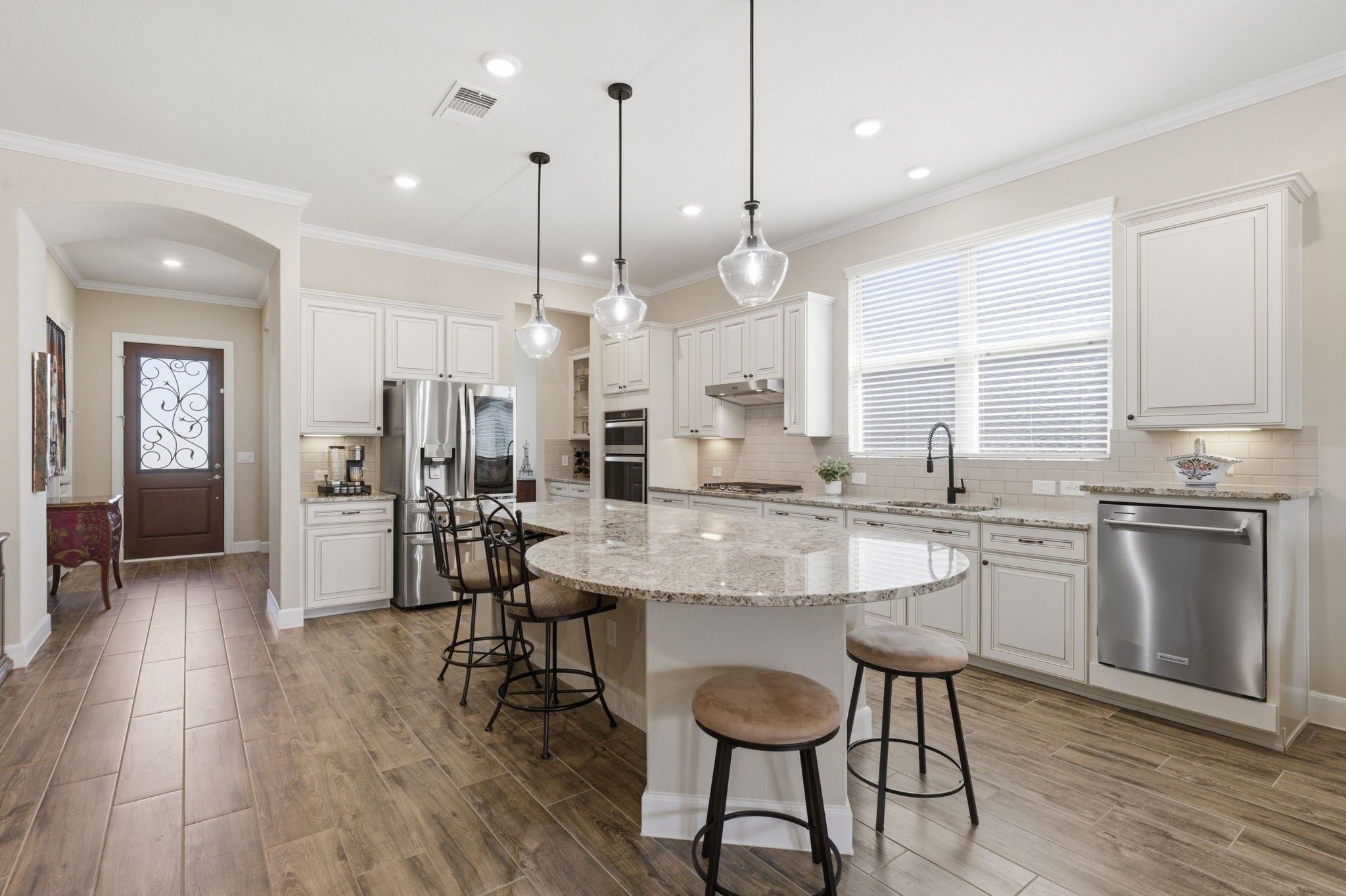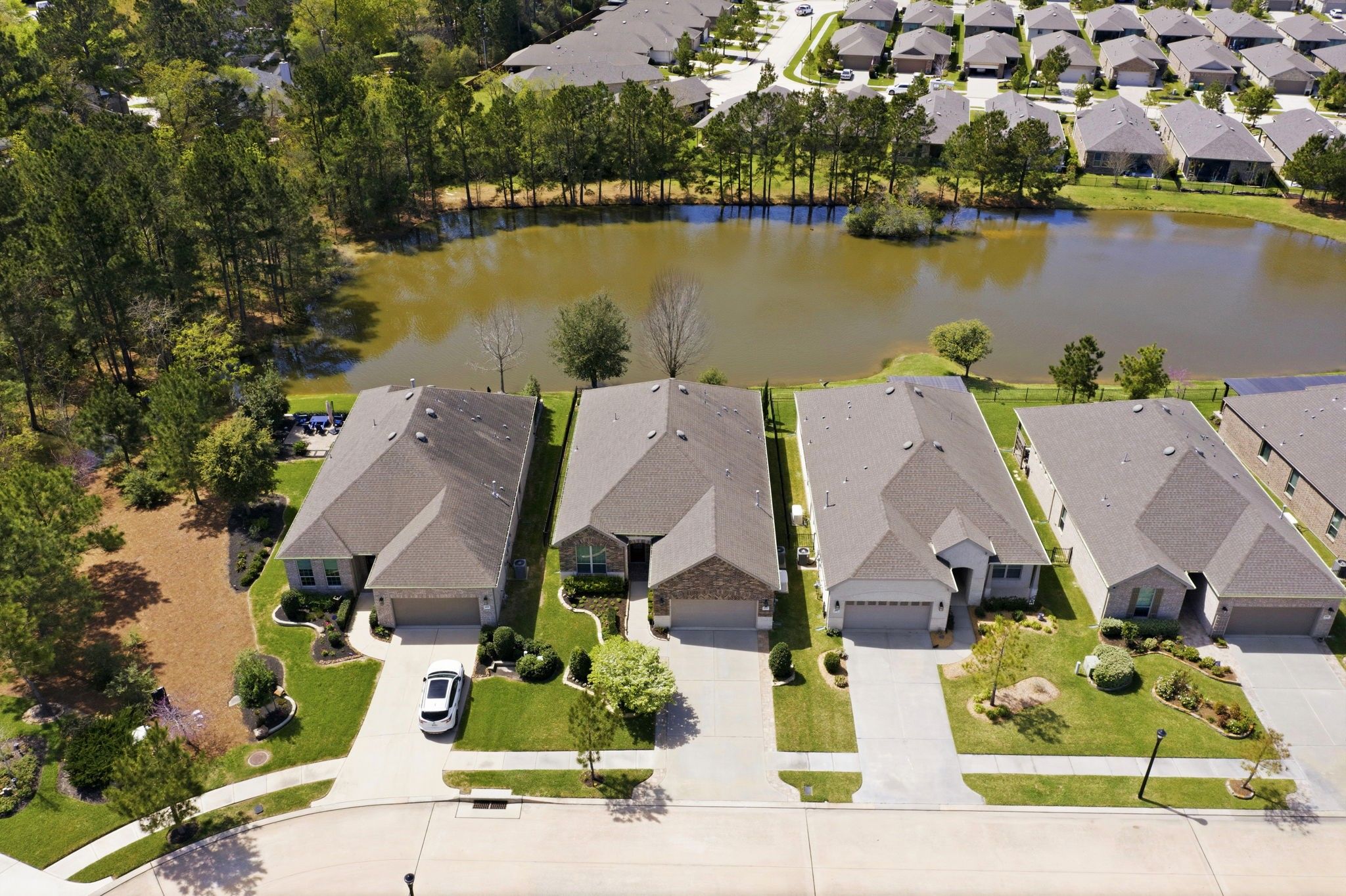 RARE FIND! WATERFRONT! Del Webb The Woodlands 55+ gated active-adult community! Beautifully maintained home with excellent curb appeal and manicured landscaping. This open-concept floor plan features a spacious living area with tray ceiling, abundant natural light, and wood-look tile flooring throughout—no carpet. Enjoy stunning pond views with a water feature from both the main living area and the primary suite. The island kitchen offers granite countertops, gas cooktop, stainless appliances, built-in oven and microwave, subway tile backsplash, ample cabinet space, walk-in pantry, and a butler’s pantry—perfect for entertaining. The primary suite features an ensuite bath with double sinks, walk-in shower, and custom walk-in closet. The home includes a dedicated office/flex space and three bedrooms. Additional highlights include a full house generator. Relax on the covered patio with electric roll-down screen overlooking a peaceful water setting with ducks and birds. Move-in ready!