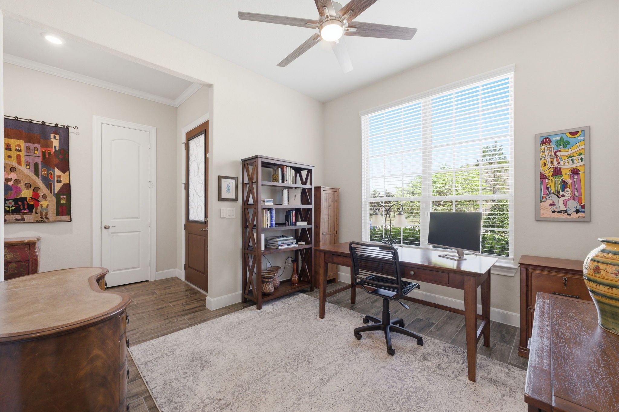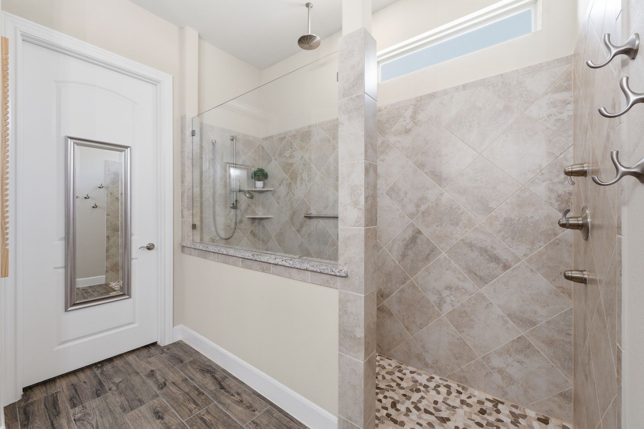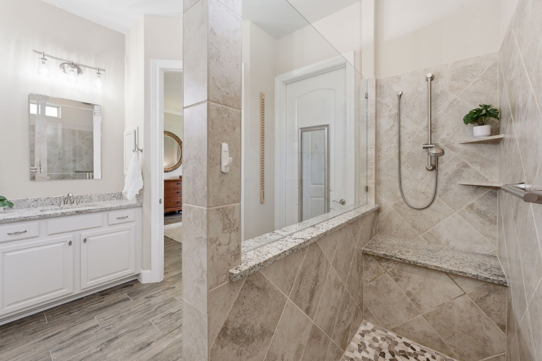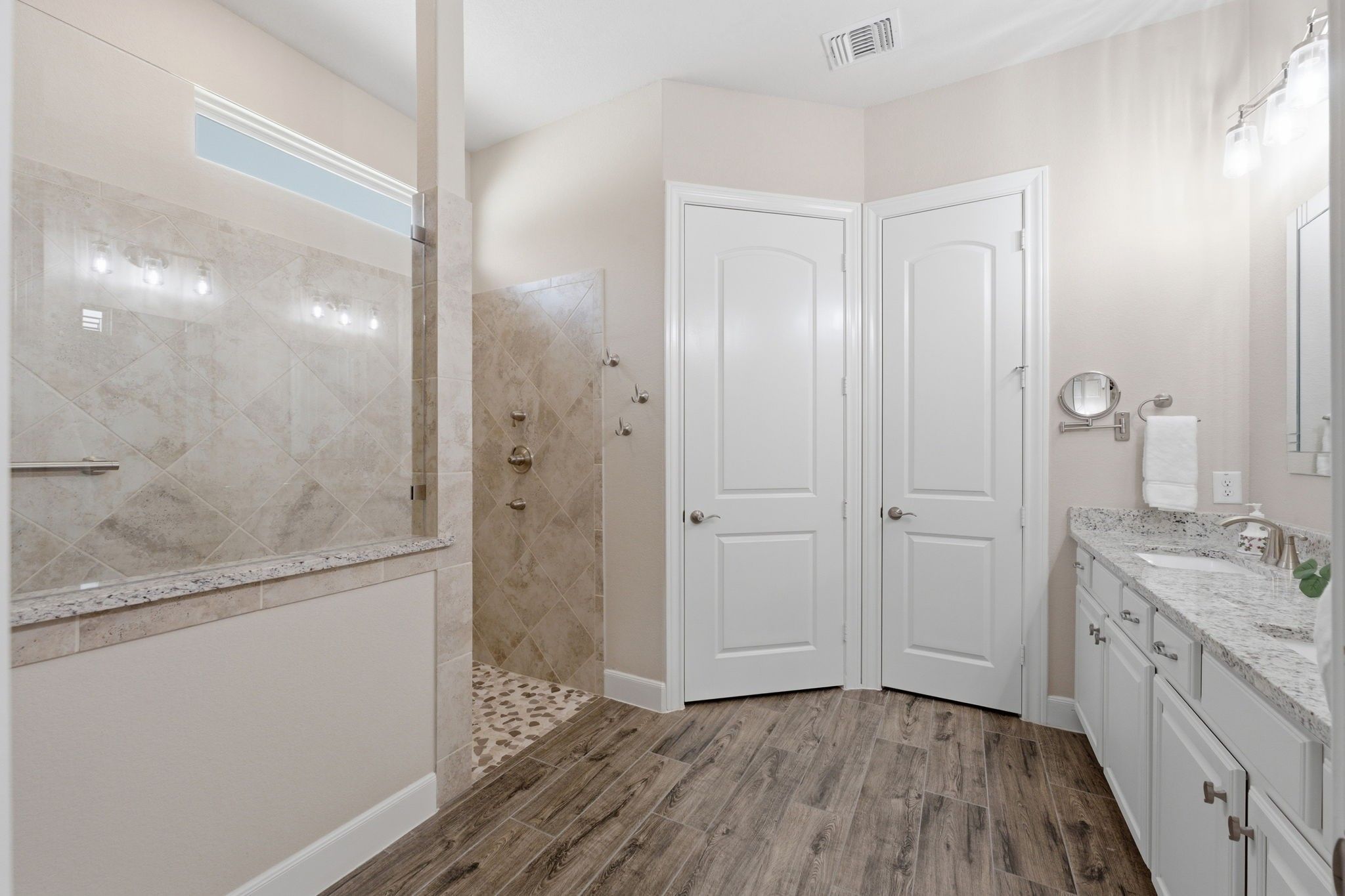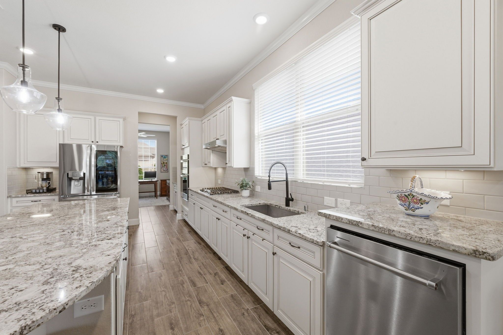 RARE FIND! WATERFRONT! Del Webb The Woodlands 55+ gated active-adult community! Beautifully maintained home with excellent curb appeal and manicured landscaping. This open-concept floor plan features a spacious living area with tray ceiling, abundant natural light, and wood-look tile flooring throughout—no carpet. Enjoy stunning pond views with a water feature from both the main living area and the primary suite. The island kitchen offers granite countertops, gas cooktop, stainless appliances, built-in oven and microwave, subway tile backsplash, ample cabinet space, walk-in pantry, and a butler’s pantry—perfect for entertaining. The primary suite features an ensuite bath with double sinks, walk-in shower, and custom walk-in closet. The home includes a dedicated office/flex space and three bedrooms. Additional highlights include a full house generator. Relax on the covered patio with electric roll-down screen overlooking a peaceful water setting with ducks and birds. Move-in ready!