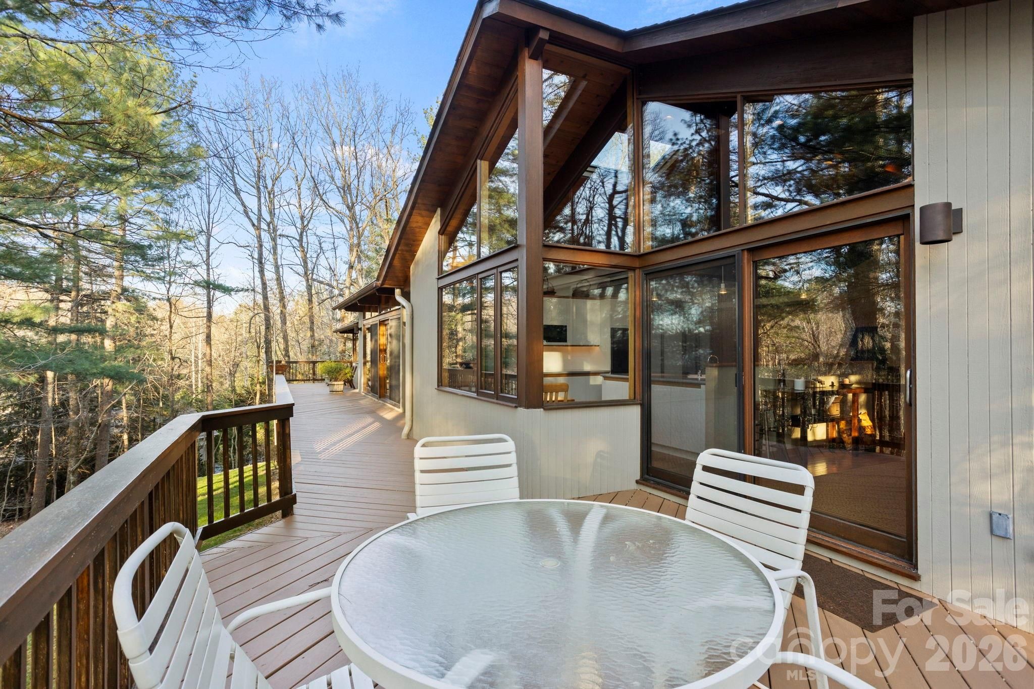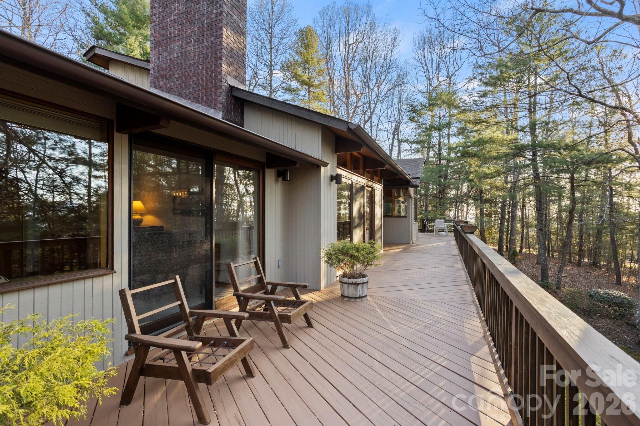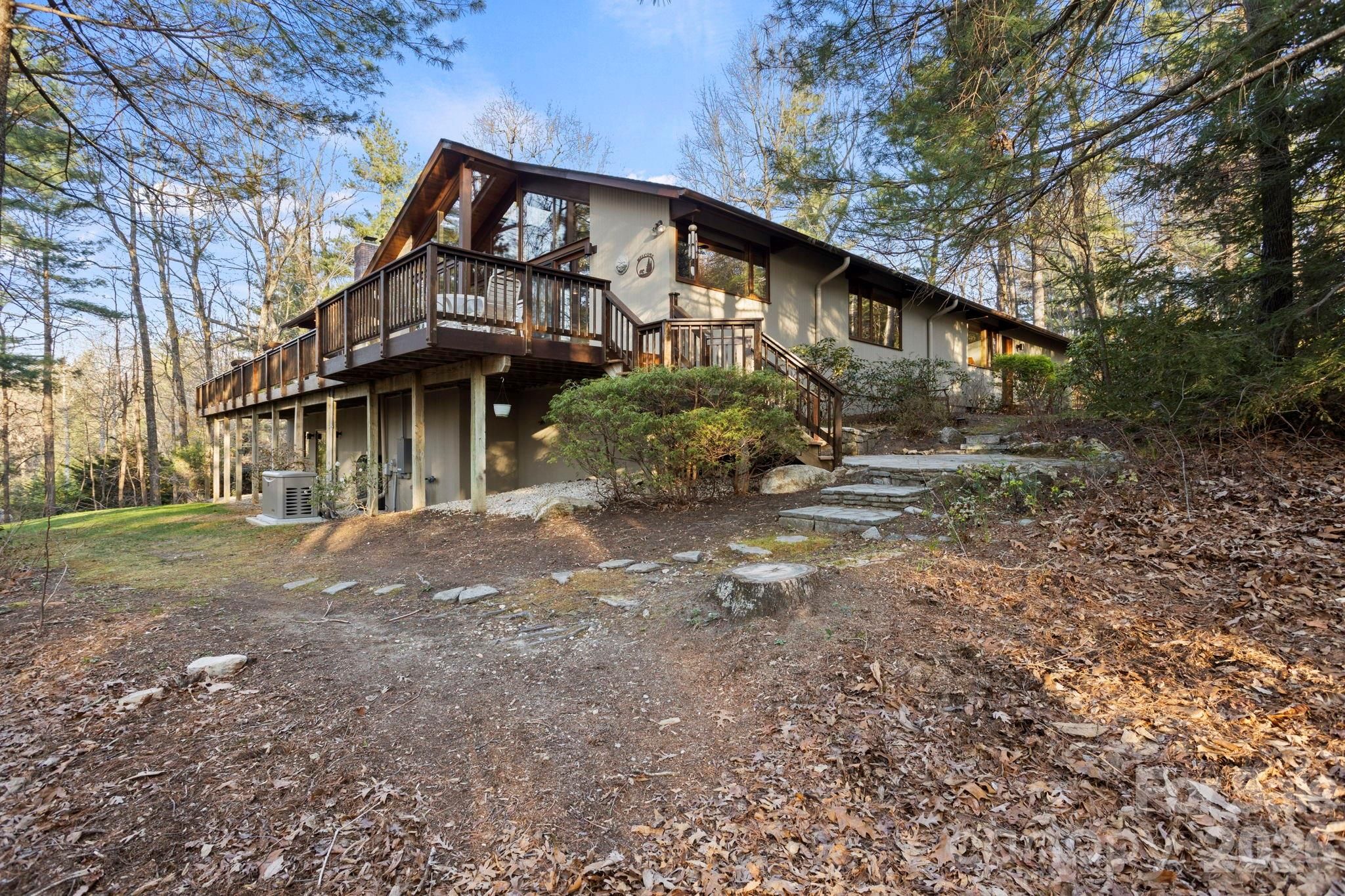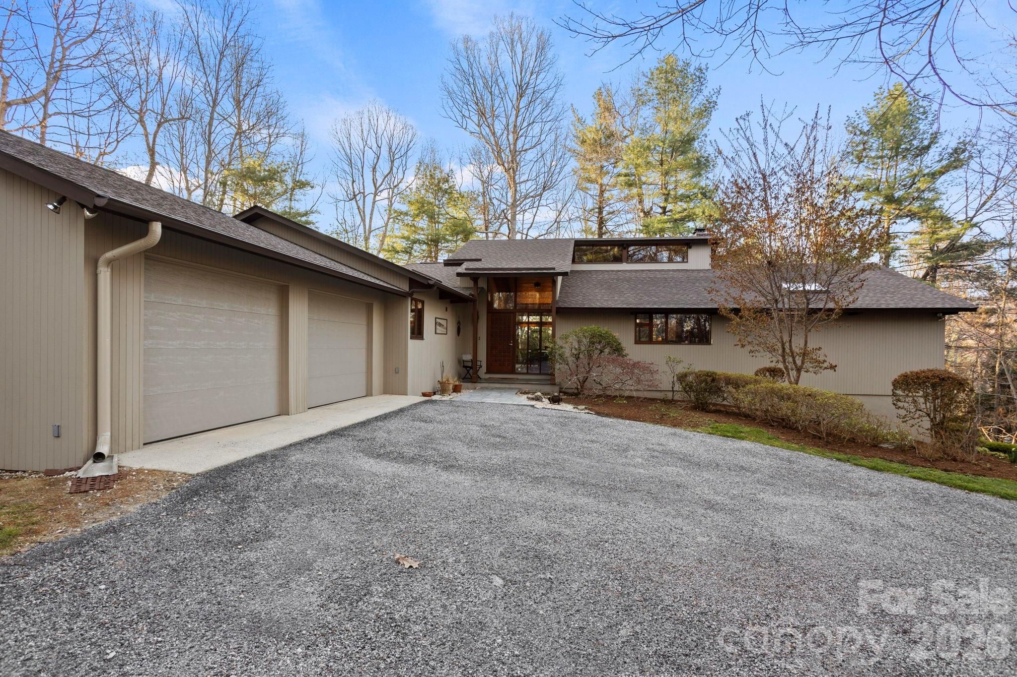 One-of-a-Kind Architectural Masterpiece in Kenmure. Exceptional and truly one-of-a-kind, this stunning residence is located in prestigious Kenmure, a gated golf course community and is perfectly situated on a private, corner lot spanning over an acre of natural wooded beauty. A level circular driveway welcomes you to this remarkable home offering both convenience and impressive curb appeal. Designed in a distinctive deck house style, this 3-bedroom, 3-bath home showcases a striking blend of modern and contemporary architecture with an expansive open floor plan. Floor-to-ceiling windows throughout flood the home with natural light while capturing serene views of the private, park-like setting. Vaulted tongue-and-groove stained wood ceilings with exposed beams and rich mahogany trim add warmth and character throughout. The main level features a welcoming foyer with a unique solid wood door opening to a dramatic great room with a floor-to-ceiling stone fireplace flanked by built-in bookshelves and a wall of glass. The great room flows seamlessly into the dining area with sliding doors leading to a spacious deck—perfect for entertaining or relaxing in nature. A large study with closet offers flexibility for a home office or additional guest space. The open layout continues into the expansive kitchen, featuring vaulted ceilings, a wall of windows, abundant counter space and an island with gas cooktop. A breakfast area and cozy den—complete with another wall of windows and access to the deck provide inviting spaces to gather and unwind. The primary suite is a private retreat with a wall of windows and a spa-like bath featuring dual vanities, a whirlpool tub, walk-in shower and generous walk-in closet. Two guest bedrooms, a full bath, and a well-appointed laundry room with cabinetry and sink complete the main level. The lower level offers a family/recreation room with a dramatic floor-to-ceiling fireplace, large sliding doors to the patio and ample space for a game or billiards area. A full bath and two large storage rooms—one ideal for a workshop—add to the home’s versatility. Enjoy the best of mountain living from the expansive deck or lower-level patio, both overlooking the beautifully landscaped, private setting. This rare property offers exceptional tranquility while being conveniently located near community amenities and the entrance gate. A truly special home offering unmatched design, privacy, and lifestyle.
