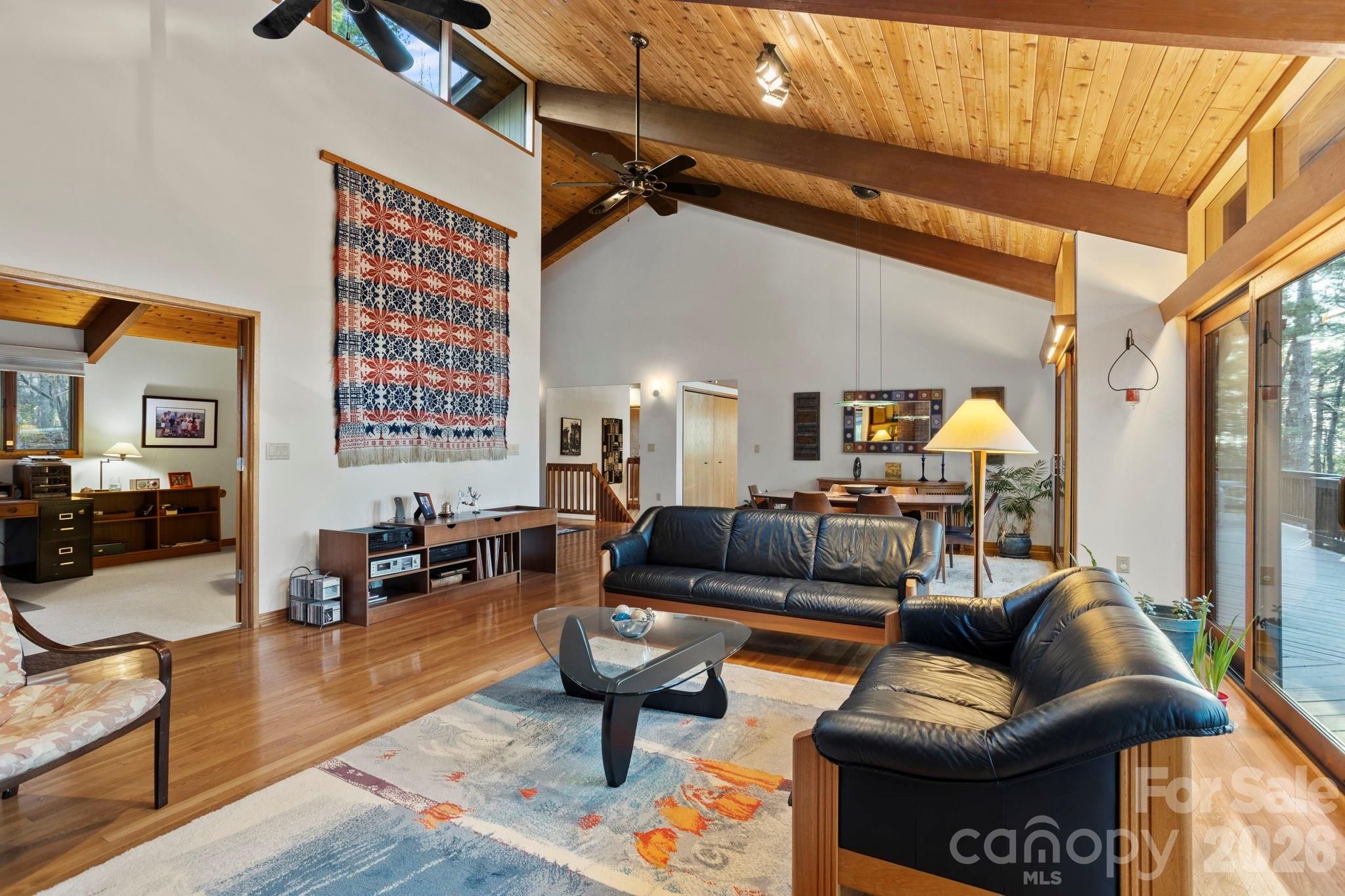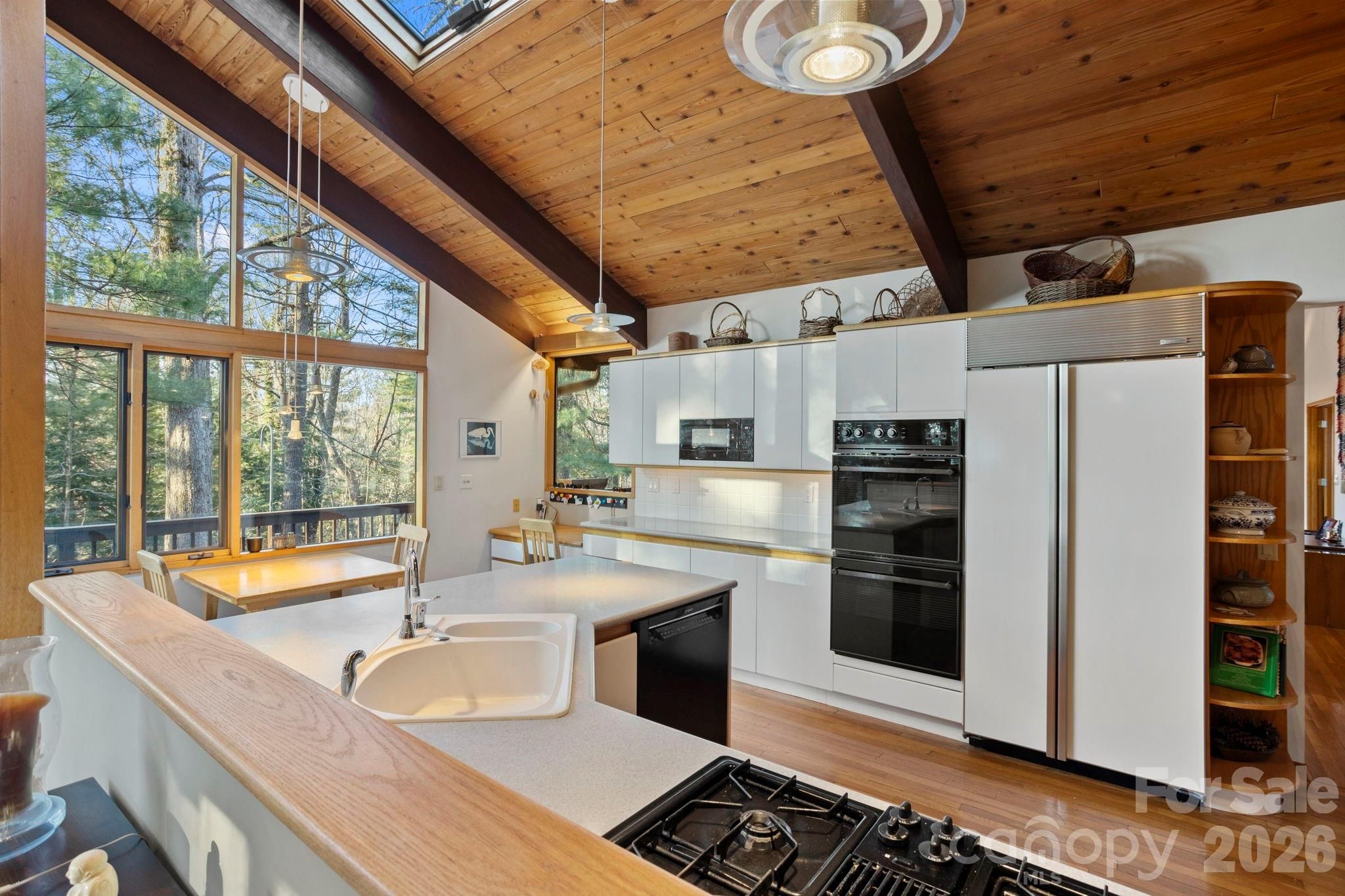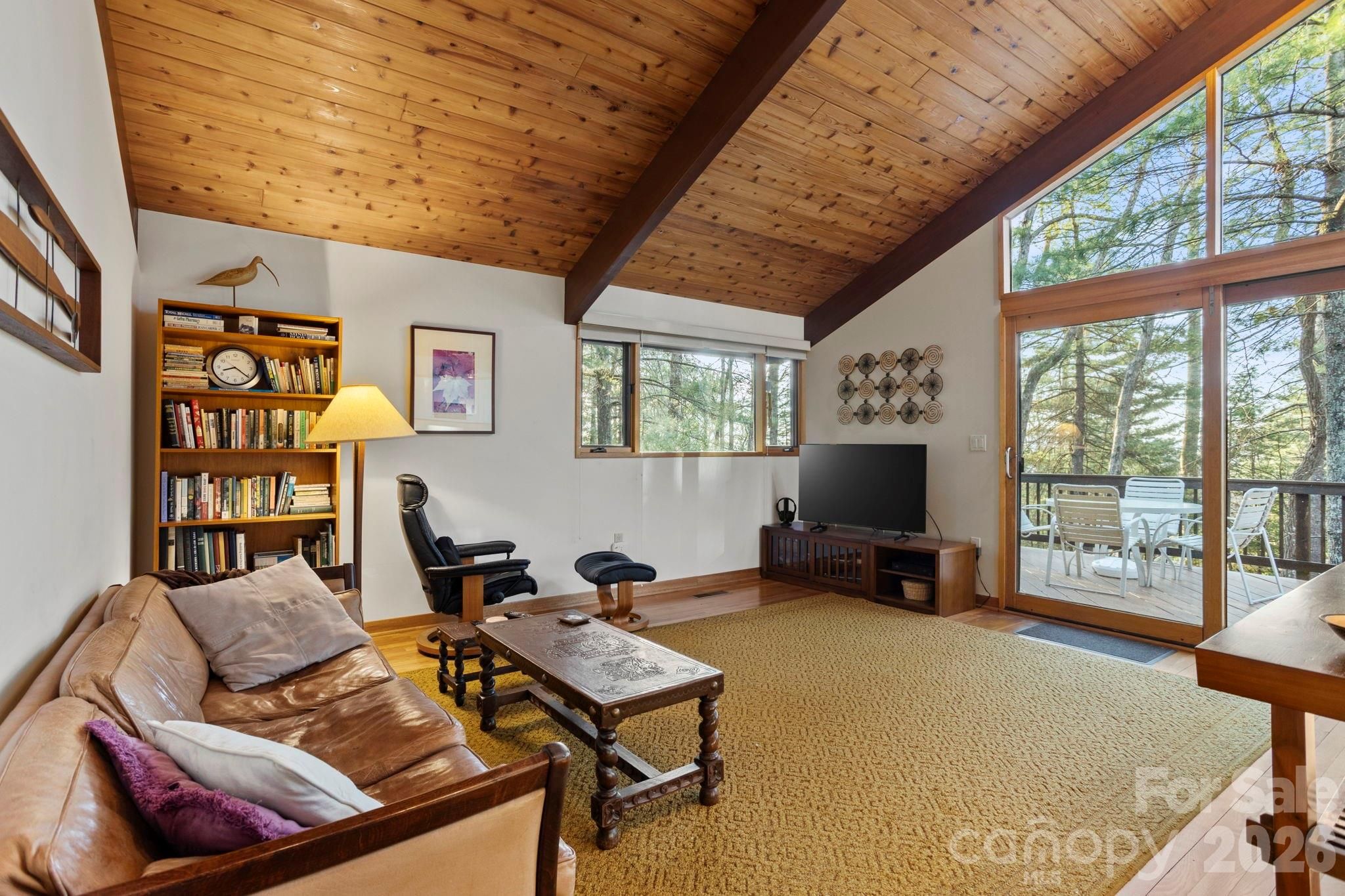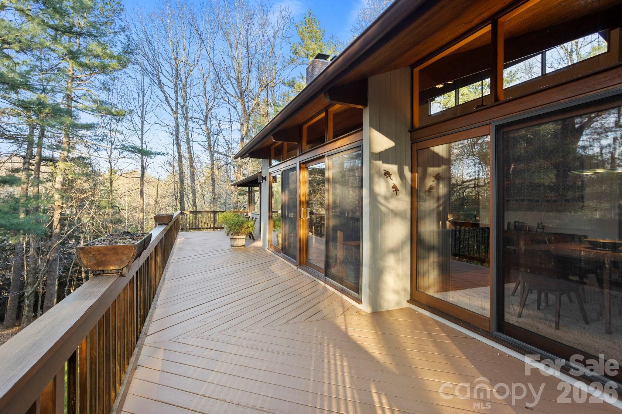 One-of-a-Kind Architectural Masterpiece in Kenmure. Exceptional and truly one-of-a-kind, this stunning residence is located in prestigious Kenmure, a gated golf course community and is perfectly situated on a private, corner lot spanning over an acre of natural wooded beauty. A level circular driveway welcomes you to this remarkable home offering both convenience and impressive curb appeal. Designed in a distinctive deck house style, this 3-bedroom, 3-bath home showcases a striking blend of modern and contemporary architecture with an expansive open floor plan. Floor-to-ceiling windows throughout flood the home with natural light while capturing serene views of the private, park-like setting. Vaulted tongue-and-groove stained wood ceilings with exposed beams and rich mahogany trim add warmth and character throughout. The main level features a welcoming foyer with a unique solid wood door opening to a dramatic great room with a floor-to-ceiling stone fireplace flanked by built-in bookshelves and a wall of glass. The great room flows seamlessly into the dining area with sliding doors leading to a spacious deck—perfect for entertaining or relaxing in nature. A large study with closet offers flexibility for a home office or additional guest space. The open layout continues into the expansive kitchen, featuring vaulted ceilings, a wall of windows, abundant counter space and an island with gas cooktop. A breakfast area and cozy den—complete with another wall of windows and access to the deck provide inviting spaces to gather and unwind. The primary suite is a private retreat with a wall of windows and a spa-like bath featuring dual vanities, a whirlpool tub, walk-in shower and generous walk-in closet. Two guest bedrooms, a full bath, and a well-appointed laundry room with cabinetry and sink complete the main level. The lower level offers a family/recreation room with a dramatic floor-to-ceiling fireplace, large sliding doors to the patio and ample space for a game or billiards area. A full bath and two large storage rooms—one ideal for a workshop—add to the home’s versatility. Enjoy the best of mountain living from the expansive deck or lower-level patio, both overlooking the beautifully landscaped, private setting. This rare property offers exceptional tranquility while being conveniently located near community amenities and the entrance gate. A truly special home offering unmatched design, privacy, and lifestyle.