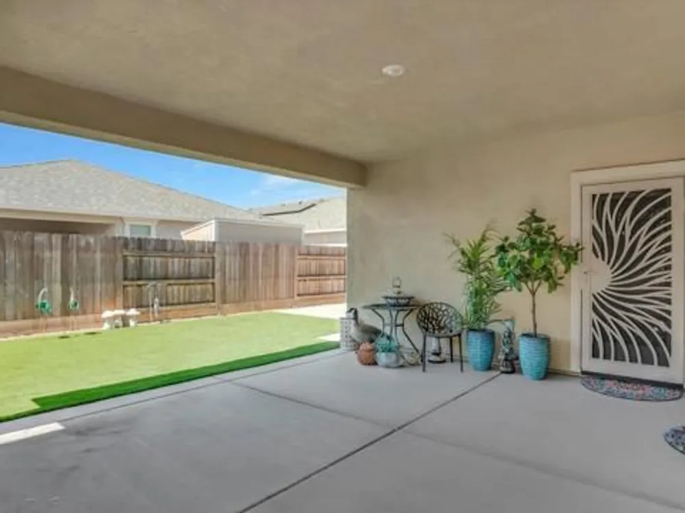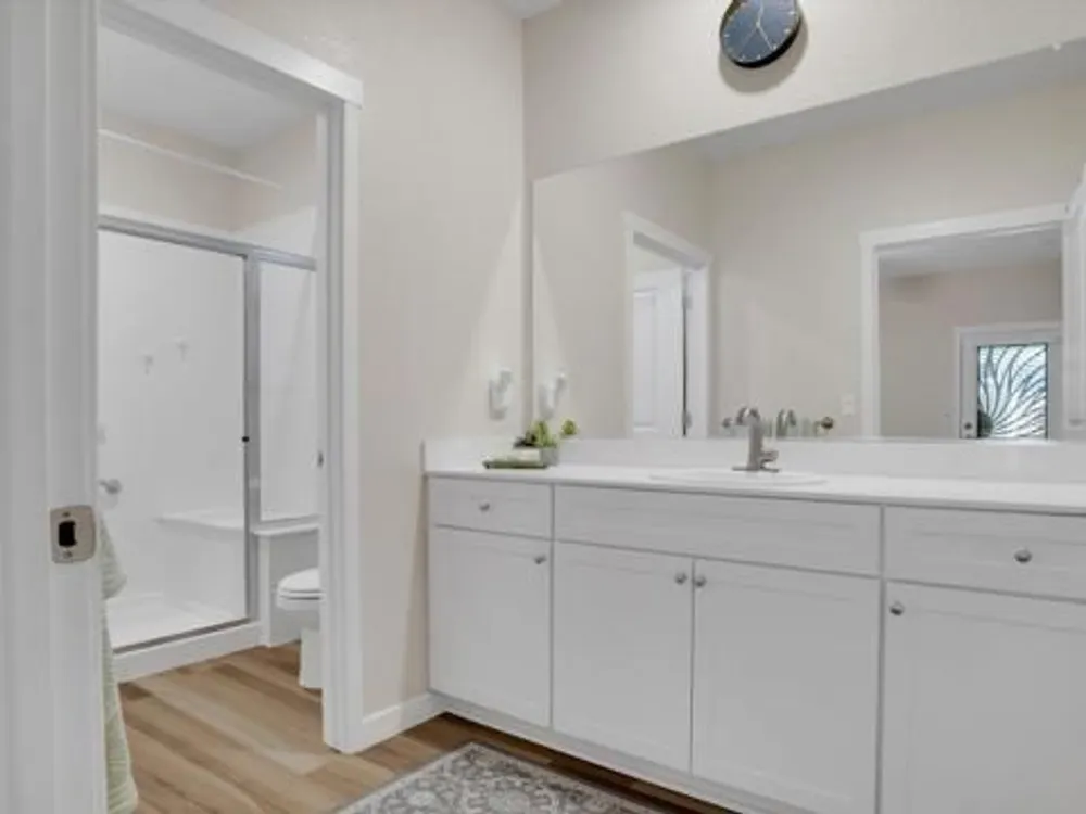 This Cooley plan is better than new with all the bells and whistles already installed for added value. You will love this well designed home with two bedrooms, two bathrooms and a den or flex space. This home is truly turn-key and move-in ready, showcasing a light and bright interior with an open floor plan and wonderful exposure. The spacious primary suite features double walk-in closets and door with decorative screen to covered patio. Enjoy a chef-friendly kitchen and great room enhanced with a glowing electric fireplace hutch and slider to large covered patio. Step outside to a professionally installed, low-maintenance landscape complete with a storage shed. You will also find a decorative screen door to garage and shaded windows for year-round comfort. Energy efficiency abounds with OWNED solar and a high end whole-house water purification system. An oversized garage provides ample space for vehicles, storage, or hobbies. Perfectly blending comfort, style, and practicality, this home is a true retreat. Don’t miss the opportunity to own this beautifully maintained property in the gated Summit at Liberty 55+ community. Enjoy the outdoor resort style pool and gym, clubhouse and events barn, community garden and more.