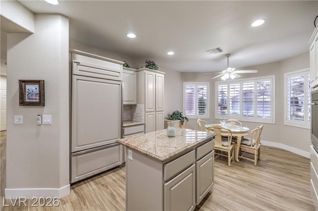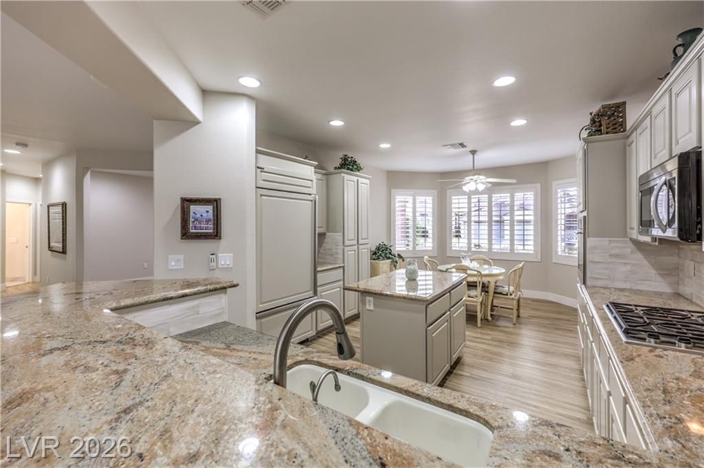 Updated Cambridge floorplan on premium elevated lot with mountain views! Island kitchen boasts granite countertops, upgraded cabinets, breakfast bar, pantry, nook with ceiling fan & bay window, recessed lighting, R/O system, Sub-Zero refrigerator, built-in Wolf oven & gas cooktop, microwave, & dishwasher. Relax in the spacious great room with ceiling fan, gas fireplace, laminate wood flooring, & French doors to the backyard, plus a formal dining area. Owner’s suite includes a ceiling fan, sitting area, walk-in closet, and remodeled bathroom with walk-in shower, raised vanity w/ quartz countertop, and dual sinks. Secondary bedroom w/ ceiling fan. Den w/ ceiling fan and recessed lighting. Secondary bathroom w/ raised vanity and shower. Plantation shutters, whole house water filtration system, custom two-tone paint, upgraded baseboards, security door, laundry room w/ utility sink, cabinets, washer & dryer. Covered patio with extension. Located in Sun City Anthem, a premier 55+ community!