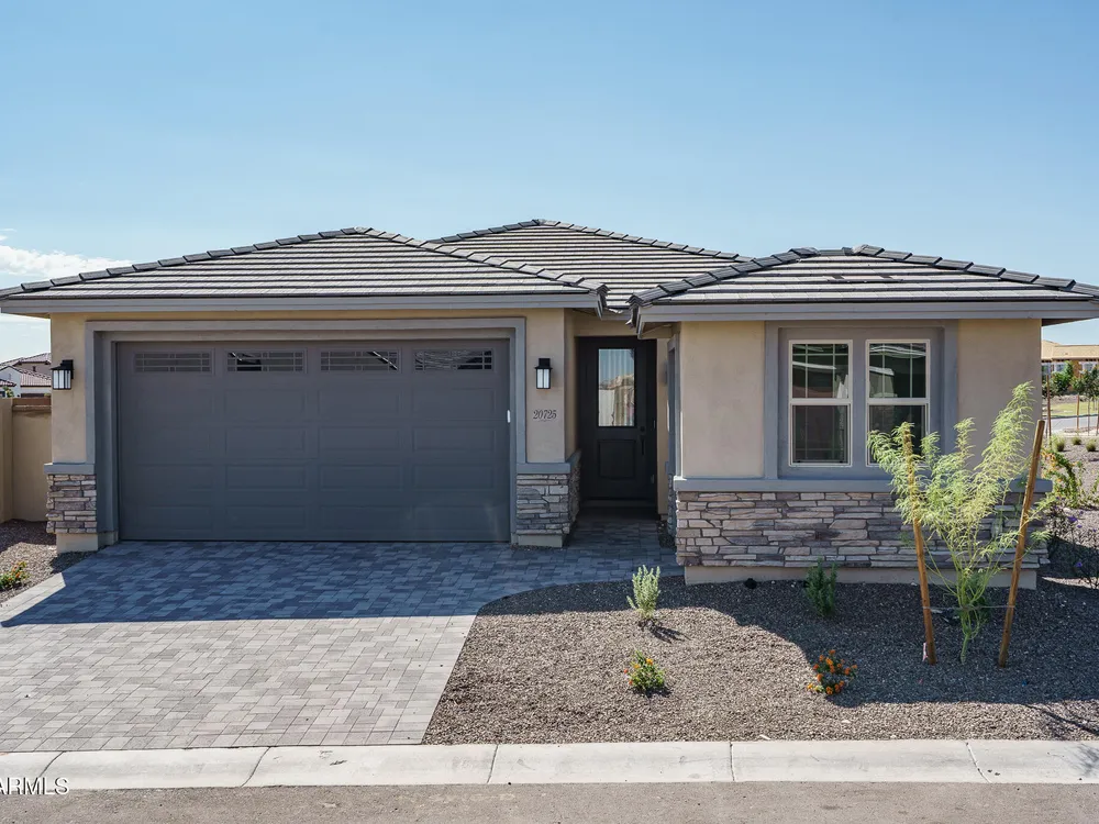 A single-level home plan spanning 1,843 sq. ft. featuring 2 bdrms, 2.5 baths, & a den. Enjoy indoor-outdoor living with an extended outdoor space and a 12' sliding glass door. The detached golf cart garage, along with a 4' extension on the 2-car garage, offers added convenience. The heart of the home boasts a perfect kitchen for entertaining, complete with an oversized island, Quartz countertops, walk-in pantry, & a morning kitchen. Elegant 9''x35'' faux wood tile is featured in all the right places, with carpet in the bedrooms. The owner's suite includes a spacious walk-in closet, dual vanities, and a zero-step walk-in shower with tile surround. Energy-efficient features include a tankless hot water heater, spray foam insulation, and Water Sense plumbing throughout. Welcome Home.