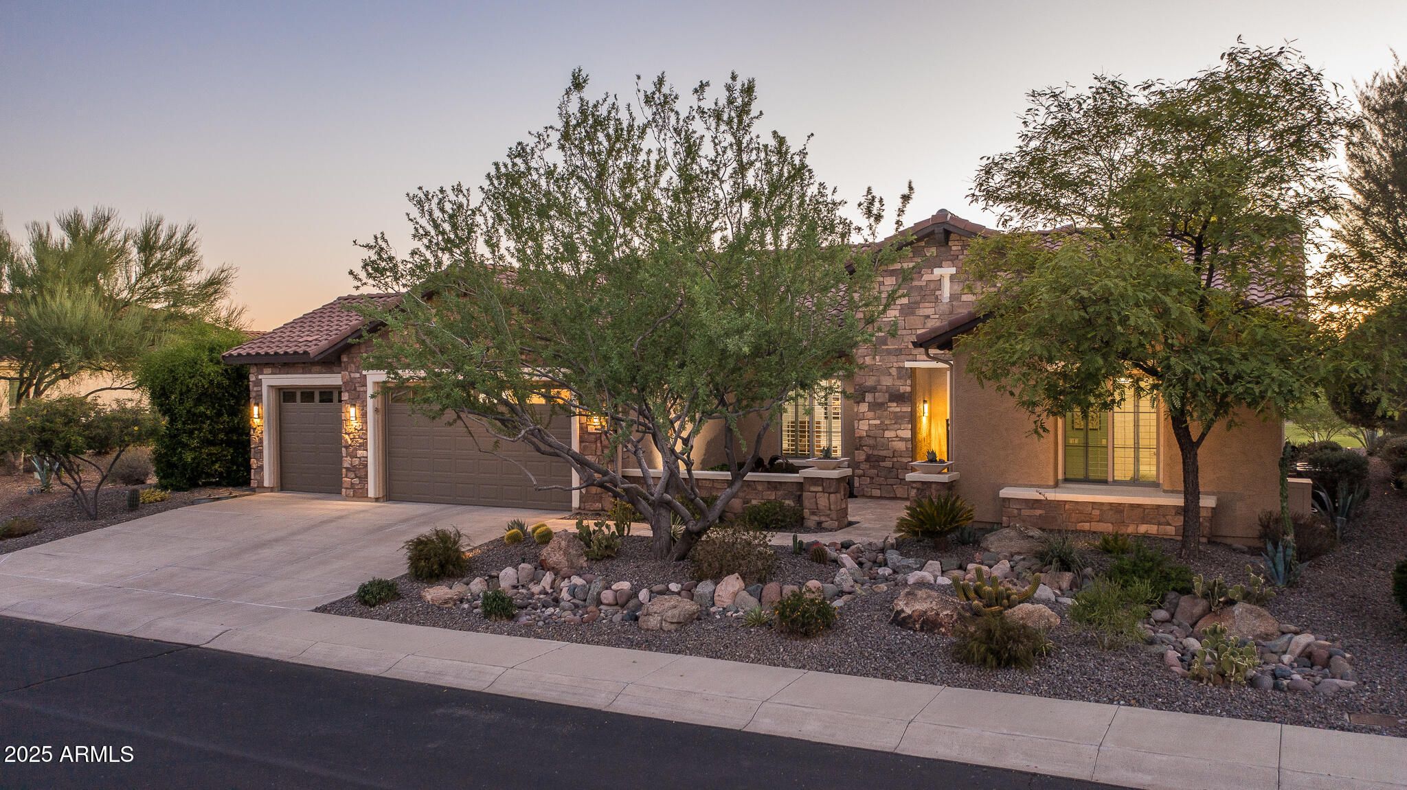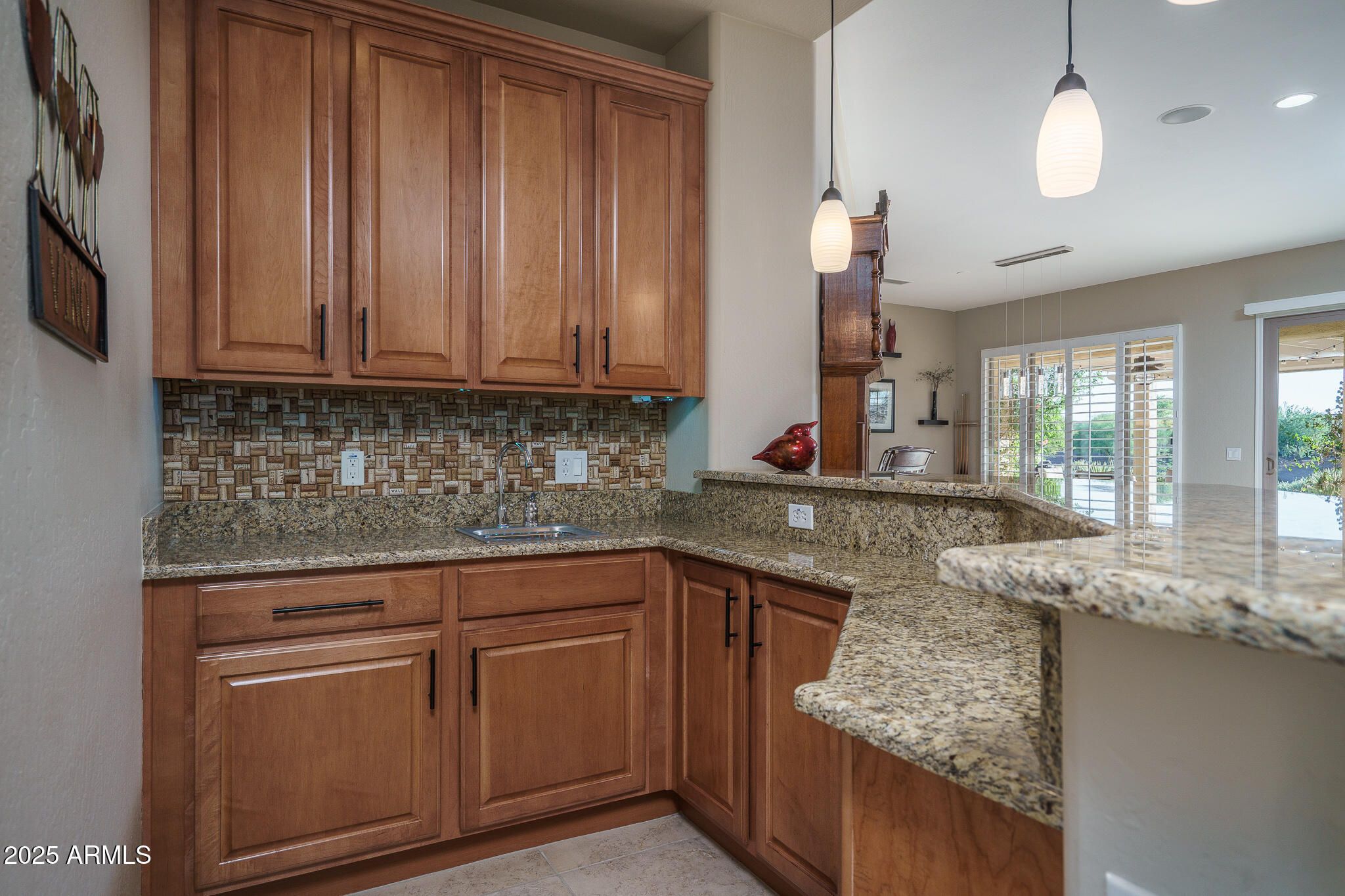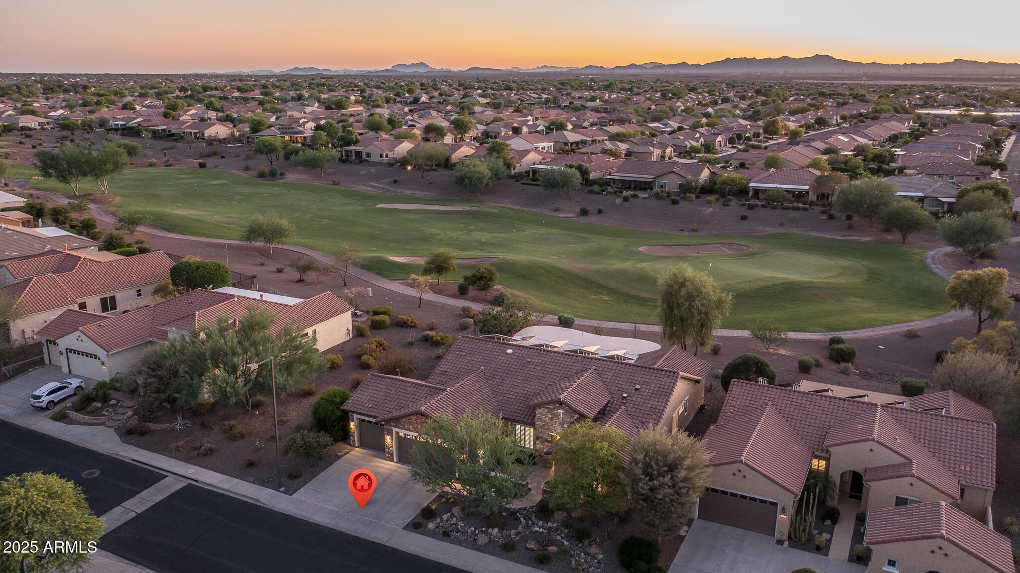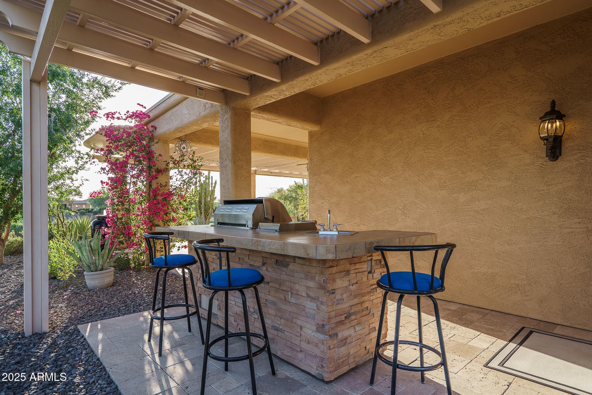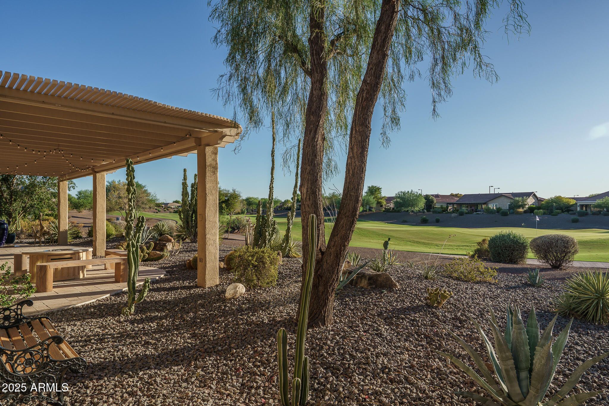 Welcome to your dream home. This popular ''PARADA'' model is highly upgraded and remodeled. Located on a premium golf course lot overlooking the 4th green of the Lakes Course and adjacent to a large serene common area is a MUST SEE. This sparkling clean original-owner residence offers refined desert living with 2 bedrooms, a versatile den with opaque glass French doors and a Murphy bed, and 2.5 baths across a spacious 2,527 square feet. Step into the open-concept great room, perfect for entertaining, featuring a stacked stone feature wall, decorative fireplace, surround sound, and a wet bar. The gourmet kitchen is a chef's delight with rich maple cabinetry, granite countertops and backsplash, stainless steel appliances including a gas cooktop, wall oven, convection microwave, pull-out shelves, under-cabinet lighting, and a walk-in pantry. A 18" solar tube adds natural light, and the extra cabinetry in the casual dining nook provides ample storage. Enjoy seamless indoor-outdoor living with an expansive covered patio finished in travertine pavers, complete with ceiling fans, a built-in outdoor kitchen featuring bar seating, bbq grill, sink, and refrigerator covered with a pergola. The beautiful desert landscaping features citrus trees, low-voltage lighting, and breathtaking golf course views. The huge primary suite is a private retreat with an en-suite bath featuring dual sinks, tiled backsplash, a walk-in roman rain shower, walk-in jetted tub, and a walk-in closet with a solar tube. The guest suite offers its own en-suite bath and walk-in closet, while the den includes a Murphy bed for added 3rd bedroom flexibility. Additional highlights include plantation shutters throughout, custom powder room wood ceiling with solar tube, laundry room with upper/lower cabinets and sink, stone exterior elevation, tankless water heater & recirculating pump. This house also features owned 6.4 Kw. solar panels for energy savings, 3-car garage with vinyl tiled floor, builtin cabinets, overhead storage, back yard access and new high efficiency furnace and a/c systems. Enjoy world-class amenities at the Sage and Saguaro Recreation Centers, including pools, spas, fitness centers, indoor walking track, aerobics and dance studios, tennis and pickleball courts, and a Troon-managed 27-hole golf course with a restaurant.