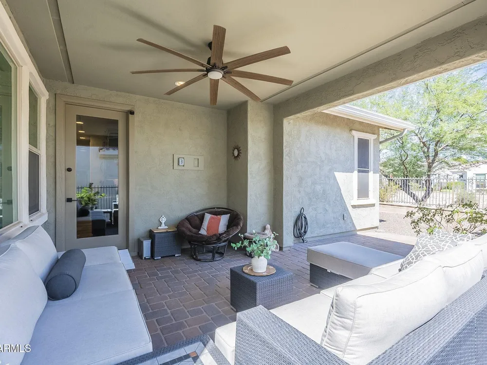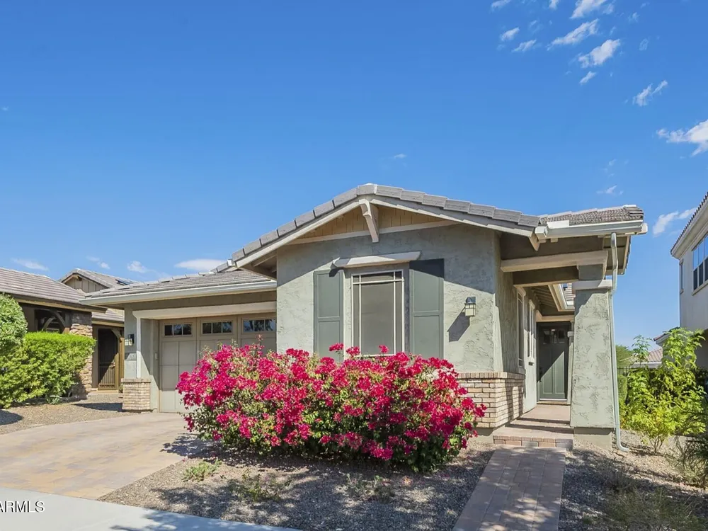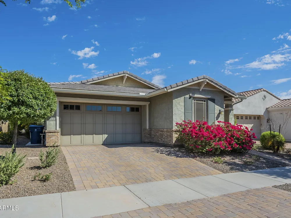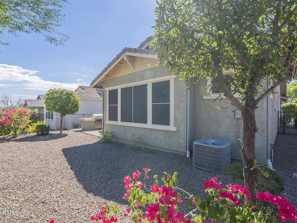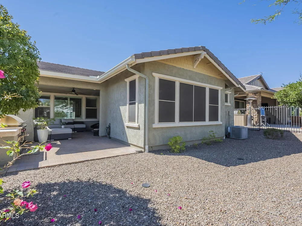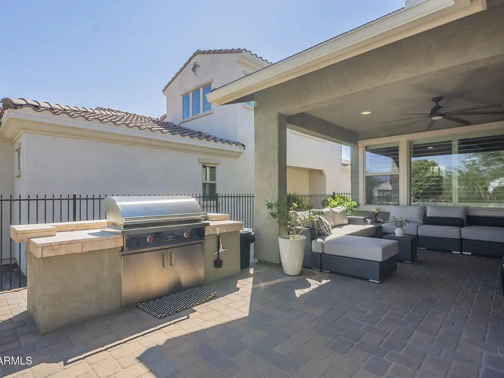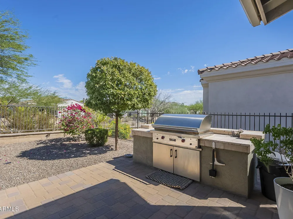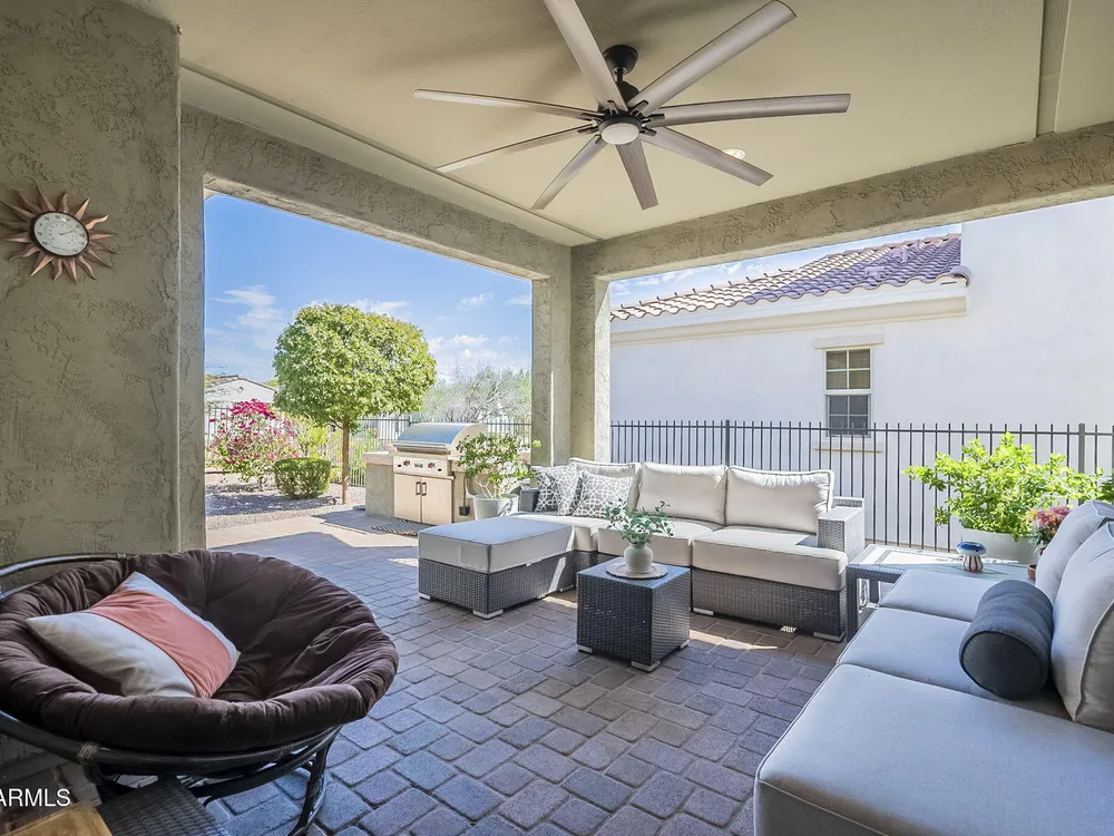 Premier 55+ community of Victory at Verrado 3 bed/2 bath home! Enjoy resort-style living with golf, pickleball, tennis, dining, pools, fitness, spa, & endless outdoor activities. Well-maintained home offers new interior paint, landscaping system, & refrigerator. Inside features 10-ft ceilings, 9-ft doors, large windows with plantation shutters, and timeless finishes. Open kitchen with gas stove, double wall ovens, granite counters, and oversized island. Spacious Primary Suite with dual sinks, glass shower, and walk-in closet, split from guest bedrooms. Entertain outdoors with an extended paver patio, built-in gas infrared BBQ, view fencing backing to a walking path, and stunning White Tank Mtn views. Perfect low-maintenance lock-and-leave home or year round active lifestyle living!
