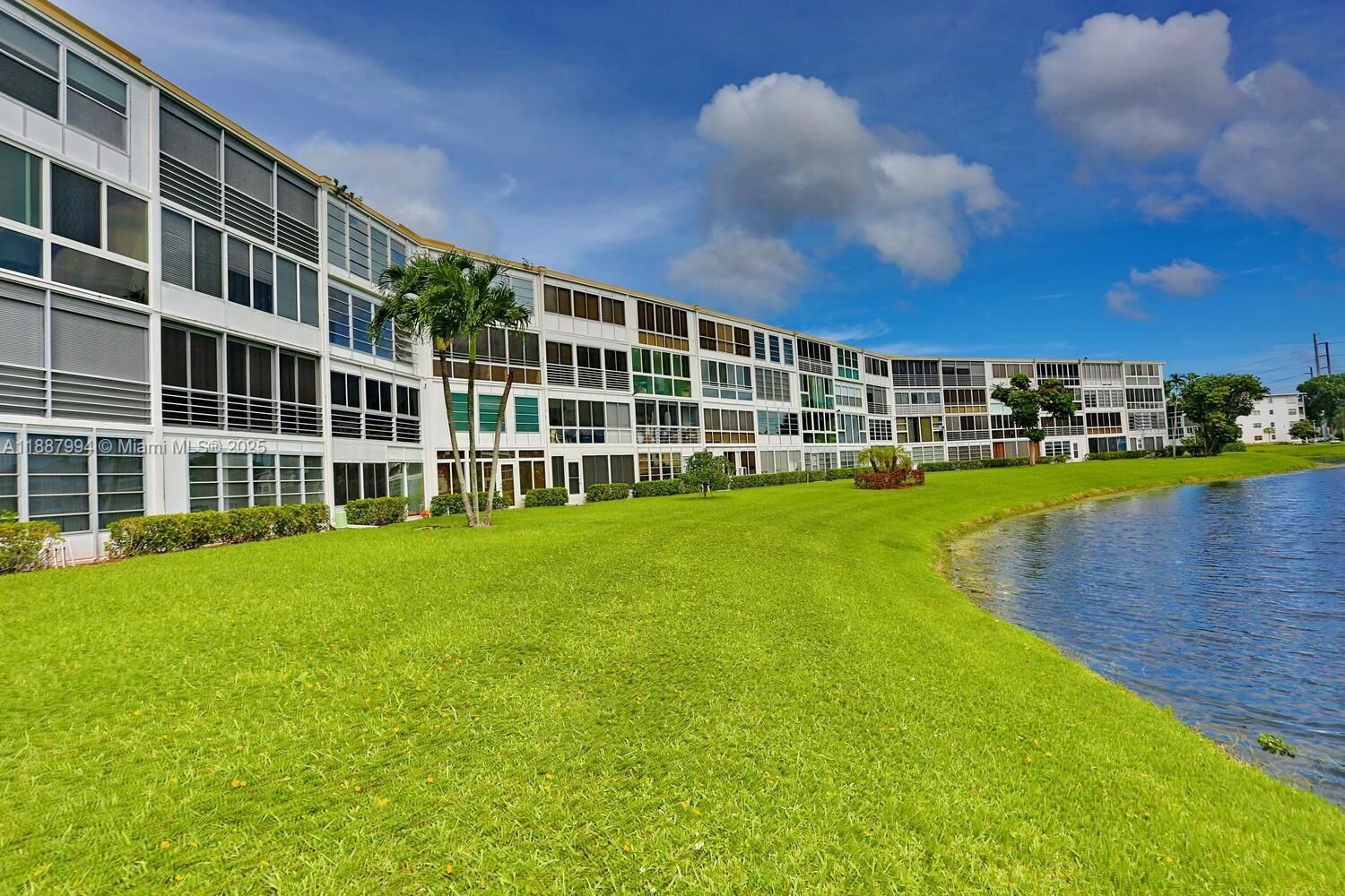 55+ Bright and spacious 1 bedroom 1 1/2 bath unit in a resort style community! Large, enclosed balcony with a serene lake view. Fully hurricane protected home with the shutters for all windows and an impact front door gives you a piece of mind either you live here year around or a winter resident! Other updates include new wood flooring, an electric panel, and a shower. Lots of storage space! Well maintained building with a plush landscape around. Century Village is an active community with 18 pools, tennis courts, biking/jogging pass, gym, theater, community shuttles, and so much more. 15 min to the beach. OWNER FINANCING may be considered