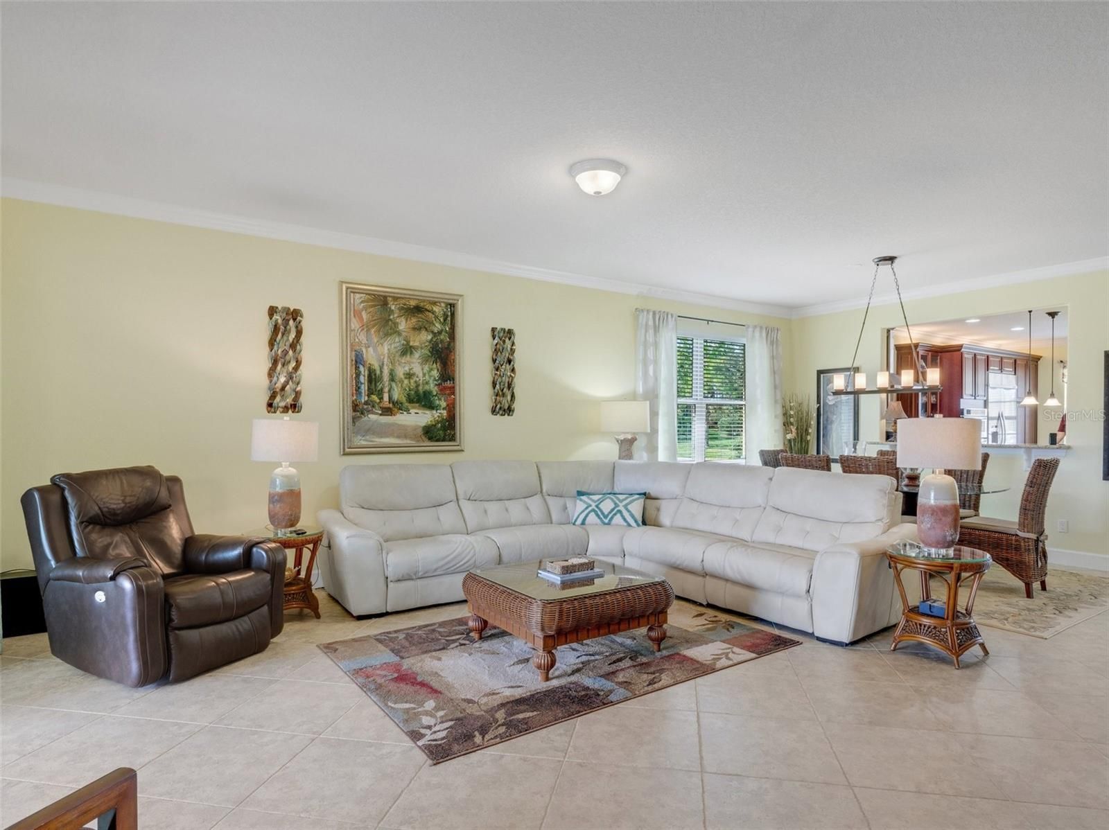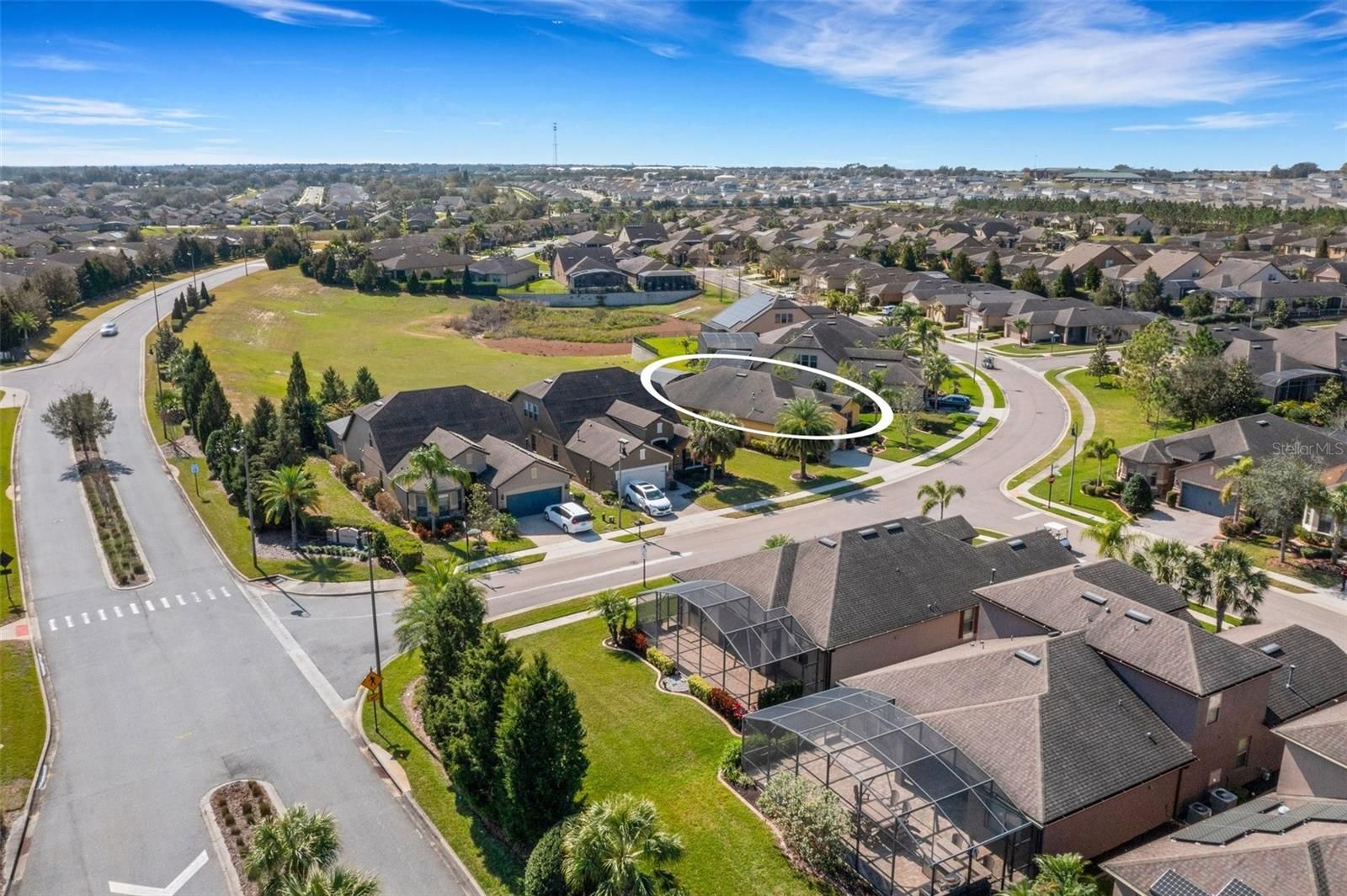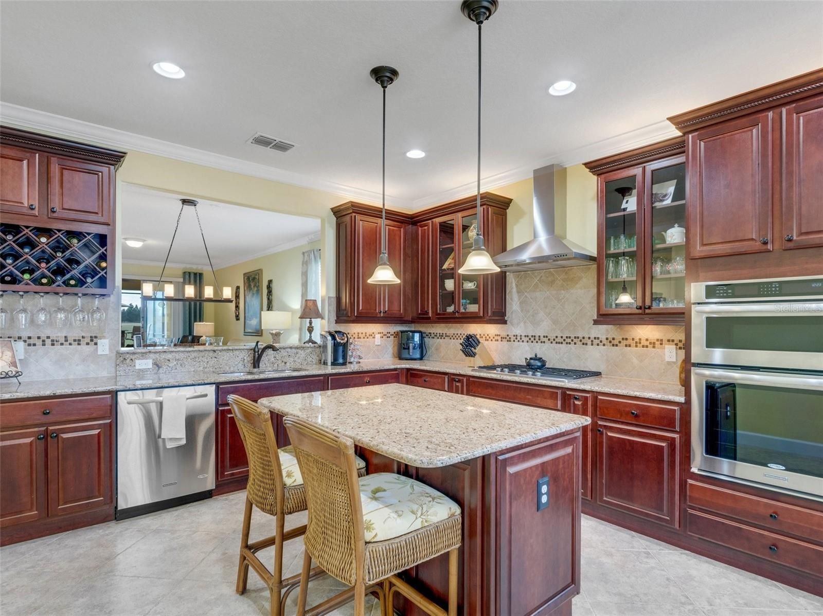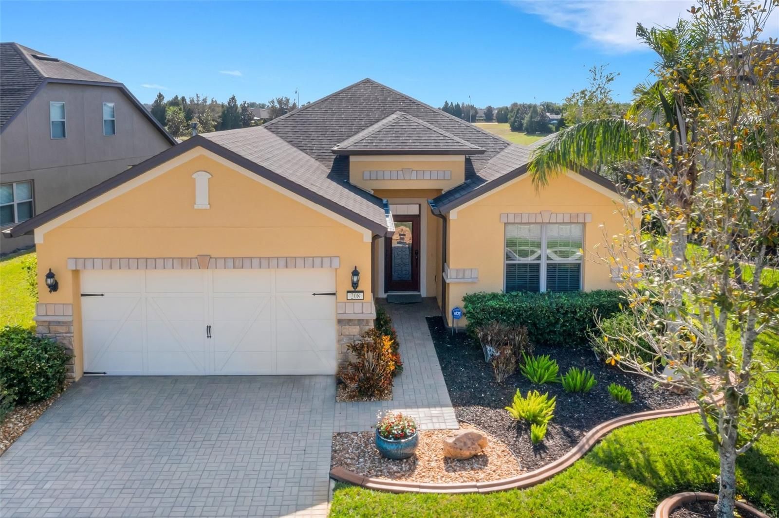 Located in the resort style 55+ community of Del Webb Orlando with a great view and NO REAR NEIGHBORS. This Willow Bend model has 2 bedrooms, plus a den that can easily be used or converted as a 3rd bedroom and two bathrooms. The large GOURMET kitchen features granite countertops, stainless steel upgraded KITCHEN AID appliances, a Natural Gas cooktop, a Built-in microwave and a built-in oven, 42” cabinets with crown moulding and under and over cabinet lighting, a spacious cabinet pantry, designated spice cabinet, an island for extra prep area and an eat in area. The spacious primary bedroom is in the rear of the home for owner privacy and has a beautiful view of the lanai and beyond and features new flooring. The primary bathroom suite includes two sinks, granite countertops, a linen closet, a tiled shower with glass doors, a tub and an expansive walk-in closet. The guest bedroom includes a large walk-in closet. From the living room you walk through large glass sliding doors into your covered lanai with an extended screened cage. The spacious lanai is perfect for relaxing and entertaining and features a stone outdoor kitchen with DCS barbeque, refrigerator, and granite countertops. The lanai also has U.V screening, blinds and recently cleaned and sealed pavers. The laundry room has additional cabinets for storage, a counter and a utility sink. The OVERSIZED 4’ EXTENDED garage has overhead storage, epoxy flooring and a new Bluetooth garage door opener. The additional home upgrades include crown molding, rounded drywall corners, ceramic tile on the diagonal in living areas, upgraded interior doors, alarm system, Rachio irrigation system, NEW HVAC (2023), NEWLY PAINTED interior and exterior. The exterior of the home includes a paver driveway, landscaping including concrete landscape curbing and gutters. The $277 monthly Del Webb HOA fee includes exclusive access to resident-owned 30,000+ SF Montecito clubhouse and amenities. DEL WEBB ORLANDO is a 55+ community with a tavern, indoor walking track, fitness center, indoor and outdoor pools and spas with locker rooms and showers, billiards, ping pong, craft room, and a ballroom for special events. Outdoor activities include pickleball, tennis, bocce, basketball, shuffleboard, community gardening center, an outdoor amphitheater, large brick fire pit and large screened-in gazebo over the water. The $425 semi-annual HOA fee provides 24x7 staffed security gate and master association-owned private road maintenance. Adjacent to recently renovated 18-hole White Heron Golf Club. Miles of biking and walking trails within Ridgewood Lakes gated community. Located conveniently to shopping at Posner Park (4 miles), Disney World, Universal Studios, Orlando & Central FL entertainment nearby. Easy access to I-4, medical facilities, airports & Sunrail Station. Advent Health hospital is 3 miles away.
