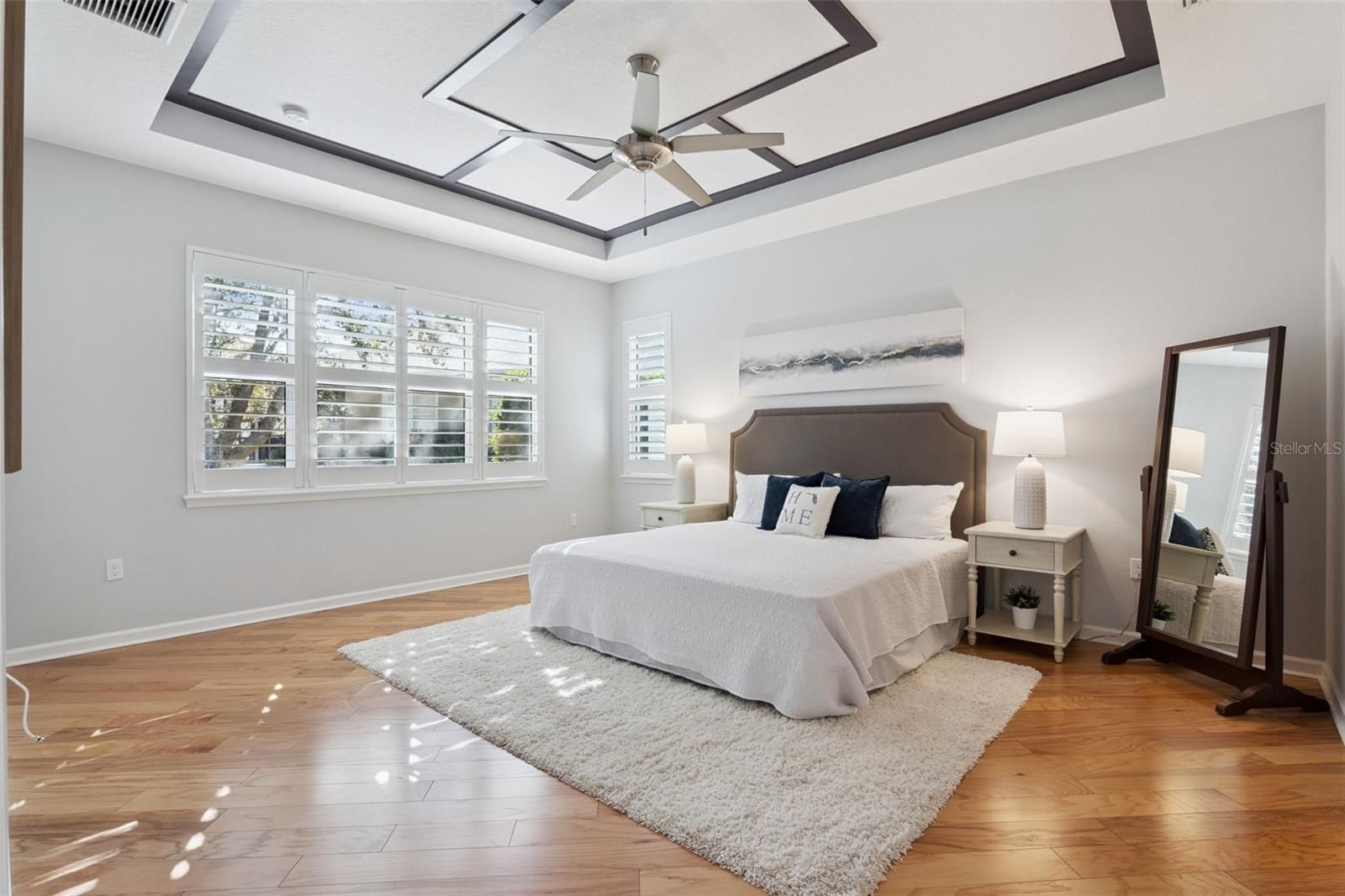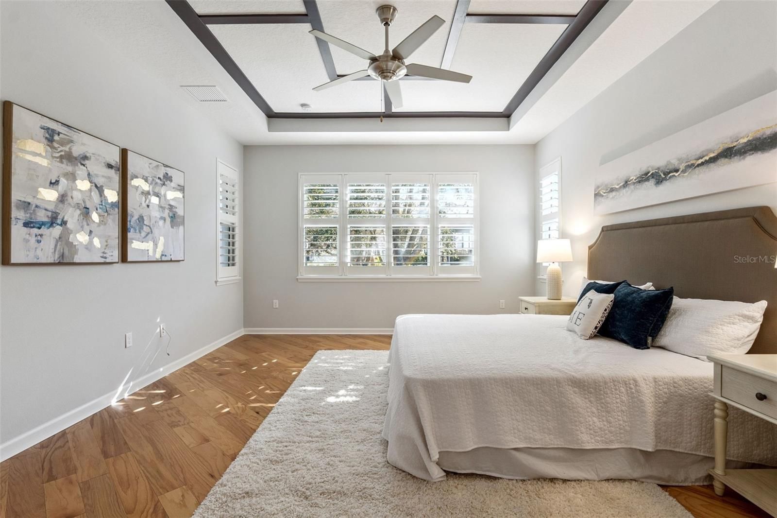 - Built-in Features, Ceiling Fan(s), Crown Molding, Open Floorplan, Main Level Primary, Solid-Wood Cabinets, Split Bedrooms, Stone Counters, Thermostat, Tray Ceiling(s), Walk-In Closet(s), Window Treatments