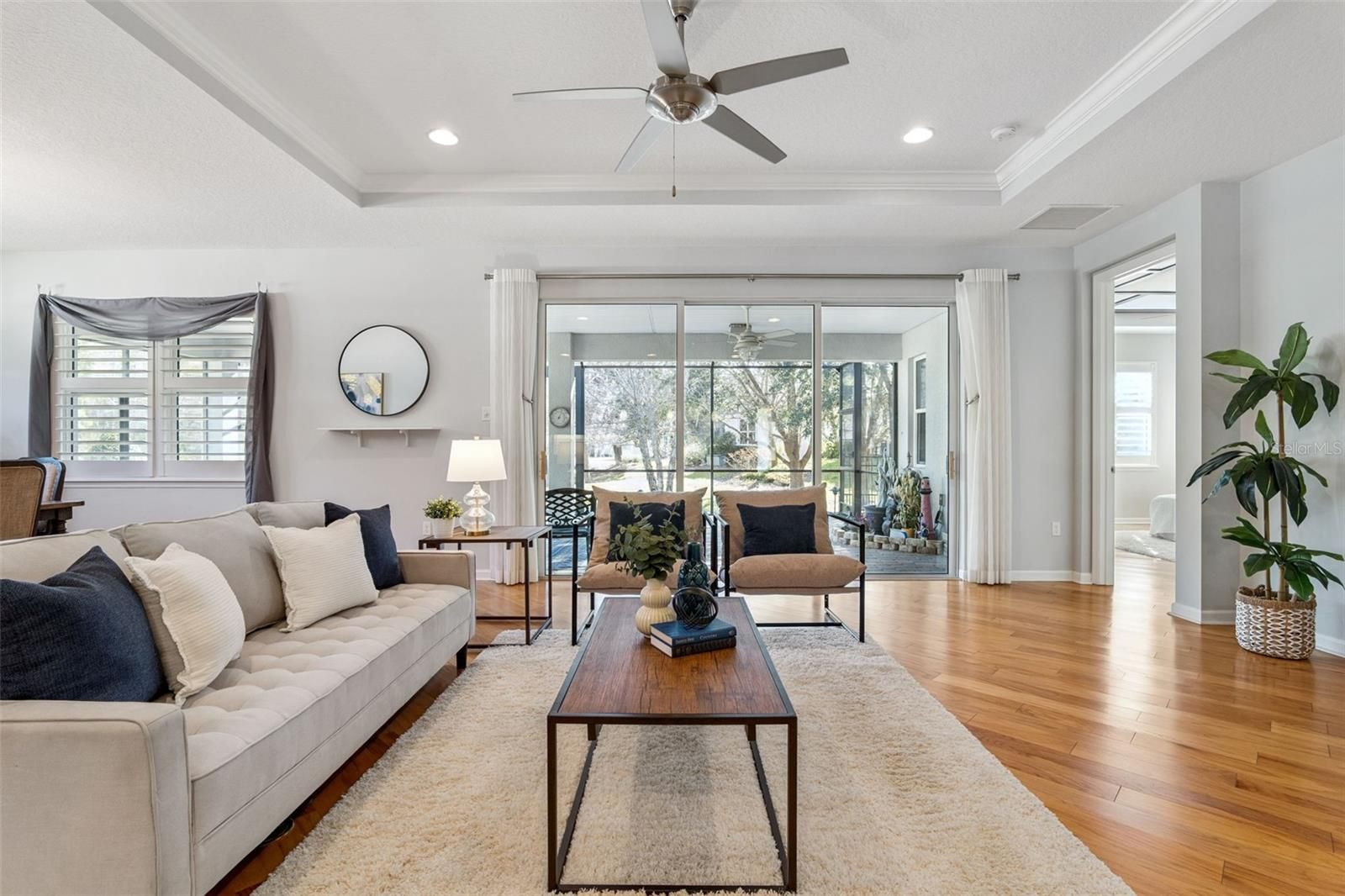 Welcome home to this beautifully maintained 2018 Kolter Hickory with a 3-car garage, whole home natural gas generator, tankless natural gas water heater, partially fenced backyard & a fantastic Pond & Conservation area view nestled in the desirable 55+ Victoria Gardens neighborhood. With 3 bedrooms, 3 baths, a versatile Den, this home offers both comfort and style. Enjoy peaceful mornings on your 34’ x 23’ brick paver screen enclosed covered patio overlooking a scenic view with mature trees. Inside, you’ll find elegant engineered wood and porcelain tile floors, tray ceilings, crown molding, leaded glass front door, Plantation style shutters, Double Pane windows, and abundant natural light. The chef’s kitchen is ready for gatherings, with 42” Mocha cabinetry w/ crown molding, under cabinet lighting, tile backsplash, built-in wall oven & microwave, 4-burner natural gas cooktop, range hood, Pull-out shelving, Quartz countertops, spacious island w/ pendant lighting above, water filtration system & stainless-steel appliances. The 14’6” x 17’ primary suite is a relaxing retreat with wood flooring, a generous walk-in closet, tray ceiling with wood moldings & a ceiling fan. En suite bathroom has a large glass enclosed walk-in shower w/ corner bench seat & two separate granite countertop vanities. Third bedroom offers a walk-in closet, en suite bathroom with walk-in shower & a sliding glass door enclosure. Utility room comes with a laundry tub, storage cabinets, washer & a natural gas dryer. In the evenings relax or entertain on your spacious screen enclosed covered patio with 2 ceiling fans, ceiling mounted speakers & a seldom found Pond & conservation area view for the neighborhood. The 27’6” x 21’ garage features an epoxy floor, 30 amp/125V recreational vehicle outlet, attic pull-down stairs with partial wood flooring, an additional refrigerator, perfect for all your needs. ALL appliances stay with the home. Victoria Garden residents have access to their own social Private Clubhouse. HOA fee includes lawn care, Spectrum HFC TV & internet and reclaimed water for yard irrigation and access to all community amenities. Community is within 1 mile of I-4 that offers great access to the east coast beaches, Orlando (40 minutes) and 3 International airports within 1 hour.