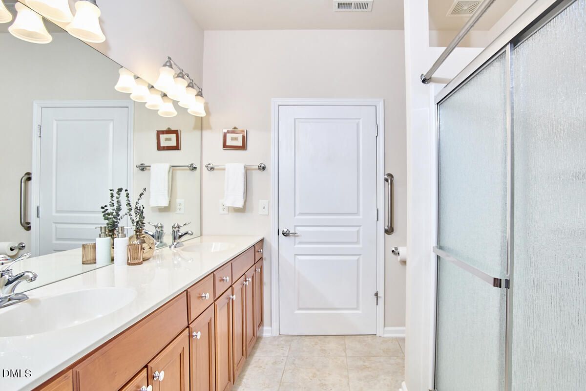 Spring has sprung in award-winning Carolina Preserve! This Pine Spring model is within walking distance of Bradford Hall, the heartbeat of this 55+ community, with indoor and outdoor swimming, tennis, pickleball, clubs, classes, and events to suit all interests. This well-maintained home offers a host of features - open floor plan, wood floors in the main living area, newer carpeting in bedrooms, generous ensuite with ample walk-in closet and large shower, light-filled sunroom, updated water heater and HVAC, tree-lined patio with retractable awning, garage with built-in cabinets, workspaces and interlocking tiled flooring. Refrigerator, washer, and dryer convey with property. All this on a quiet cul-de-sac street! See it for yourself soon!