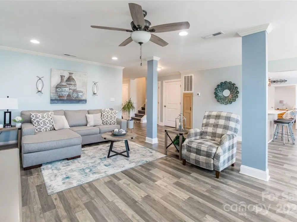 Amazing "waterview" location on the shores of Lake Norman! This extended family home is in the LakeWalk community w/amenities like club house, cabana, dog park, outdoor pool, playground, recreation area, sidewalks, & walking trails! Main level features gleaming laminate wood flooring, DR w/chair rail, wainscot below, ceiling beams, & crown molding. Great open floorplan w/2 story GR w/ 2-story stacked stone gas log fireplace & lots of windows for natural light! Kitchen features an abundance of cabinets, large island w/barstool seating, double wall gas oven, gas cooktop with built in microwave above, and tile backsplash! Primary bedroom on the main w/tray ceiling & ceiling fan, ensuite with tile flooring, dual vanities, large walk in shower w/tile surround and separate garden tub! Upstairs hosts a bonus flex space, 4BRs, 3BAs, & laundry room. Fully finished basement w/2nd kitchen, 2 BRS, living room, 2nd laundry area, and flex space. Stunning salt water pool, Techo Bloc pavers landscaping and coyote grill outside! This is a fantastic multigenerational home!