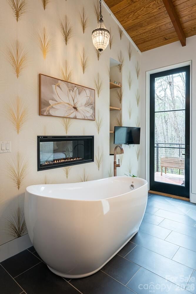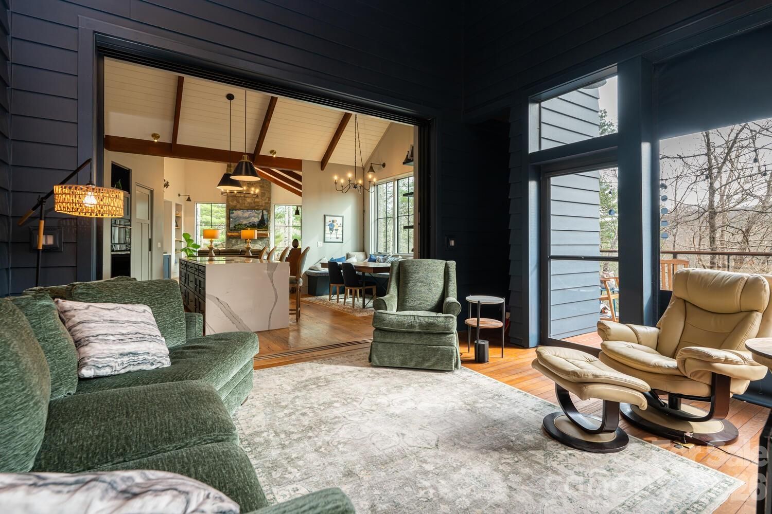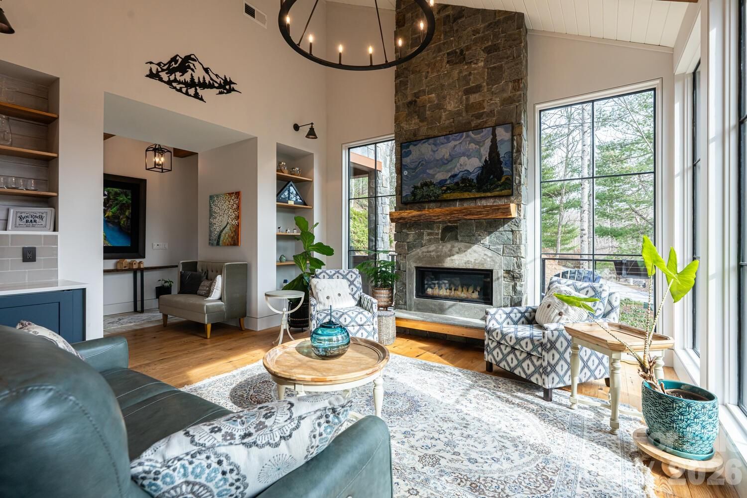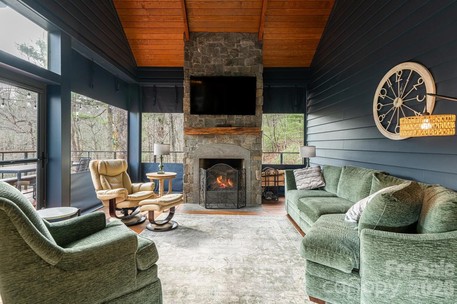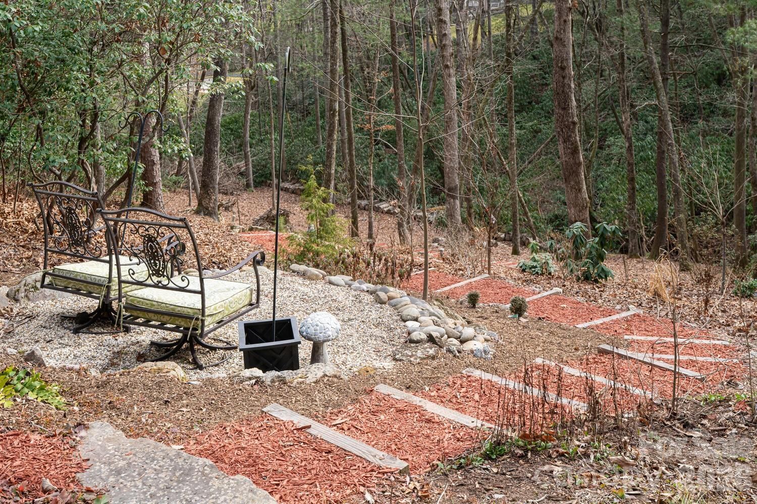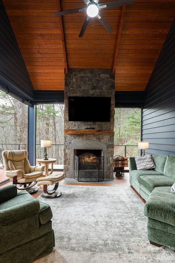 Luxury mountain living at its finest in this one-level, stunning architecturally designed home, perfectly situated on 2.4 private acres with stream at the end of a cul-de-sac in prestigious Kenmure, a gated golf course community. This truly one-of-a-kind residence showcases exceptional design, craftsmanship, and materials rarely found—inside and out. A long, completely level driveway leads to this architectural masterpiece, beautifully positioned on a gorgeous wooded lot. The exterior features Hardie artisan siding and stone with mitered corners, supported by 12 steel beams embedded into granite, reflecting the thoughtful engineering and quality throughout. The inviting foyer opens to one of the most impressive open floor plans imaginable. Highlights include heated floors throughout, Z track molding, 8- and 9-foot doors, soaring vaulted ceilings, oak wood ceilings with beams, floor-to-ceiling windows, and curated designer lighting and finishes at every turn. The expansive great room features a dramatic floor-to-ceiling stone gas fireplace with reclaimed oak mantel, soapstone hearth, custom built-ins, and a wet bar with beverage refrigerator—ideal for entertaining. The space flows seamlessly into the dining area and professionally designed gourmet kitchen. The chef’s kitchen is equipped with a massive quartz island with waterfall edge and breakfast bar, Wolf appliances, including a steam oven, convection oven, induction cooktop, double drawer dishwasher and sub-zero refrigerator/freezer. A show-stopping walk-in pantry offers floor-to-ceiling cabinetry, pullouts, and a built-in sliding ladder. The open dining area features custom banquette seating, perfect for gatherings large and small. Just beyond the kitchen is the all-season room/screened porch with a motorized screen system, allowing year-round enjoyment. A wood-burning fireplace with gas starter creates a cozy setting to relax while taking in the serene wooded views—open even in winter for true indoor-outdoor living. The luxurious primary suite is a private retreat, featuring vaulted oak ceilings with beams, a designer walk-in closet with custom built-ins, and a see-through gas fireplace shared with the spa-like bath. The bath offers heated tile floors, a zero-entry shower with dual shower heads, a custom one-piece extended vanity, heated towel rack and freestanding soaking tub. The laundry room is conveniently located adjacent to the primary suite and includes a washer and dryer, folding station, sink, and a heated dog-washing station. A beautifully appointed powder room features imported Italian tile and custom cabinetry. Two guest bedrooms share a Jack-and-Jill bath, also finished with Italian tile, custom cabinetry and European toilets. A flexible bonus space currently used as a children’s bunk room offers additional storage or multi-purpose use. Outdoor living is exceptional, with multiple deck areas—including one with a six-person hot tub, a cozy covered deck, and walking paths throughout the property. One pathway leads directly to the 17th signature hole of the golf course, with a short walk to the country club and amenities. Additional features include an extra-wide and deep three-car garage providing ample storage and workspace. Conveniently located just three minutes from the front gate and Kenmure’s amenities. This high-end, designer home is a rare architectural masterpiece—truly unlike any other.