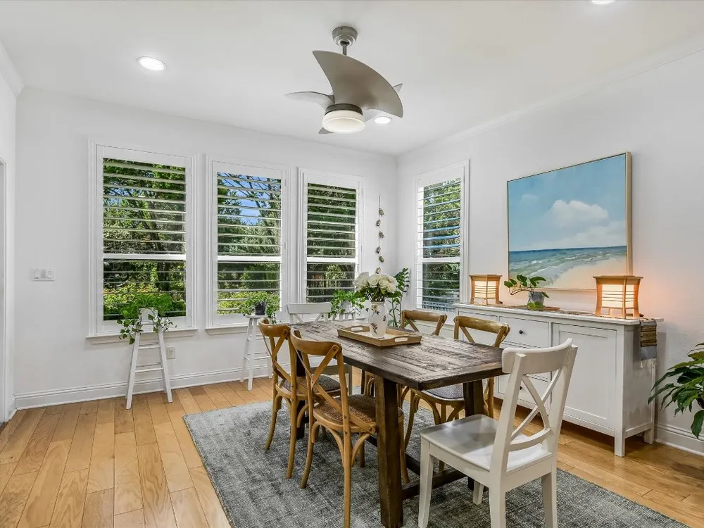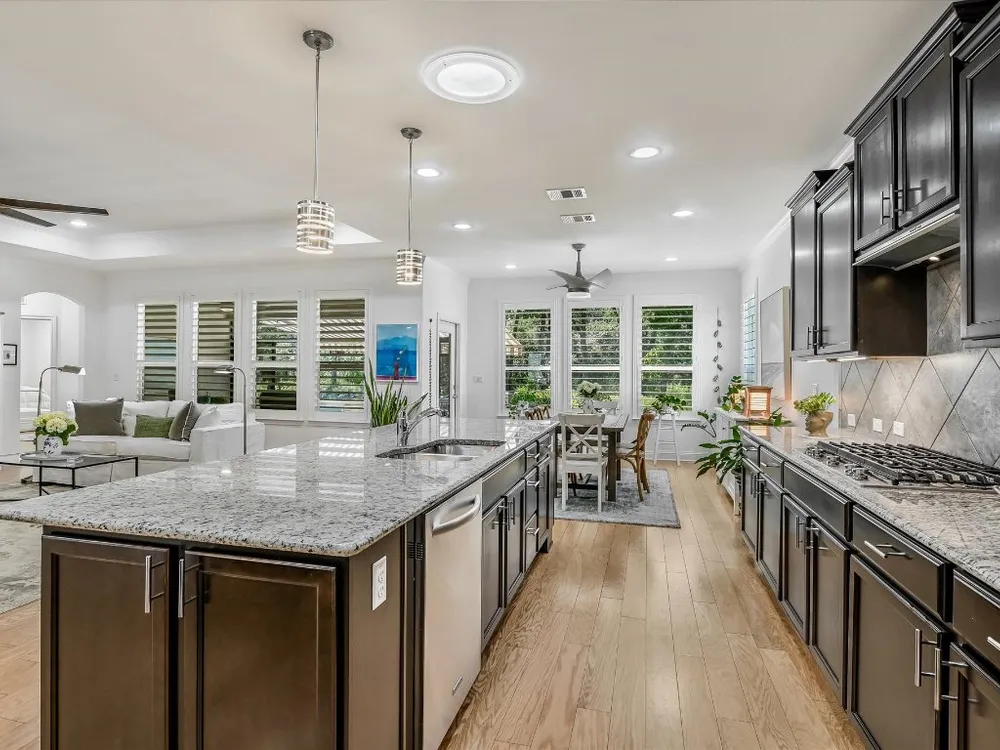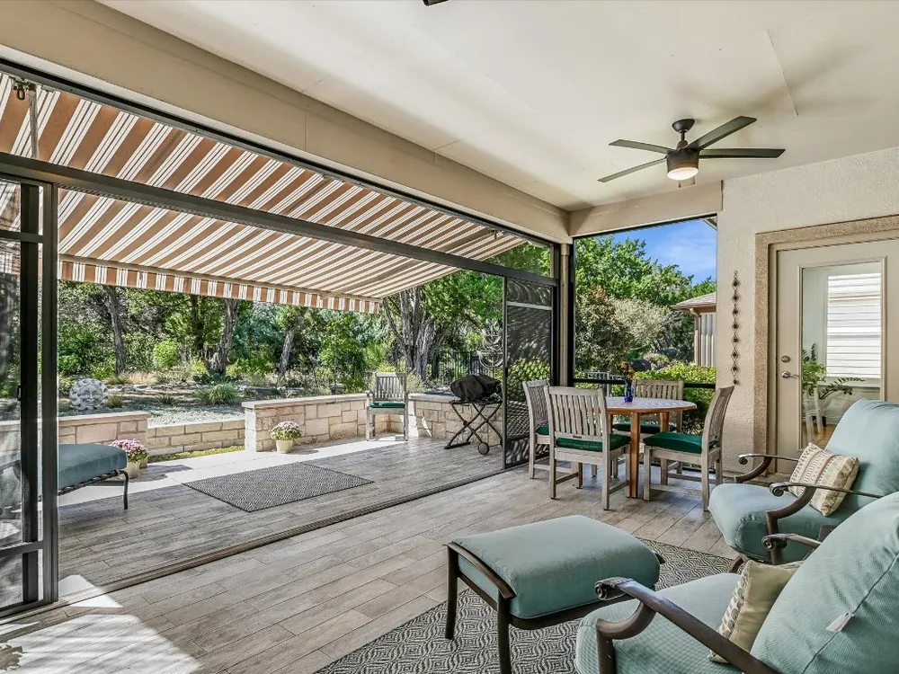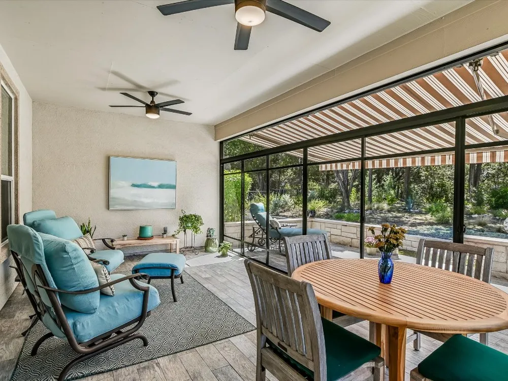 This beautifully maintained Dunwoody residence showcases a popular open floor plan and modern contemporary design. The home features three spacious bedrooms and three full bathrooms, making it ideal for comfort and versatility. Additionally, a large study or den provides extra living space, perfect for a home office or relaxation area. Step inside to discover a warm and inviting atmosphere, with expansive windows offering a wonderful view of the spacious backyard lot—enjoy the private backyard. The interior boasts top-of-the-line upgrades, including elegant tray ceilings, solar lights for energy efficiency, and stylish contemporary designer ceiling fans and light fixtures throughout the home. The open floor plan is enhanced with crown molding, wood laminate floors and 4” plantation shutters throughout. The open kitchen has cabinet and storage space granite counter tops and a large kitchen island offering ample room for entertaining and dining. Cabinets include convenient pull-out shelves and large pantry. Enjoy Outdoor Living...The extended screened patio is a standout feature, designed for year-round enjoyment. It is equipped with durable composite decking, retractable screens, and a convenient retractable awning, creating an ideal space for entertaining or relaxing while taking in the serene backyard views of the oversized lot. Golf cart included! Conveniently located near Cowan Creek golf course and amenity center.
