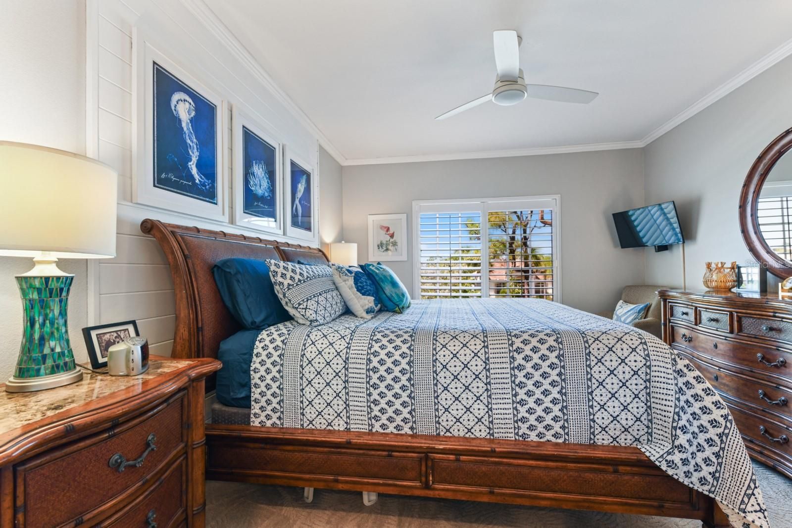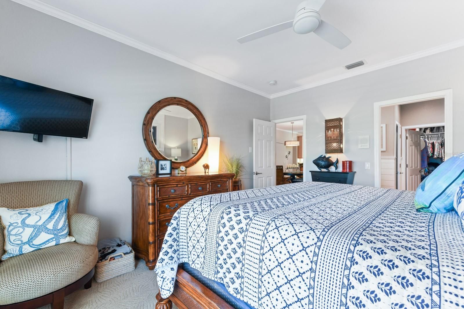 - Built-in Features, Ceiling Fan(s), Crown Molding, Eat-in Kitchen, Living/Dining Room, Open Floorplan, Main Level Primary, Split Bedrooms, Stone Counters, Walk-In Closet(s), Window Treatments