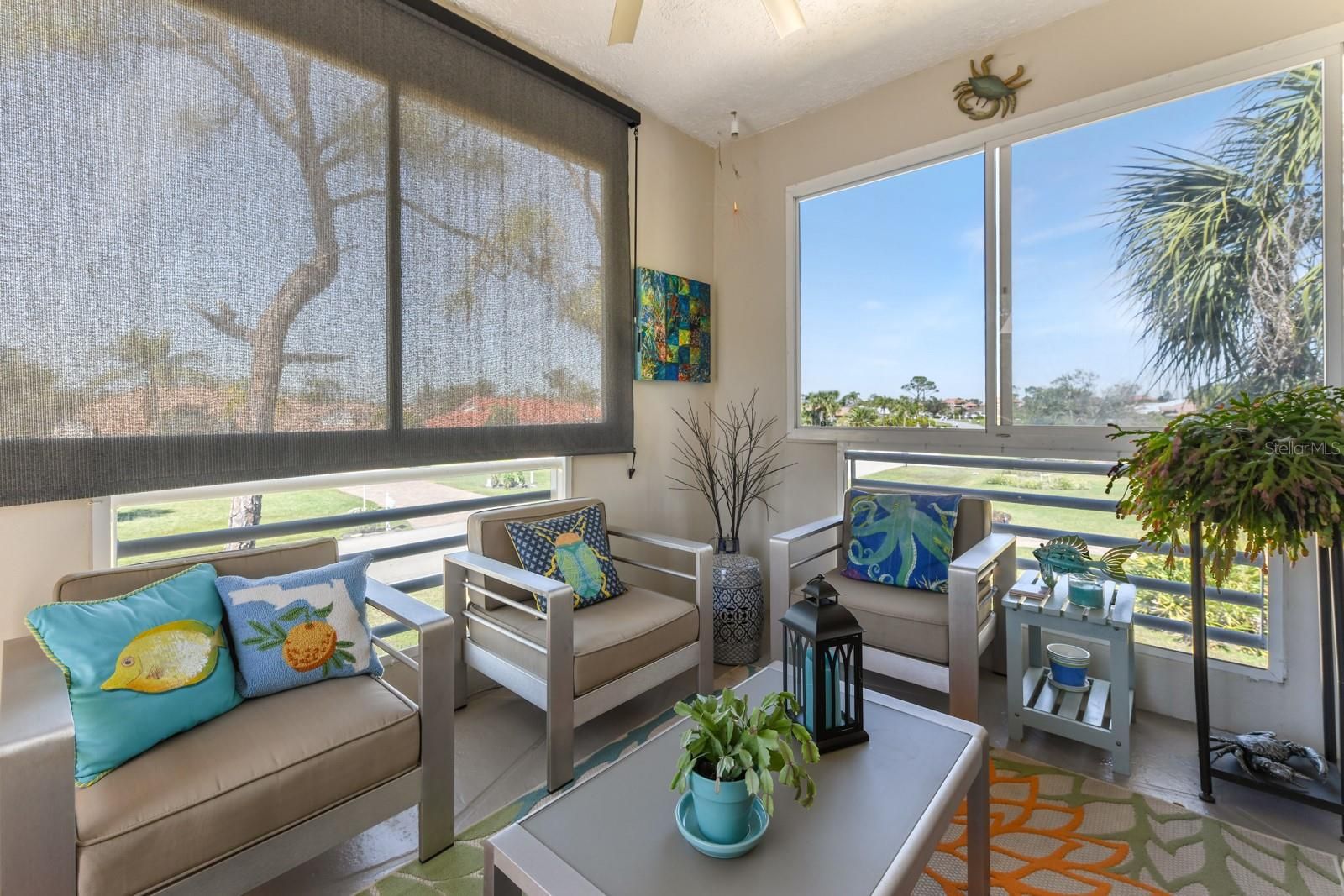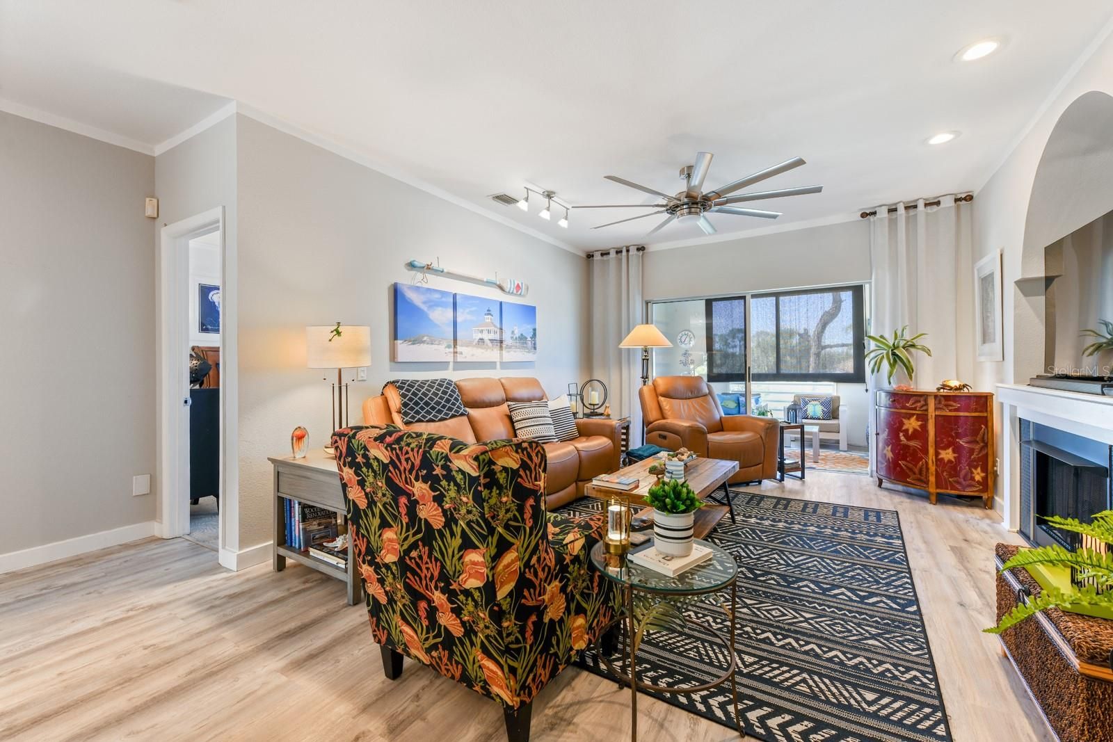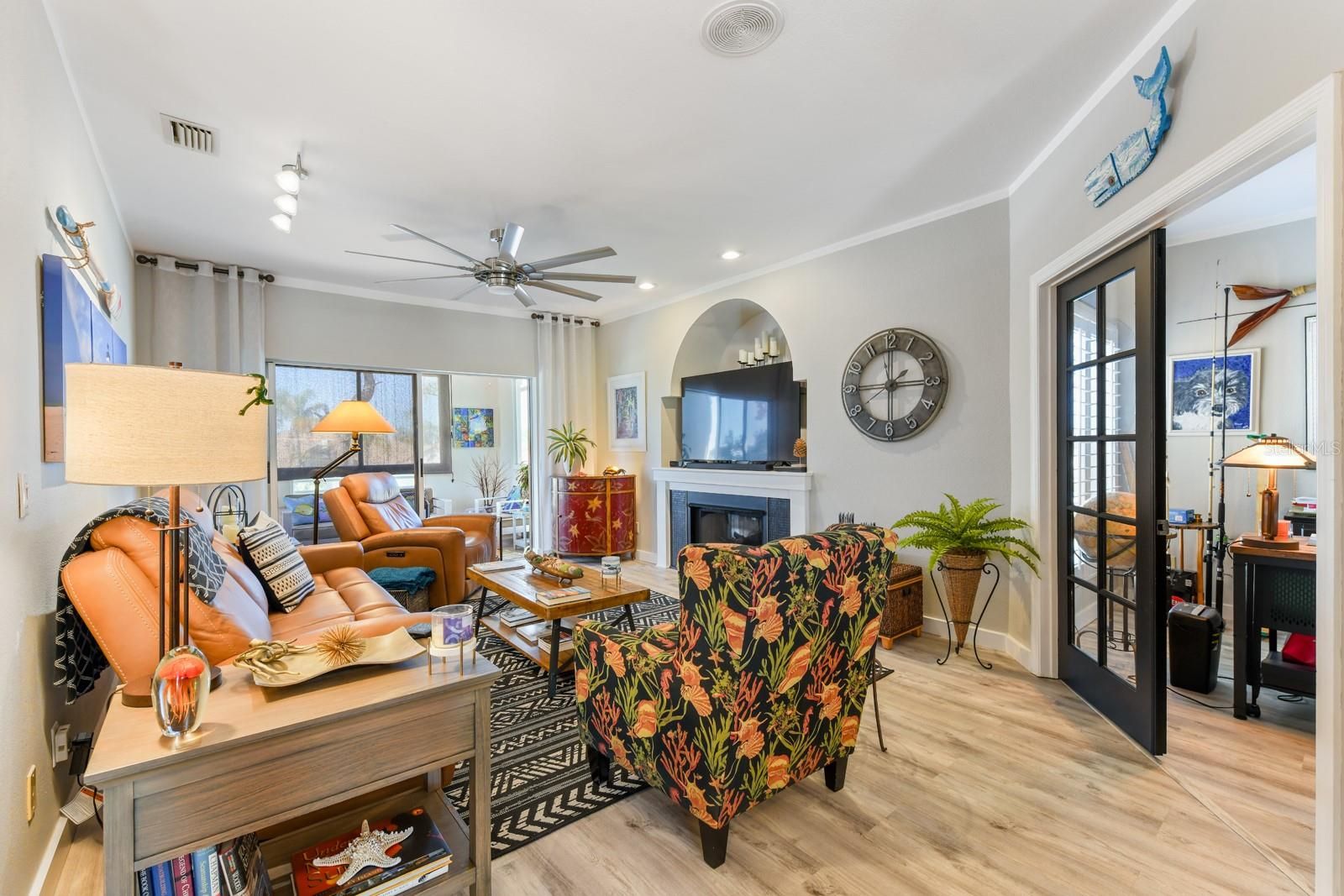Surrounded by tropical trees within a beautiful 8-unit community in Burnt Store Marina you’ll find this gorgeous 1,585sf second floor condo featuring 3 bedrooms, 2 baths and private single car garage. Light and bright, this spacious and open floor plan with windows on all four sides is offered TURNKEY FURNISHED with distinctive touches you won’t find anywhere else! Inside, you'll be greeted by tasteful neutral paint, stylish finishes, crisp plantation shutters over all windows and a beautifully furnished interior! This interesting layout provides a dining area with a comfortable living area that showcases easy-care wood plank luxury vinyl flooring. On cooler evenings enjoy the inviting fireplace that adds both charm and warmth. The adjacent enclosed lanai allows an extended living space to enjoy year-round with long views of the golf course and sunsets in the evening. An open and spacious kitchen features light granite countertops with attractive backsplashes, and tall 42-inch cabinets with crown molding. WIth a delightful dinette area, newer stainless appliances and a breakfast bar open to the living area, you’ll enjoy entertaining with friends. The split bedroom layout gives you and guests privacy and both bedrooms have designer updates with board and batten walls and crown molding. The two bathrooms were also artfully updated. The guest bath features new a vanity and shower with custom beadboard ceilings and board and batten side walls, and the owner's bath has a complete redesign with new shower, extra storage closet, dual vanity with granite counter, storage tower and two vessel sinks. Additional details include stylish ceiling fans, new dishwasher and a newer full-size washer and dryer. The community is wonderfully maintained and the buildings were upgraded with newer metal roofs, ensuring long-term durability. This condo combines comfort, style, and thoughtfully smart features – come take a look! And be sure to explore the amenity-rich Marina community featuring a 27 hole public golf course, tennis, pickleball and active fitness center, 3 onsite restaurants, Freedom Boat Club, wet and dry boat storage and the fastest access to open water in the area. Enjoy our active, friendly lifestyle and find out why people love to call this home!