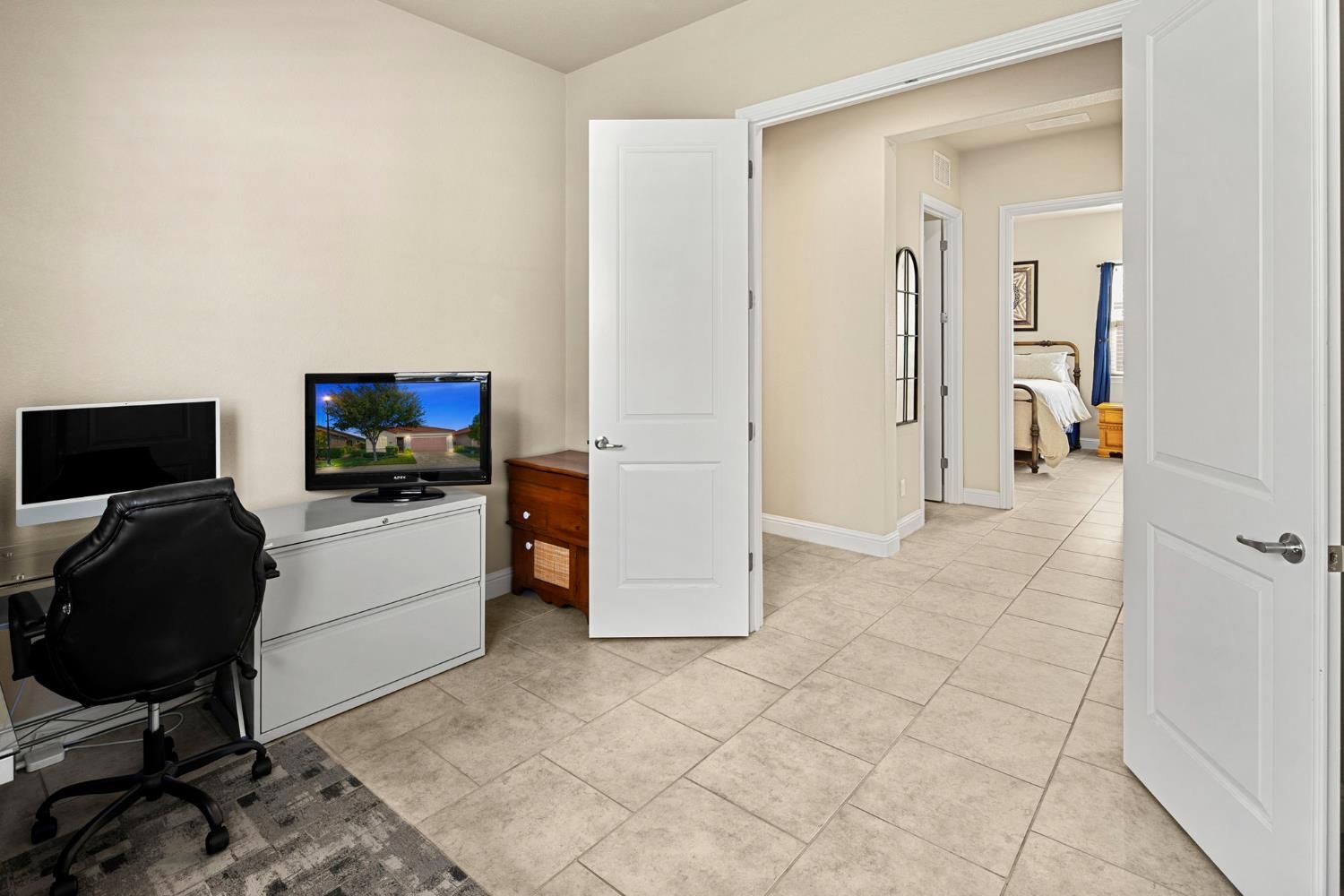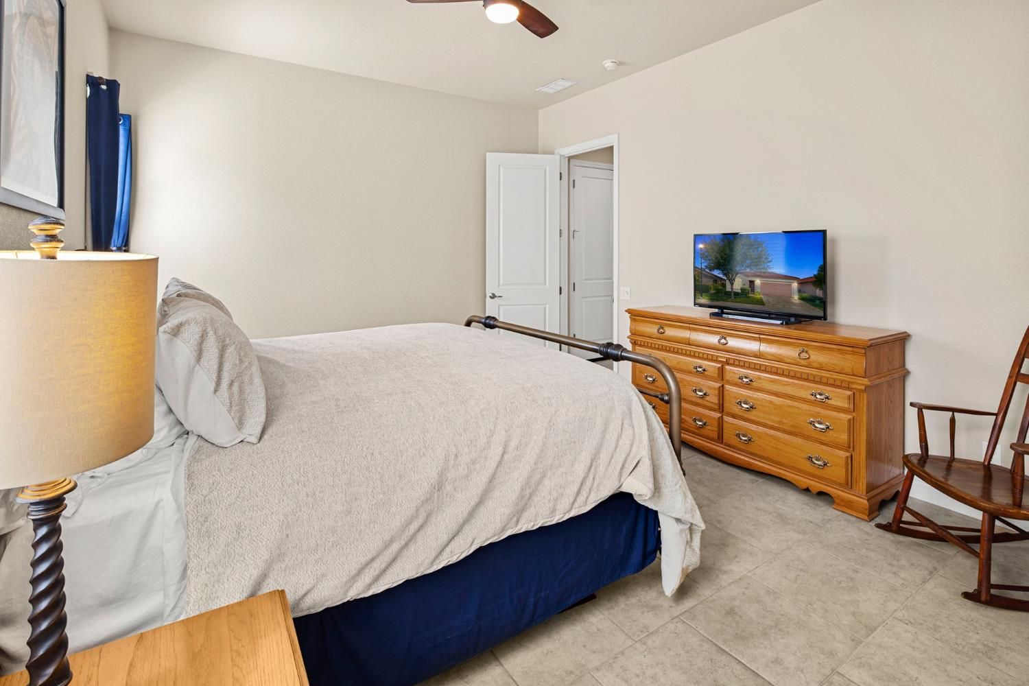 HOLIDAY SPECIAL! Seller offering a $5K additional credit with acceptable offer in December. Discover the epitome of elegant living in this stunning Berry model home. The moment you arrive, the curb appeal draws you in. Designed with an open floor plan, this home is well configured for hosting family and friends. Sunlight cascades through the picturesque windows, highlighting the warm, neutral tones of the thoughtfully selected paint palette. Your personal retreat awaits in the spacious master bedroom, complete with an expansive walk-in closet in the oversized en-suite bathroom. Guests will feel right at home in the private secondary bedroom and accompanying bathroom. For those working from home or pursuing hobbies, the multipurpose flex room conveniently located in the heart of the floor plan features a stylish double-door entrance. Step out back to your private retreat an ideal yard space featuring a stamped concrete patio, extended covered area with light/ceiling fans, and perfectly selected low-maintenance nature filled landscape. The perfect place to relax, entertain, and enjoy unforgettable moments with family and friends. The clubhouse is filled with an array of fabulous amenities/social gatherings/wide variety of special interest groups and activities.