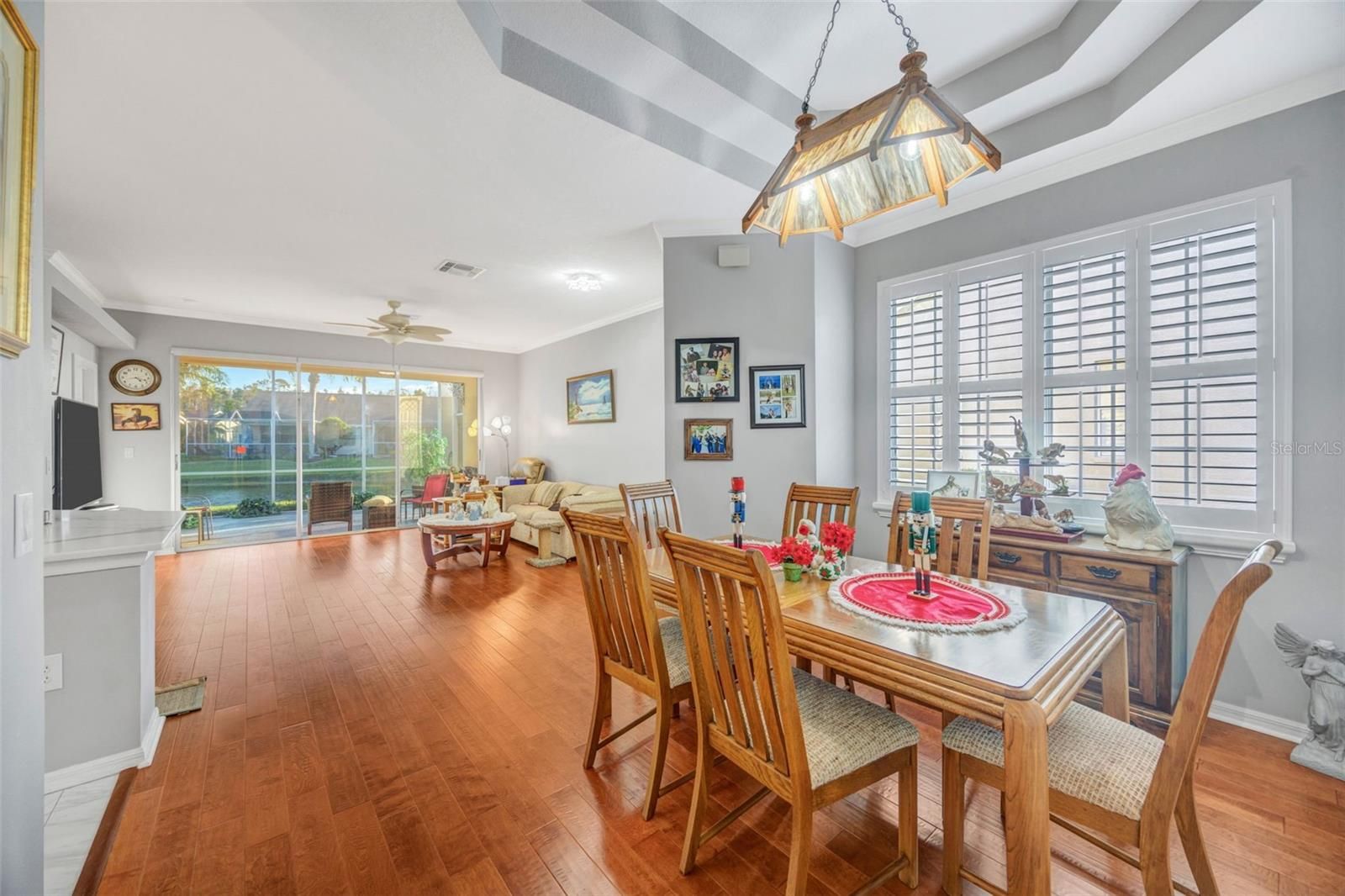 Beautiful end-unit villa offering 3 bedrooms, 2 baths, and a 2-car garage, perfectly positioned with tranquil pond and golf course views enjoyed from the oversized screened lanai. The kitchen features attractive appliances, quartz countertops, and opens seamlessly to the dining and living areas, which showcase engineered hardwood flooring. A stunning new front door with beveled glass welcomes you into the home, while the dining room is accented by a tray ceiling, crown molding, and upgraded lighting throughout. Every window is fitted with plantation shutters, and all ceiling fans and fixtures have been thoughtfully upgraded. The primary suite features engineered hardwood floors, a charming bay window, a spacious walk-in closet, and an en-suite bath with new countertops, sinks, and a walk-in shower. The den/study, which can easily serve as a third bedroom, includes a built-in closet, as does the second bedroom. The laundry room is well-appointed with upper and lower cabinetry and a convenient built-in sink. Located within The Groves, an active adult, gated community centered around an 18-hole golf course, residents enjoy exceptional amenities including an Aqua Range, fully stocked pro shop, clubhouse with full-service restaurant and bar, library, fitness center, craft room, shuffleboard, bocce, tennis, pickleball, and a newly heated pool and spa. A Publix shopping center sits just outside the gate, offering restaurants, salons, banking, Walgreens, and more for everyday convenience.