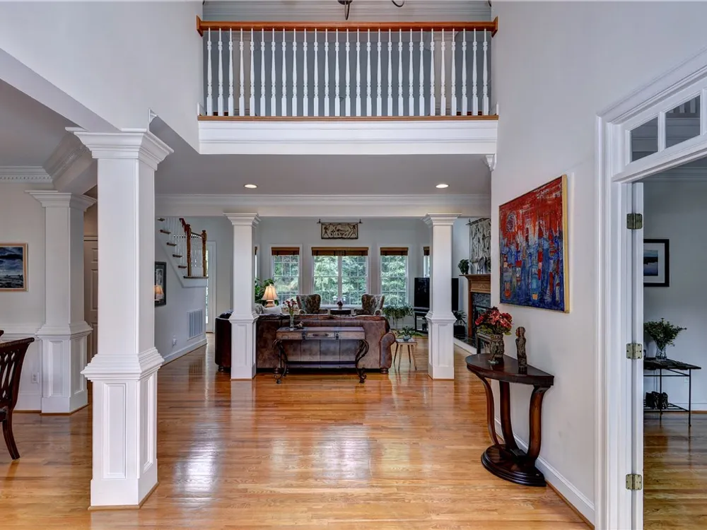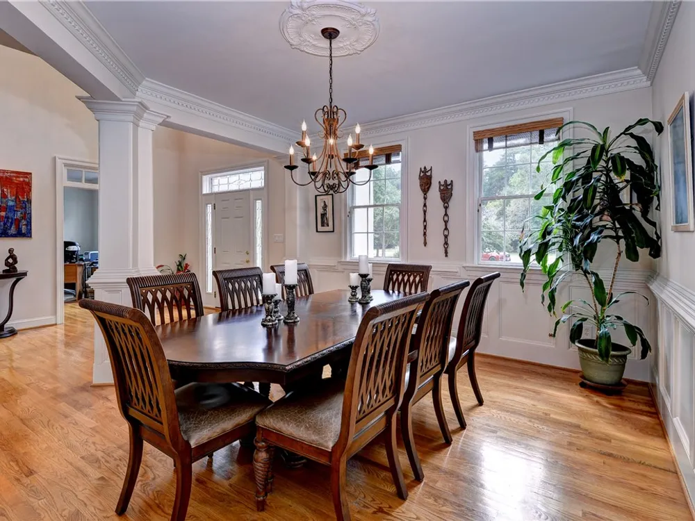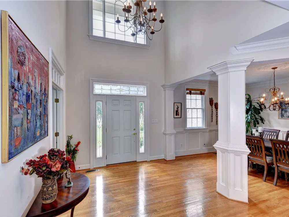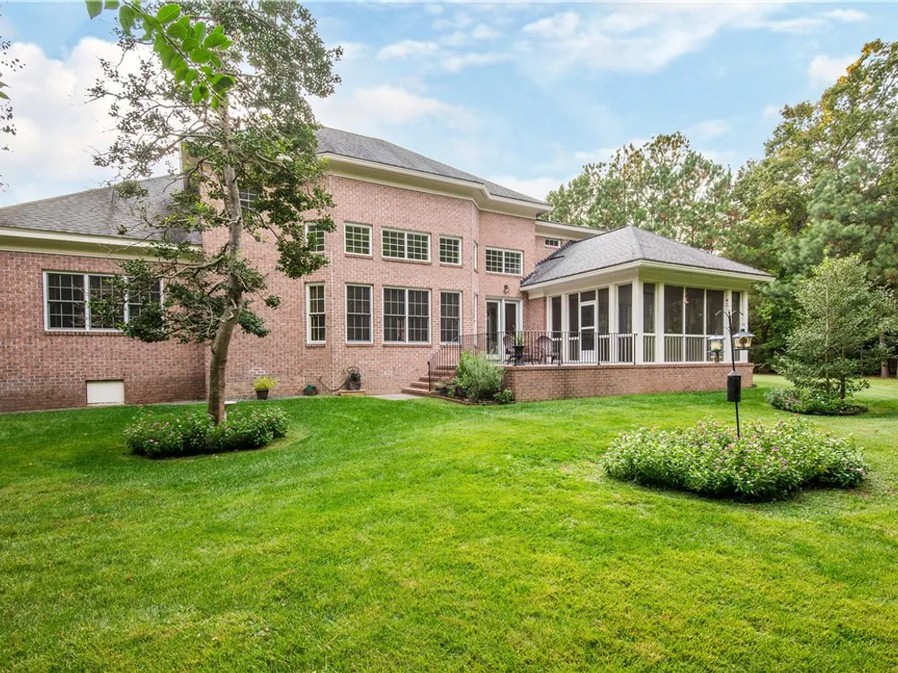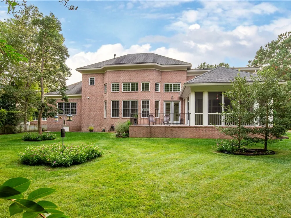 WOW! Truly an extraordinary home in sought-after Governors Land! Perfectly sited at the end of a quiet cul-de-sac, this all-brick residence has been meticulously maintained and is move-in ready. Offering 3,679 sq ft on a .65-acre lot, it is filled with natural light and beautiful custom millwork. The welcoming foyer is flanked by a home office with French doors and an elegant dining room with wainscoting and dentil molding. The great room impresses with a dramatic wall of windows overlooking a private, wooded, serene setting plus a natural gas fireplace. The kitchen includes a center island, granite counters, solid maple cabinetry, a large breakfast area, pantry, and abundant workspace. A spacious utility room with sink and storage adds convenience. The first-floor primary suite offers a large walk-in closet and en suite with Kohler bubble tub and shower. Upstairs are three additional bedrooms plus a bonus/5th bedroom. Outdoor living includes a screened porch and stamped concrete patio backing to tranquil wooded views. Extras: Pella windows and doors, Low-E double-hung windows, oversized 2-car garage with epoxy floor, sealed and conditioned crawlspace, and two walk-in attics.