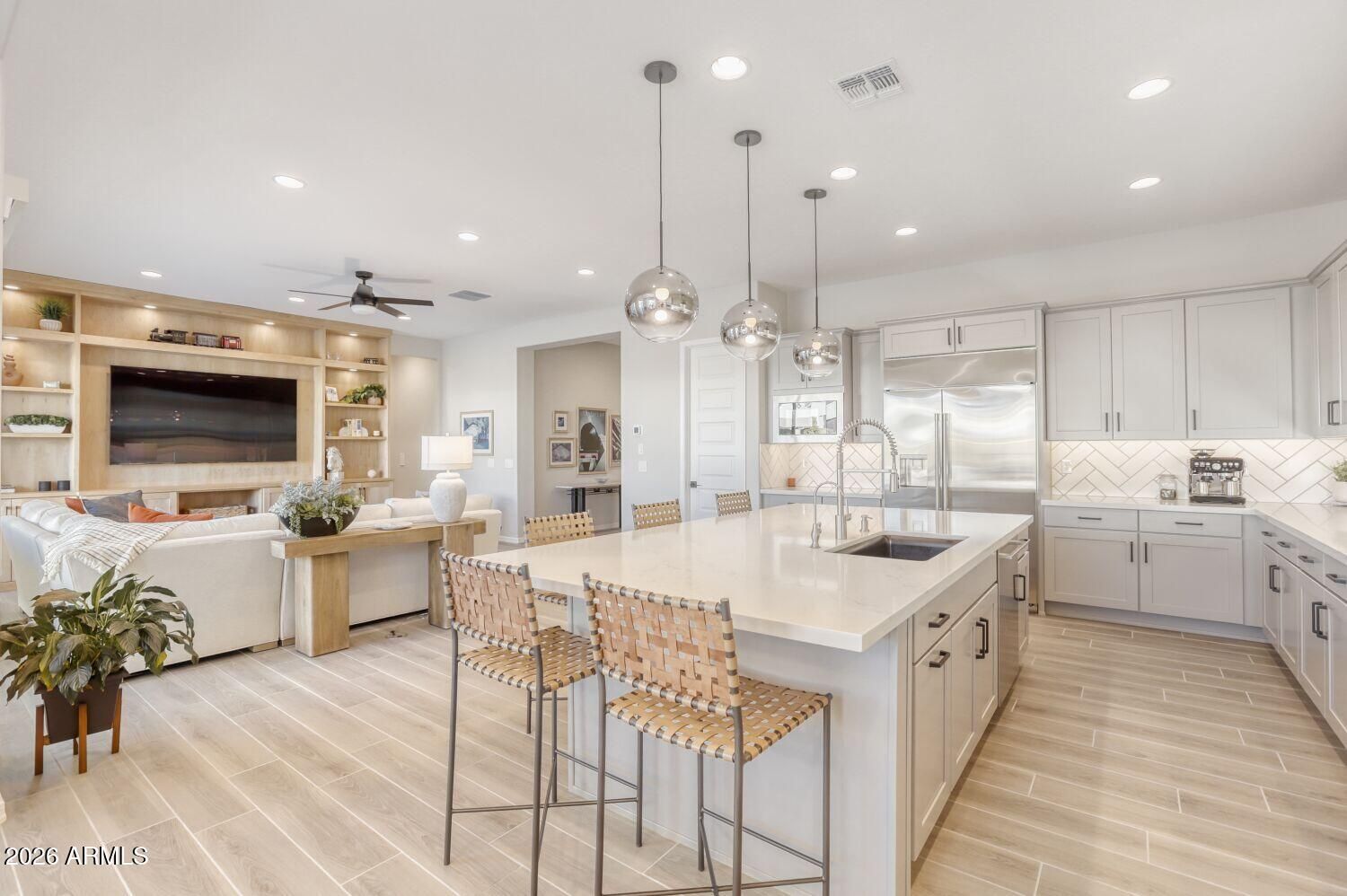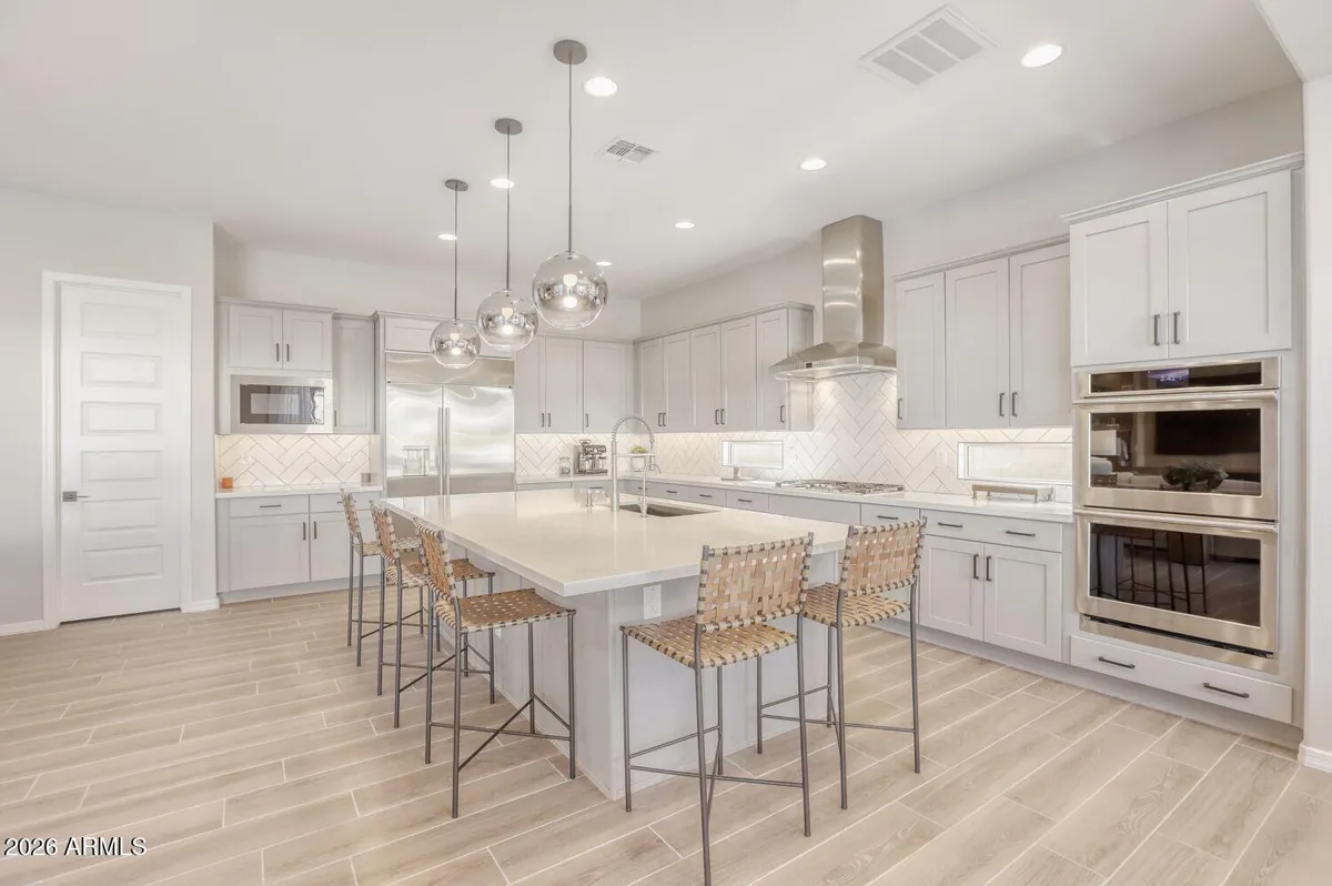 Experience luxury living in the exclusive 55+ Victory at Verrado. This meticulously upgraded Taylor Morrison Shire model offers 3 BRs, a custom den, and 3.5 baths. Professionally decorated and designed to impress! The chef's kitchen features GE Monogram appliances, a gas range, and a built-in fridge. Entertain in style in the dining area, complete with in custom built-ins, including a wine cooler and refrigerated drawers. The resort-style backyard is a masterpiece, featuring a saltwater pool, hot tub, fire pit, and a sunken outdoor kitchen with a BBQ and fridge. Notable upgrades include a 3-car epoxy garage, motorized blinds, a high-end EcoWater softener. From the professional landscaping to the designer drop zone, every detail in this home has been curated for the sophisticated buyer.