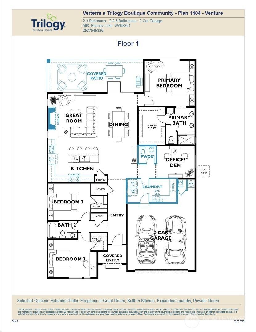 Discover elevated 55+ living at Verterra in Tehaleh, a newly built community designed for true resort-style comfort. This move-in-ready Venture floor plan offers 2 bedrooms, 2.25 baths, a versatile den, and refined designer finishes throughout. The open layout centers around a light-filled great room featuring a gas fireplace, an expansive kitchen with a large island perfect for gatherings, and seamless access to a covered patio ideal for relaxing or entertaining. Enjoy the perfect balance of convenience and tranquility with nearby dining, shopping, and recreation in Tacoma, plus easy access to Seattle just 40 minutes away. Crafted by America's Most Trusted Active Adult Resort Builder for 14 Years, don't wait to dive into joy with this immaculate home—Live Happier® at Verterra today!