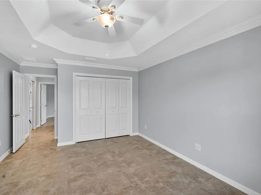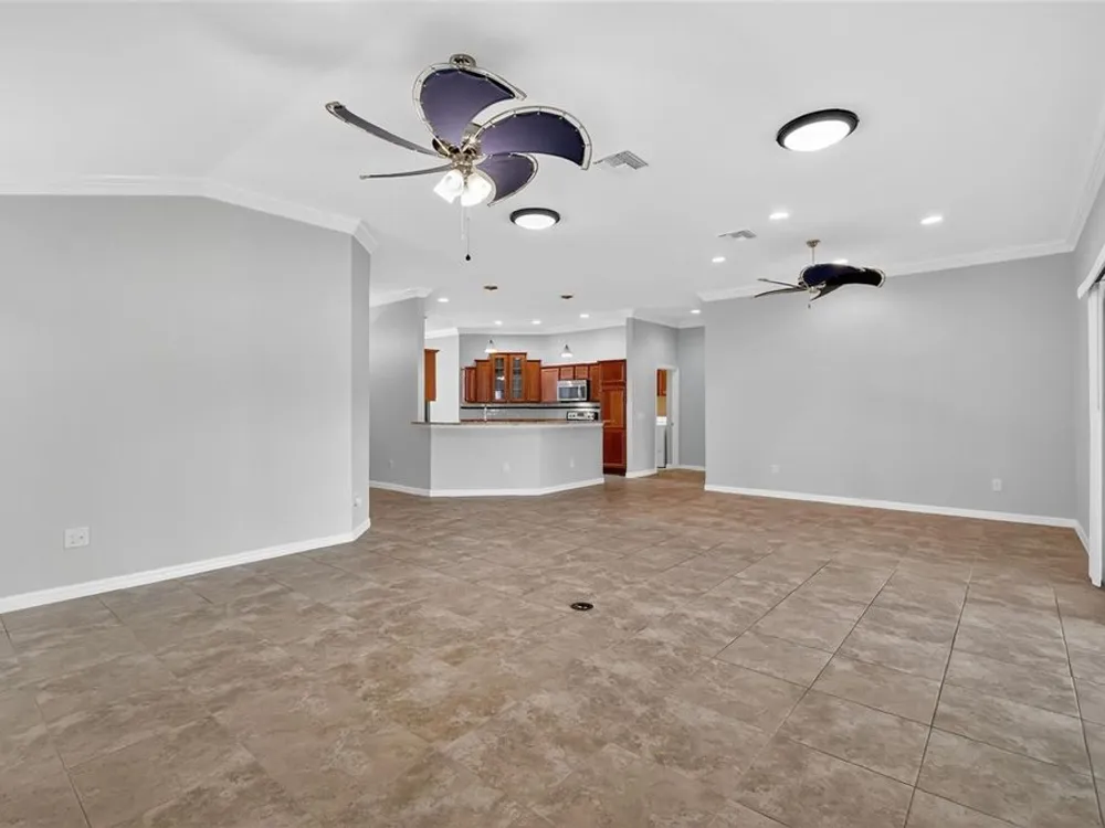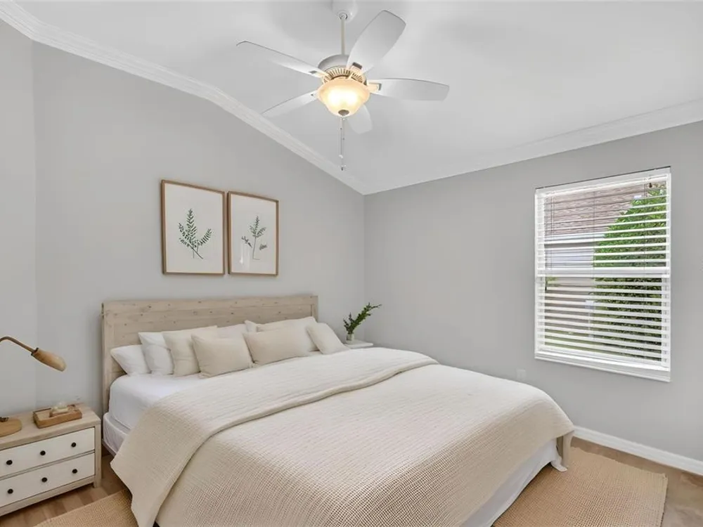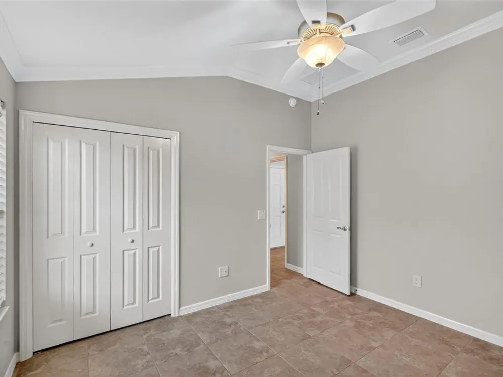 - Ceiling Fan(s), Crown Molding, Eat-in Kitchen, High Ceilings, Living/Dining Room, Open Floorplan, Main Level Primary, Split Bedrooms, Stone Counters, Thermostat