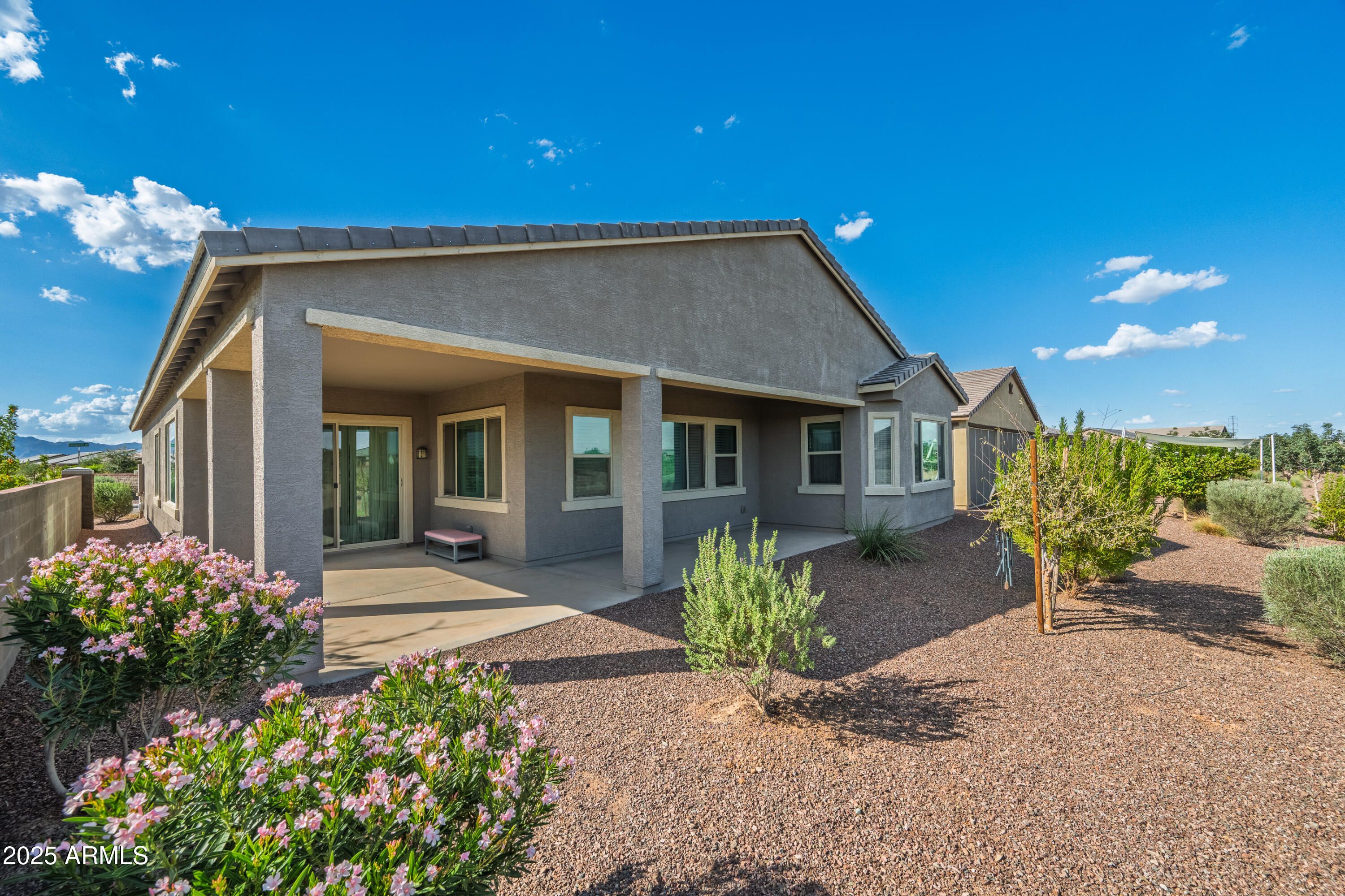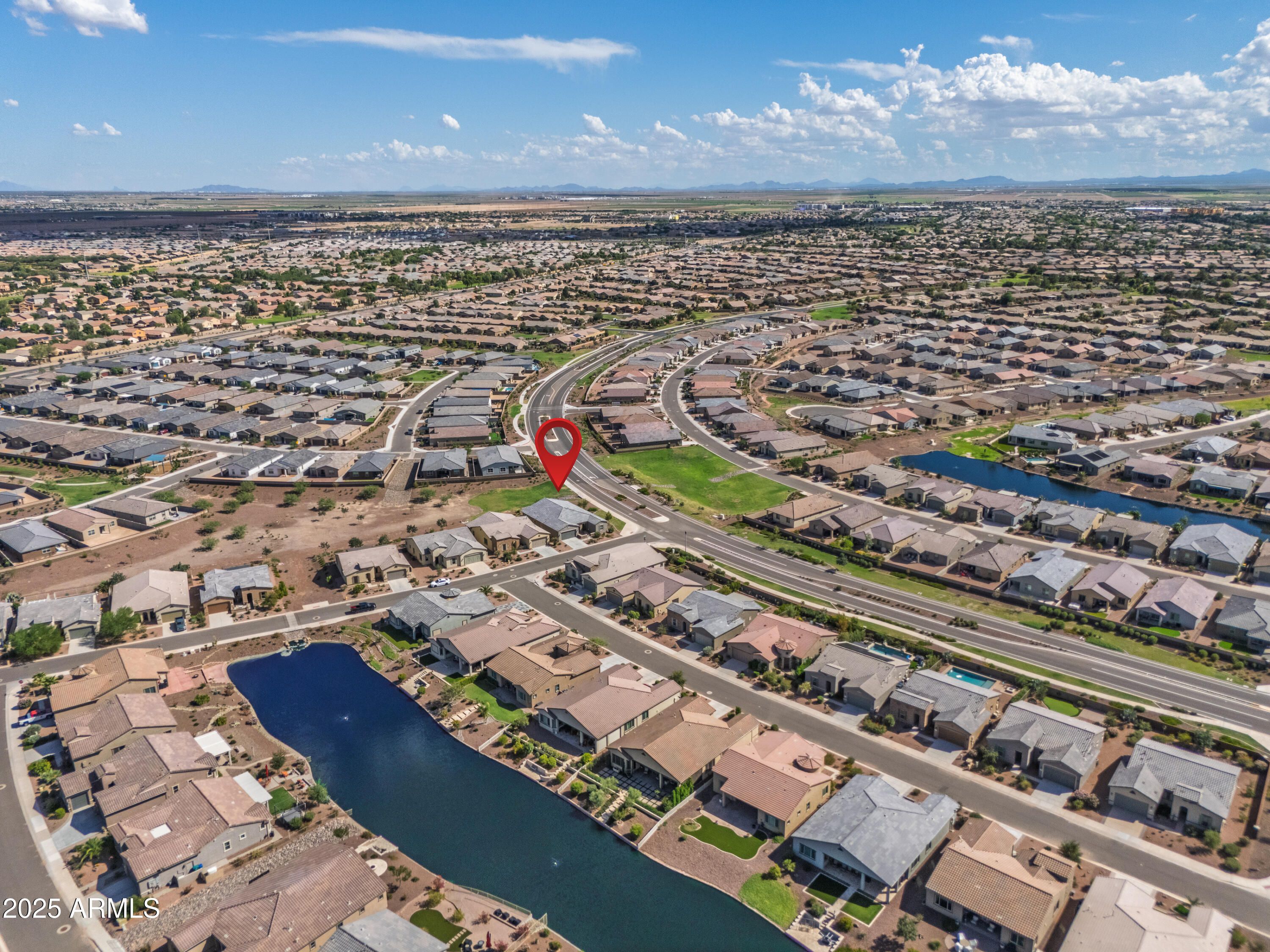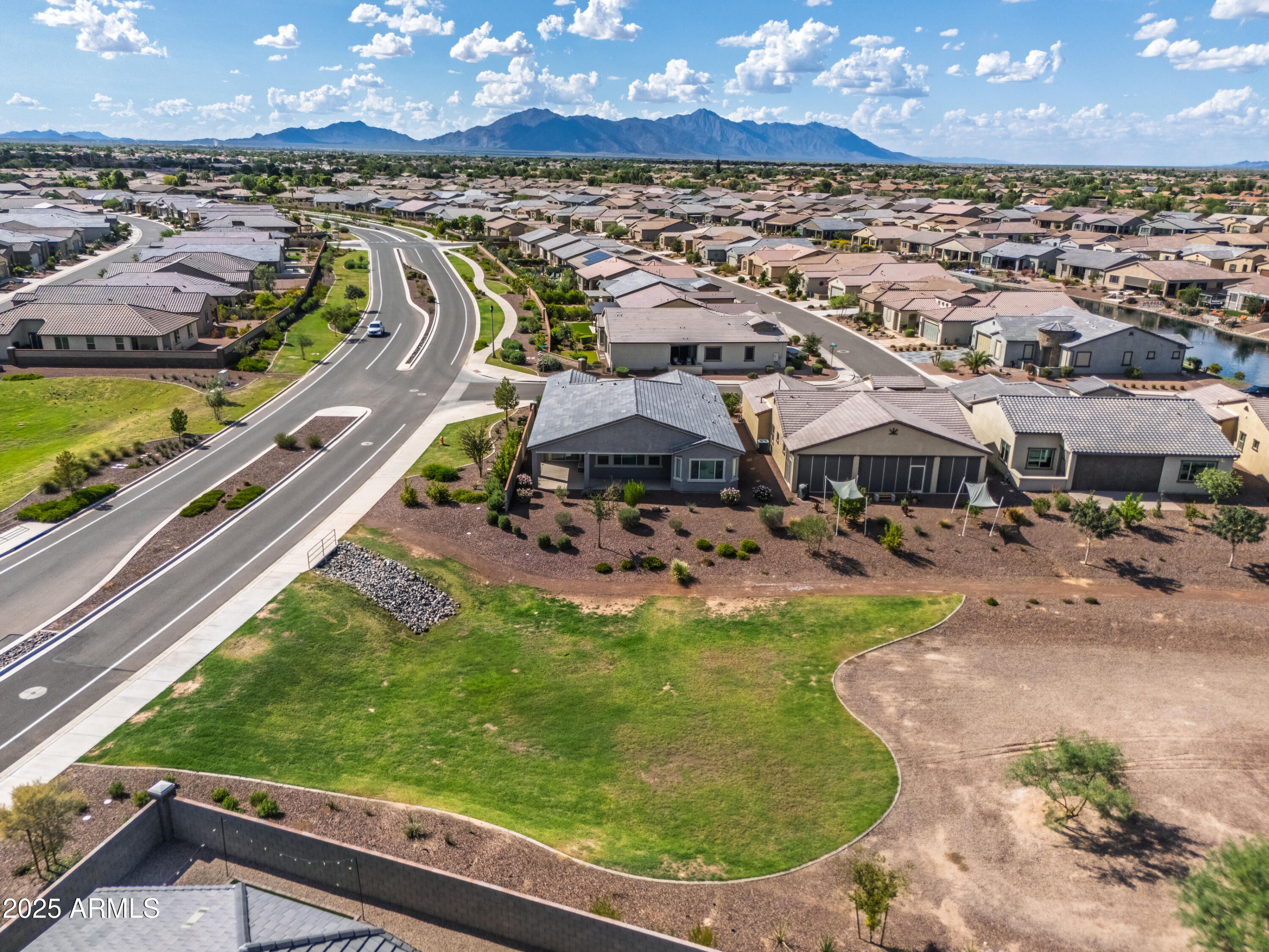 Welcome to this beautifully upgraded home in the award-winning 55+ community of Province in Maricopa. Built in 2021 and set on a desirable corner lot with no neighbors behind, this residence offers privacy and a greenbelt backdrop you'll appreciate year-round. Step through the gated front courtyard into a bright, open layout featuring a split floor plan, plank tile flooring and plantation shutters throughout. The kitchen is a true centerpiece with granite counters, tile backsplash, crown-topped cabinetry, glass display cabinets with interior lighting, undercabinet lighting and stainless appliances including a gas range. A reverse osmosis system plumbed to the refrigerator, water softener and a walk-in pantry add both convenience and functionality. The spacious owner's suite is enhanced by a bay window that fills the room with natural light. The ensuite bath features dual sinks with vanity seating, custom chandelier lighting, a private water closet, and a walk-in closet. Additional highlights include an extended garage, large laundry room with cabinets, shelving, and plumbing for a utility sink, and Berber carpet in bedrooms for comfort. Outdoors, enjoy an L-shaped covered patio perfect for relaxing or entertaining with peaceful greenbelt views. Some furniture available on separate bill of sale. Province offers a lifestyle unlike any other with guarded gates, community lakes, walking paths, pickleball, fitness center, indoor/outdoor pools, and endless activities.