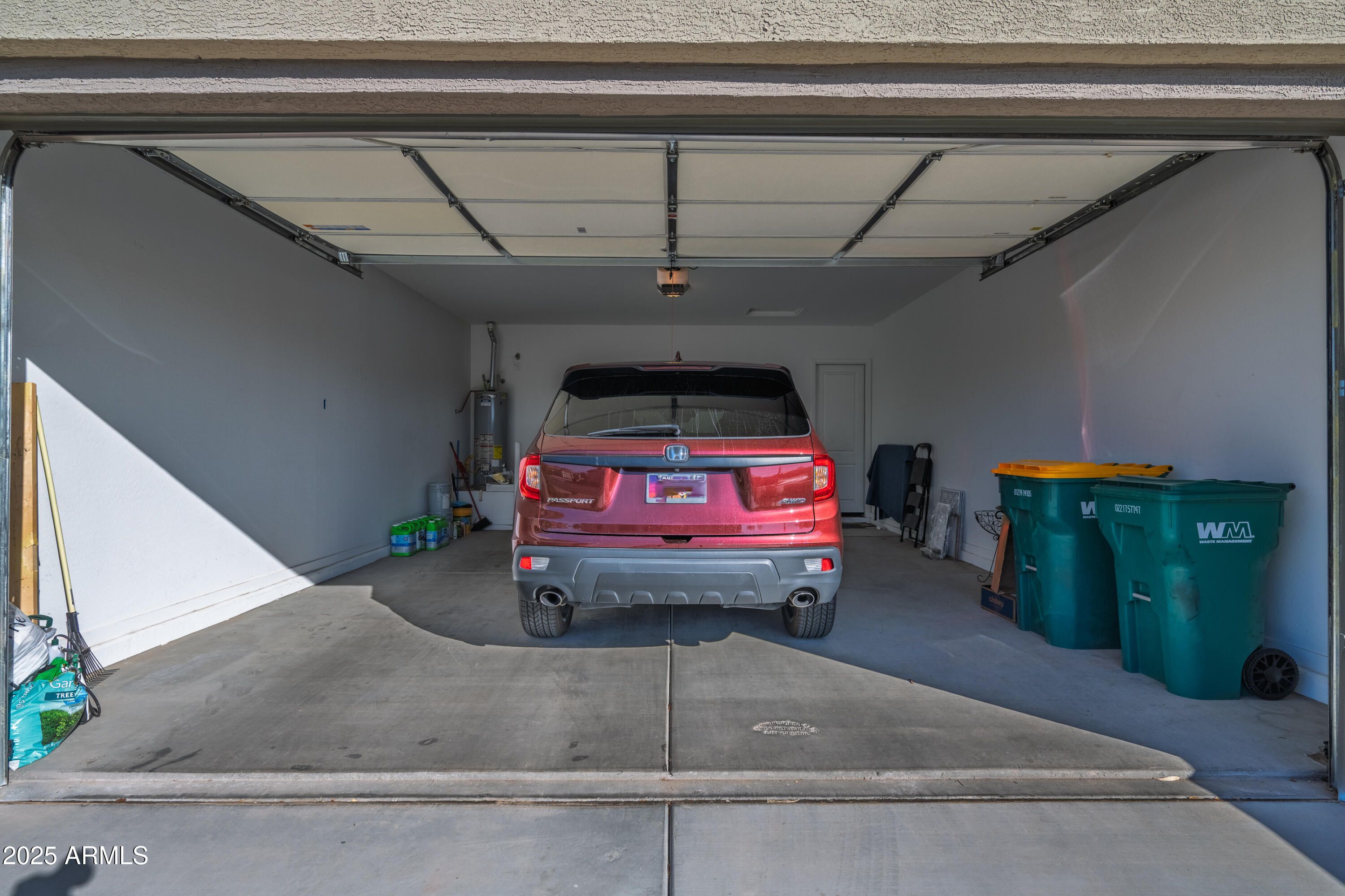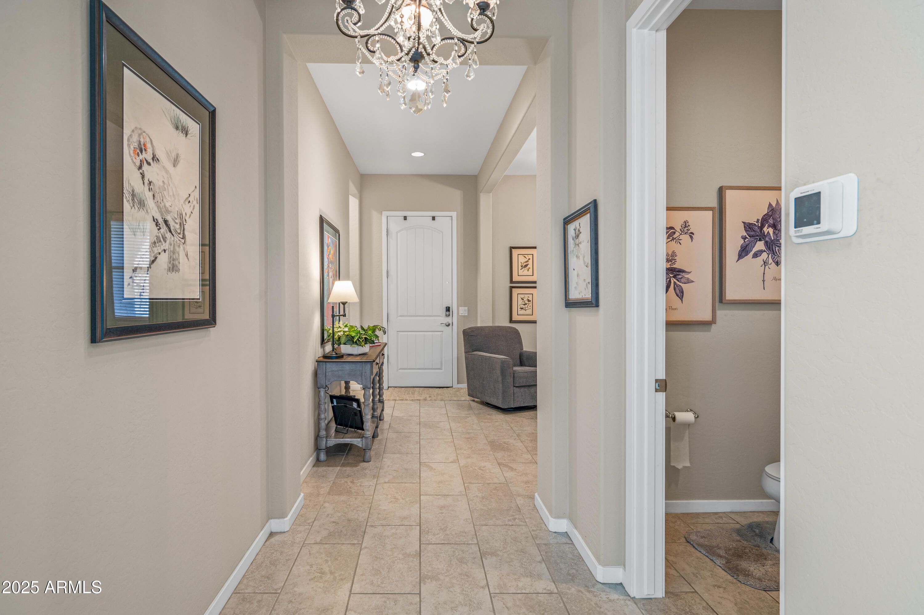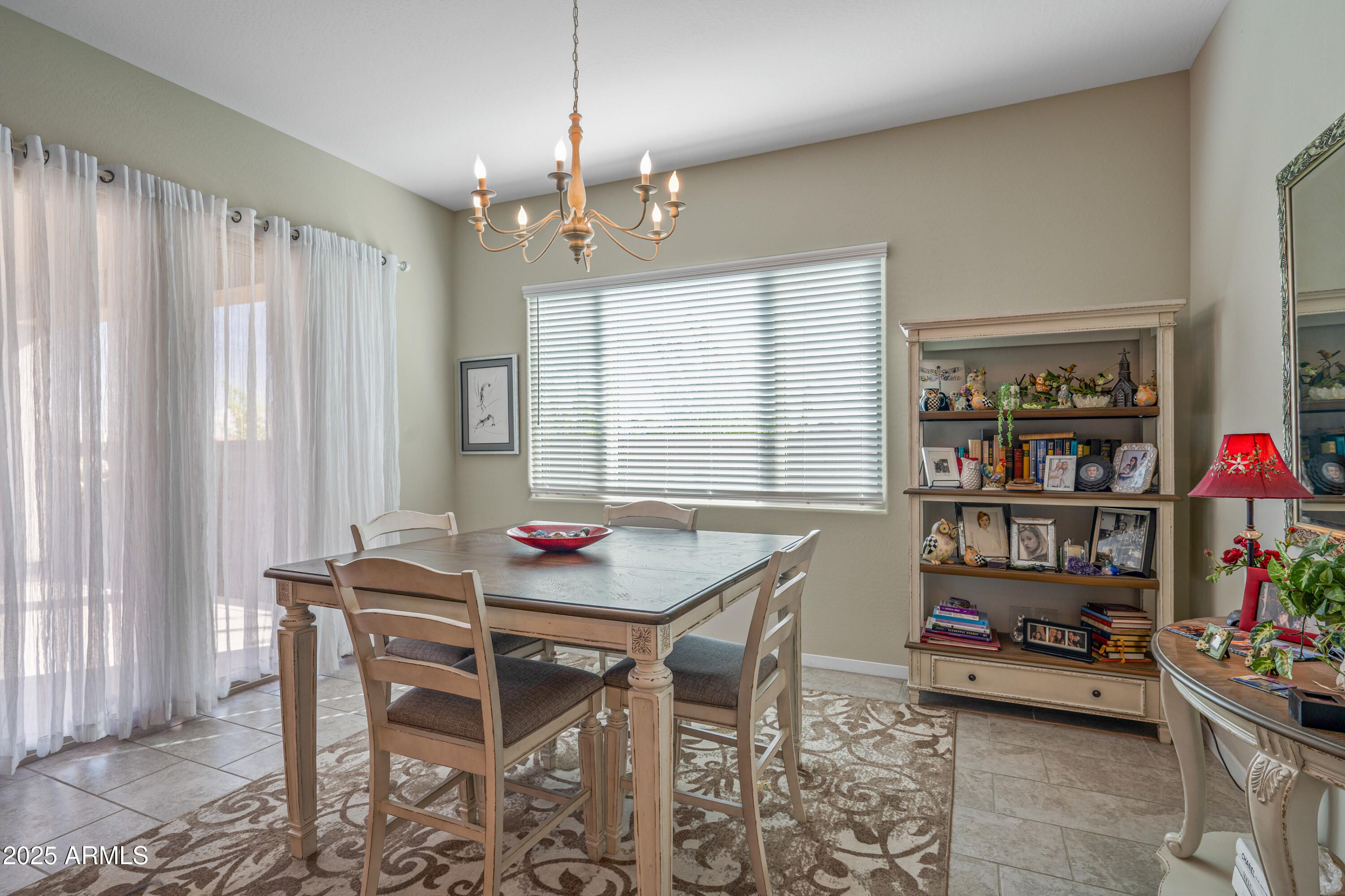 Welcome to this beautifully upgraded home in the award-winning 55+ community of Province in Maricopa. Built in 2021 and set on a desirable corner lot with no neighbors behind, this residence offers privacy and a greenbelt backdrop you'll appreciate year-round. Step through the gated front courtyard into a bright, open layout featuring a split floor plan, plank tile flooring and plantation shutters throughout. The kitchen is a true centerpiece with granite counters, tile backsplash, crown-topped cabinetry, glass display cabinets with interior lighting, undercabinet lighting and stainless appliances including a gas range. A reverse osmosis system plumbed to the refrigerator, water softener and a walk-in pantry add both convenience and functionality. The spacious owner's suite is enhanced by a bay window that fills the room with natural light. The ensuite bath features dual sinks with vanity seating, custom chandelier lighting, a private water closet, and a walk-in closet. Additional highlights include an extended garage, large laundry room with cabinets, shelving, and plumbing for a utility sink, and Berber carpet in bedrooms for comfort. Outdoors, enjoy an L-shaped covered patio perfect for relaxing or entertaining with peaceful greenbelt views. Some furniture available on separate bill of sale. Province offers a lifestyle unlike any other with guarded gates, community lakes, walking paths, pickleball, fitness center, indoor/outdoor pools, and endless activities.