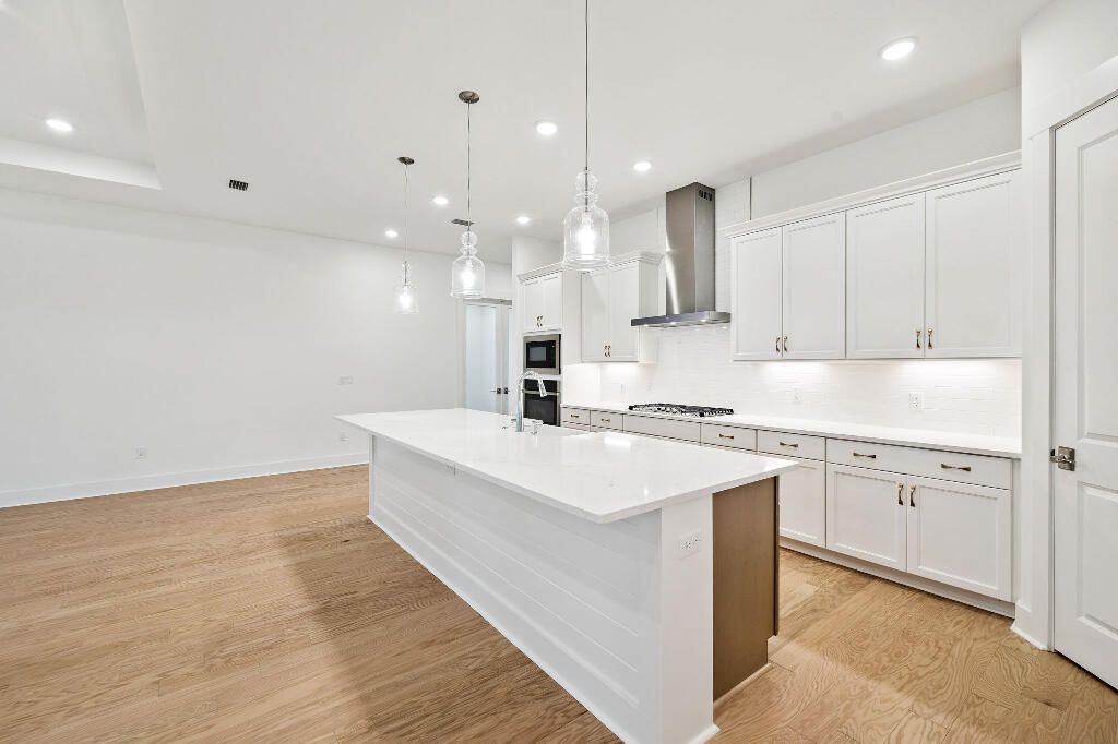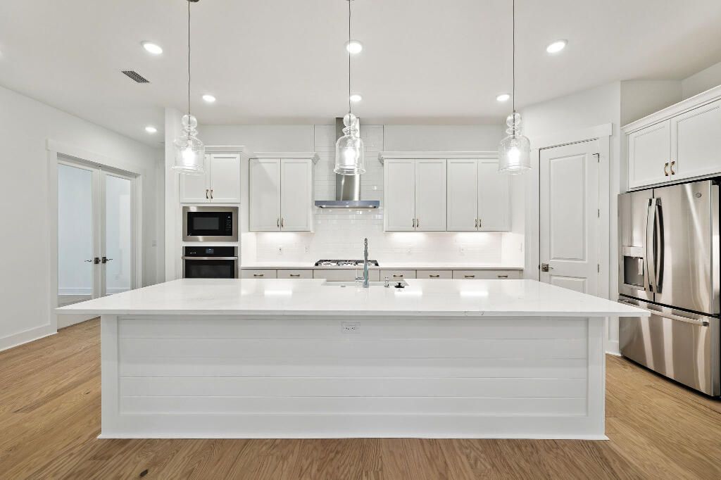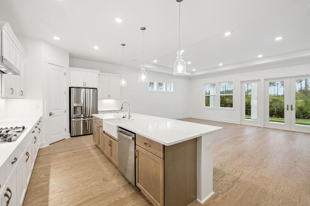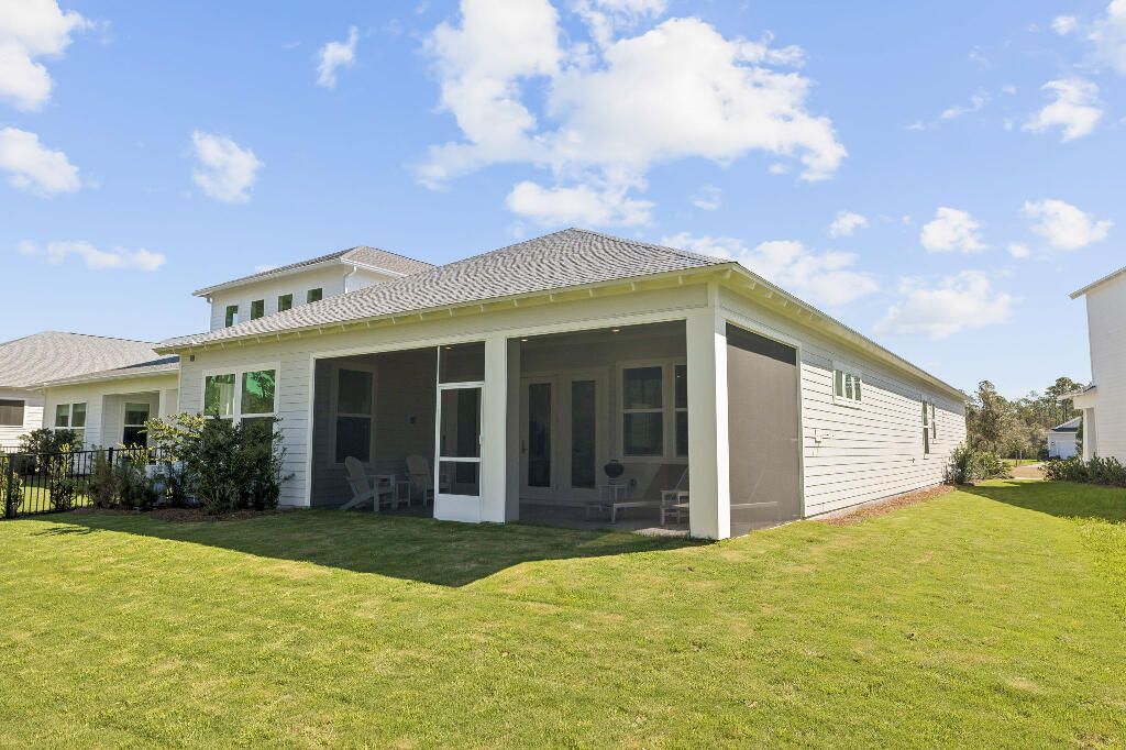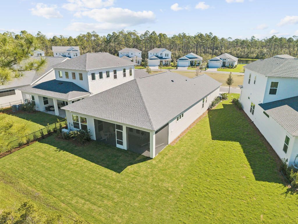 This stunning 3-bedroom, 3-bathroom home with a private office is located on the highly desirable Orman Court cul-de-sac within the gated NatureWalk at Watersound Origins community. Situated on a premium lot that backs up to picturesque evergreens, the property offers exceptional privacy and year-round sunset views. This popular Marco floorplan by Kolter Homes features a spacious, open-concept design. The great room and dining area flow seamlessly into a gourmet kitchen, which serves as a culinary dream with expansive upgraded quartz countertops, a large island, a porcelain farmhouse sink, and an extended gas cooktop. High-end finishes include timeless white subway tile, an upgraded exhaust vent, stainless steel appliances, and a walk-in pantry. Each bedroom includes an ensuite bathroom featuring upgraded cabinetry, porcelain tile to the ceiling, and a walk-in closet. The living area opens through wall-to-wall glass doors and windows to a substantial screened lanai overlooking the forest. The oversized lot provides ample space for a luxury pool and spa, and already includes plumbing for an outdoor hot/cold shower. Residents enjoy world-class community amenities, including a fitness facility, pool, spa, tennis and pickleball courts, a par-3 golf course, and nearby public beach access. This new construction home offers the ultimate coastal lifestyle and is move in ready!