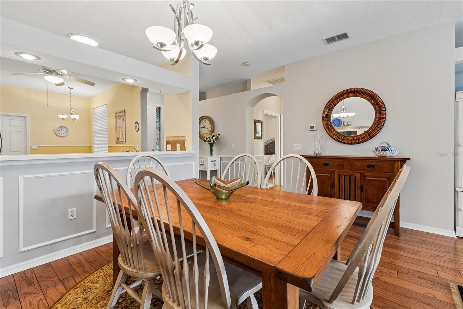 - Ceiling Fan(s), Chair Rail, Eat-in Kitchen, High Ceilings, Living/Dining Room, Open Floorplan, Main Level Primary, Solid Surface Counters, Split Bedrooms, Thermostat, Walk-In Closet(s)
