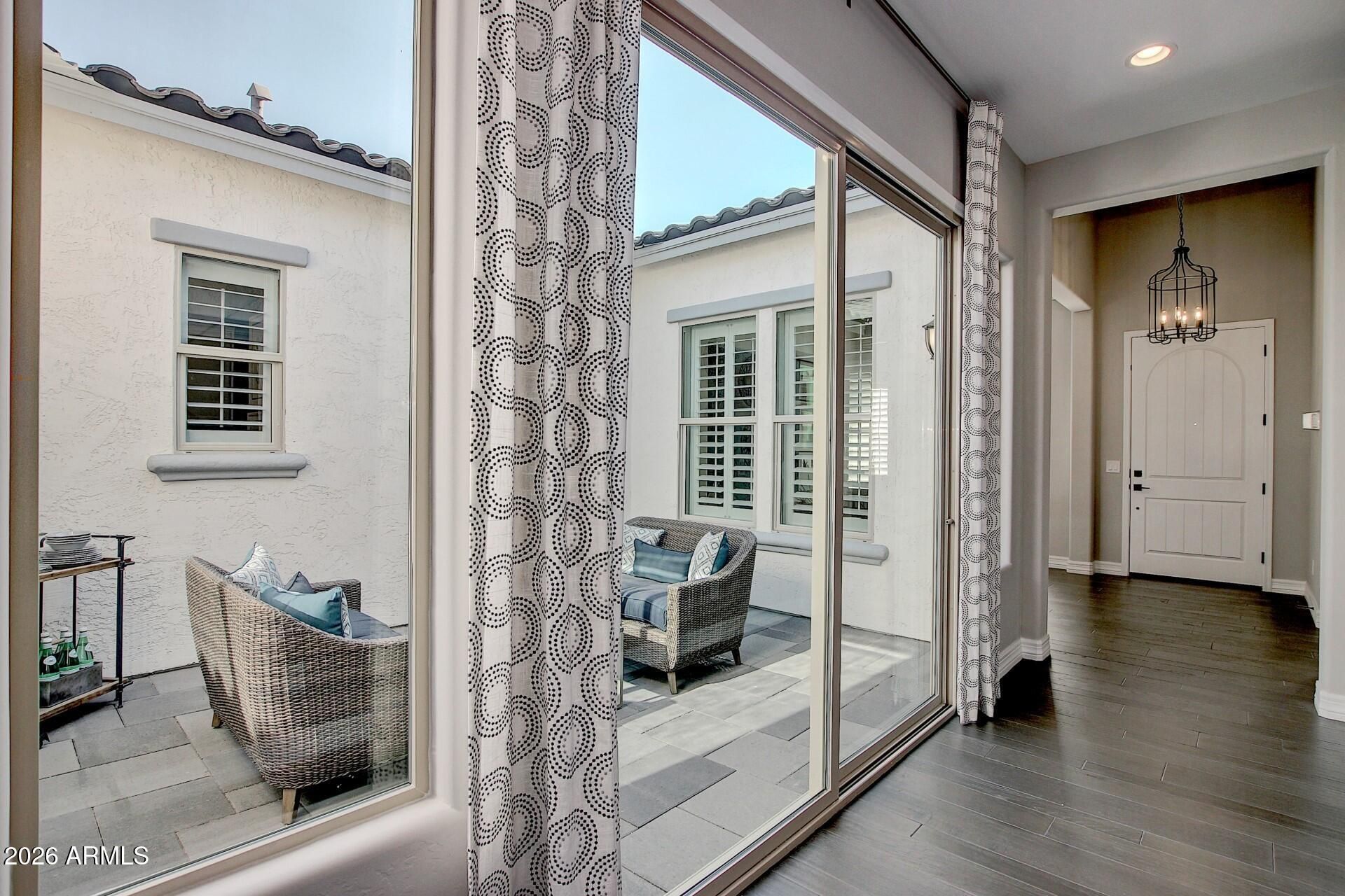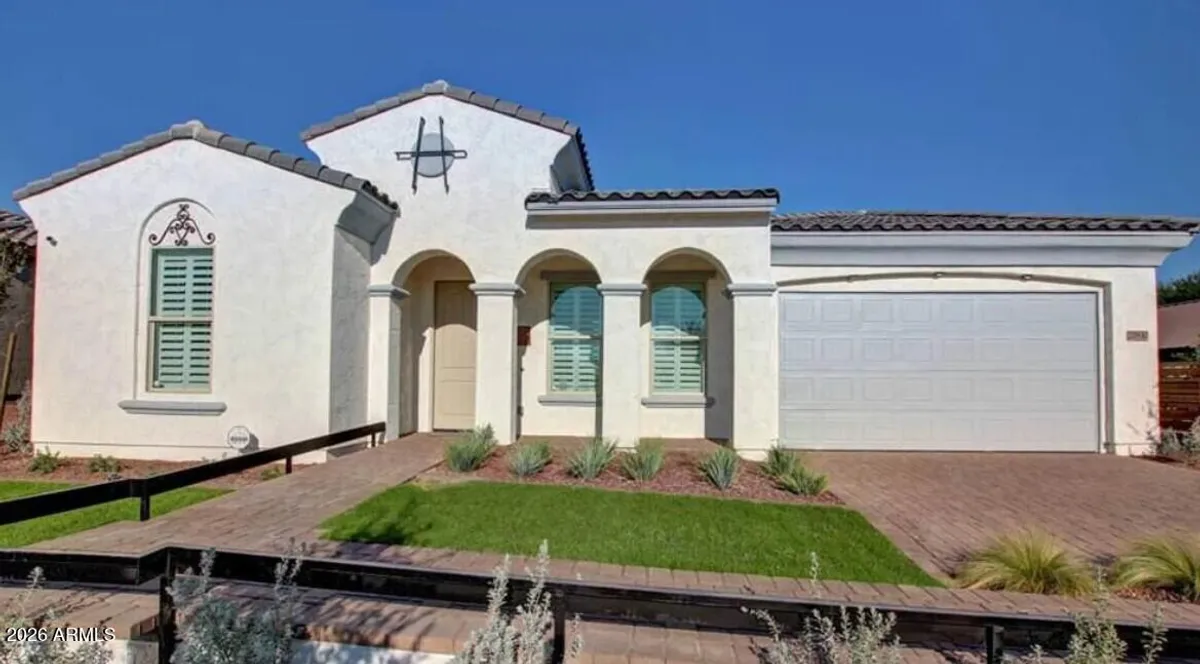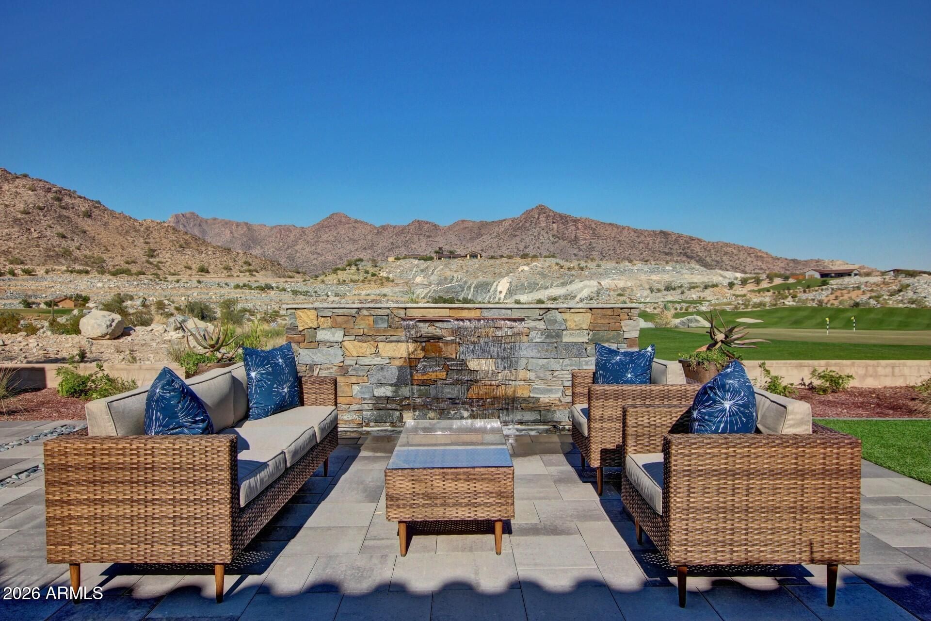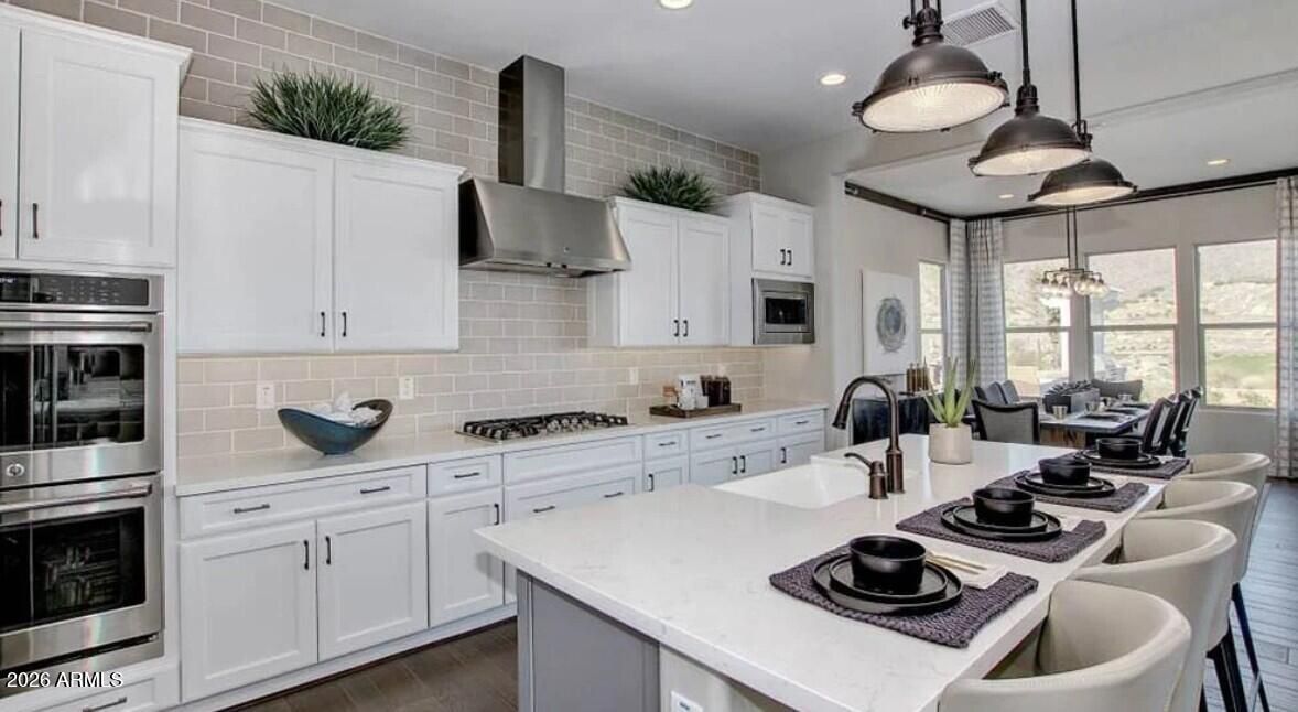 Experience effortless single-story living in this beautifully appointed home offering 3 bedrooms, 2.5 bathrooms, and a 3-car garage, set within the vibrant Verrado Victory community. A welcoming private courtyard sets the tone for comfort and style, leading into a bright open floorplan designed for both everyday living and entertaining. The kitchen shines with bright white cabinetry, Quartz countertops, an oversized island, extended tile backsplash, stainless steel appliances including a gas cooktop, dual ovens, and range hood, plus a generous walk-in pantry. The great room features custom built-ins and flows seamlessly into the dining area, where a wall of windows opens to extend the living space outdoors while capturing stunning golf course and mountain views.The primary suite offers... a peaceful retreat with a private exit to the backyard and a spa-inspired ensuite bath featuring a dual-sink vanity and a large glass and tile walk-in shower. The backyard is highlighted by a serene water feature, creating the perfect setting to relax and enjoy the views. Residents of Verrado Victory enjoy exceptional amenities including a resort-style pool, clubhouse, scenic walking trails, and more making this home the perfect blend of comfort, views, and community lifestyle.
