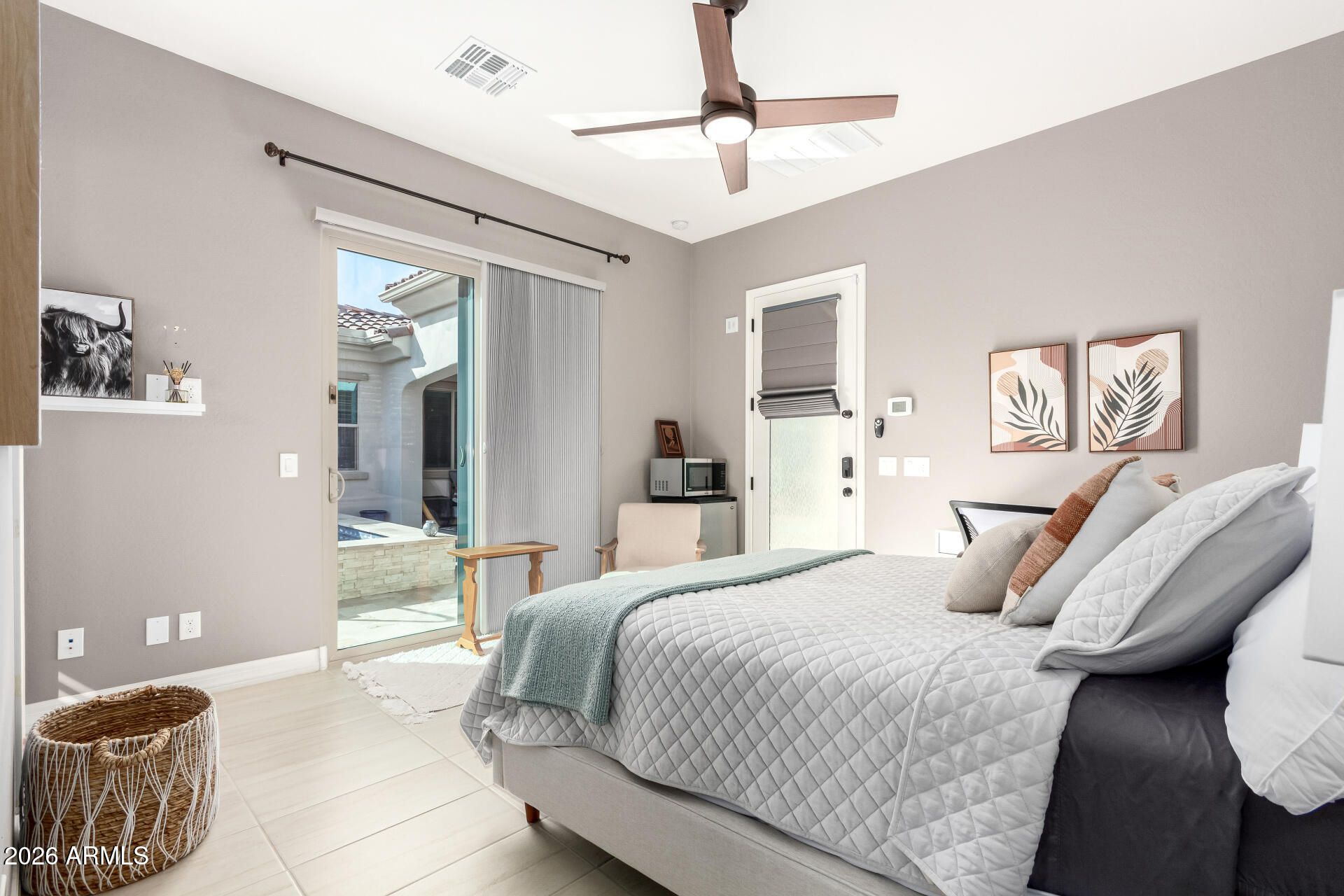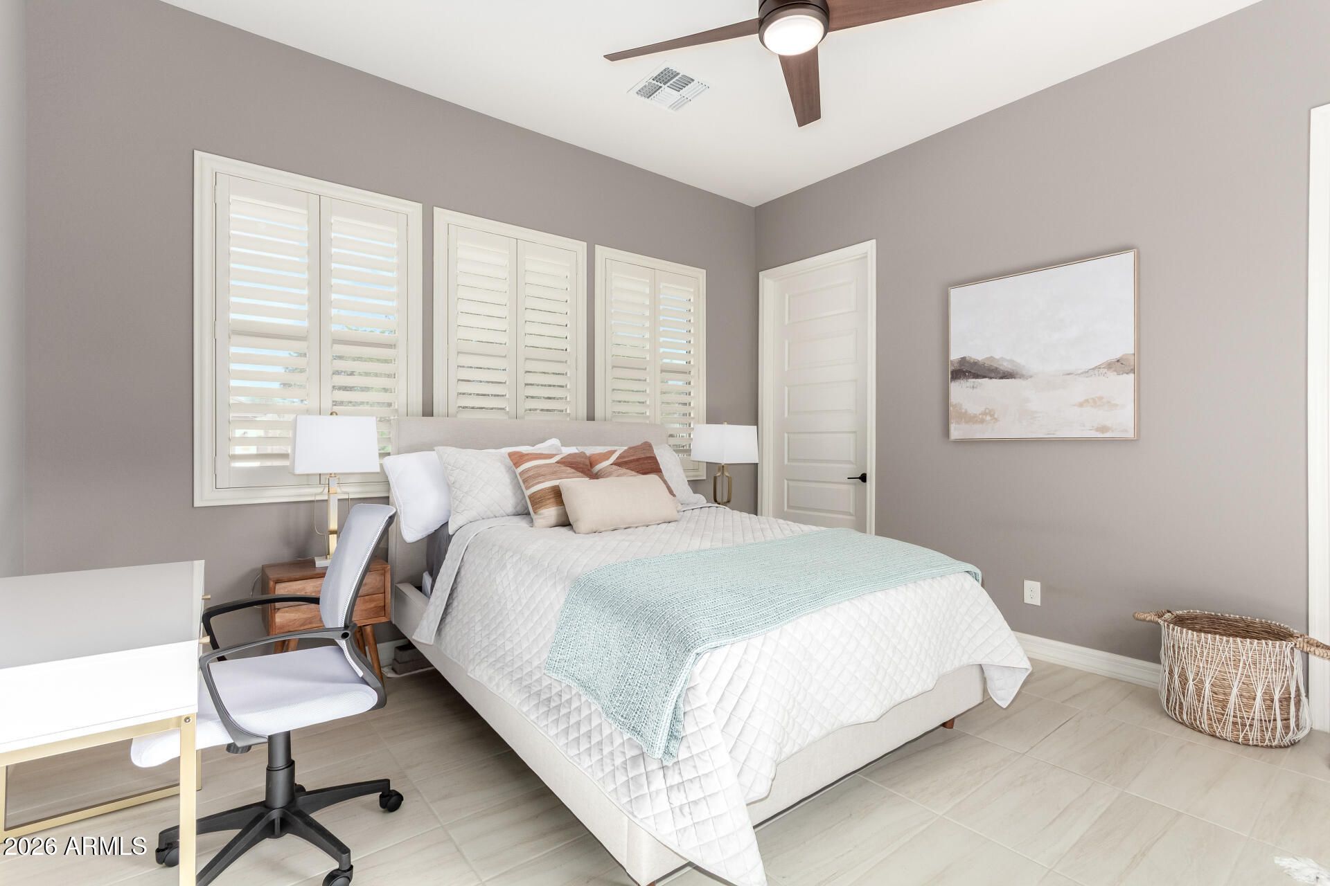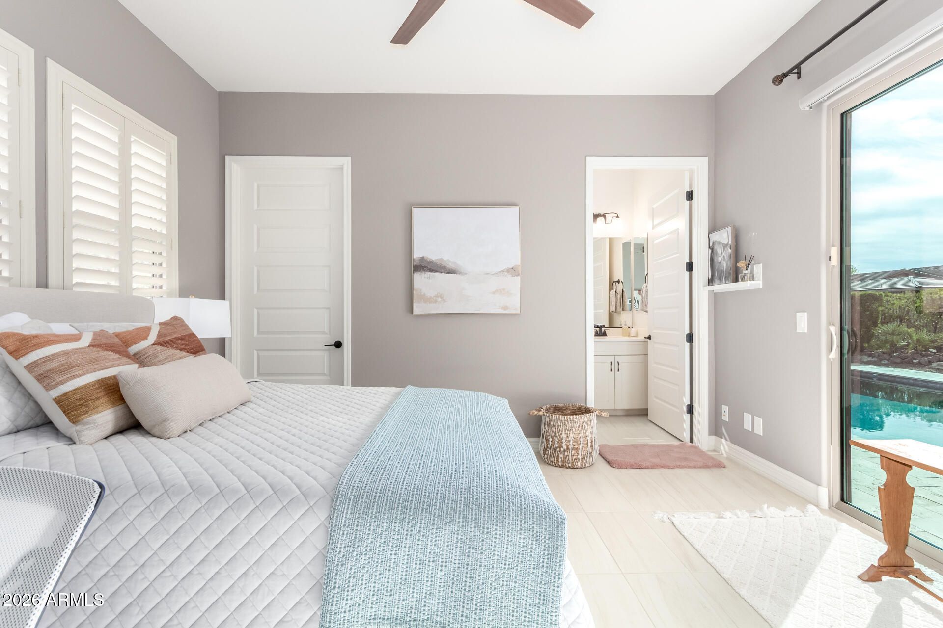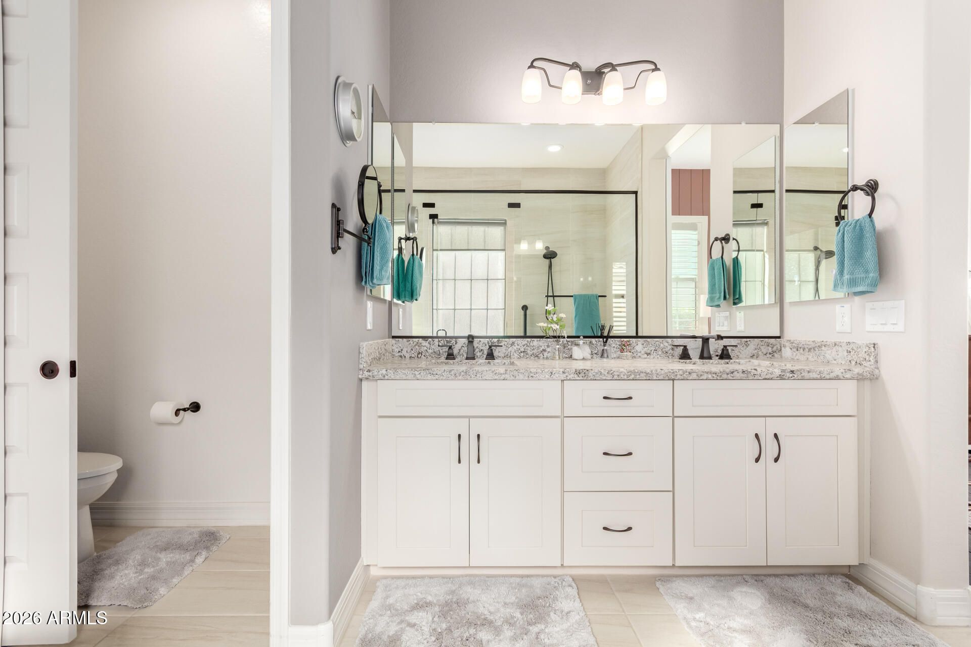 WOW! This beautiful pool home awaits you in a desirable corner lot in the sought-after Verrado! Inside, you'll find a perfect blend of style and comfort, featuring tile floors, contemporary lighting, plantation shutters, and a neutral palette. The gourmet kitchen is a chef's delight, complete with shaker cabinets adorned with crown molding, granite countertops, stainless steel appliances, and an island with a breakfast bar, perfect for entertaining and casual meals. Get a good night's rest in the main suite, offering a bathroom with double sinks. The laundry room and 2-car garage feature attached cabinets for added storage. Your guests will enjoy privacy with a spacious casita with a bathroom and a walk-in closet. Out back, your oasis showcases a covered patio ideal for morning coffee, elegant travertine pavers, a grass area, sparkling pool, and a relaxing spa! Home has paid off solar panels. Check it out now! You're gonna love it!