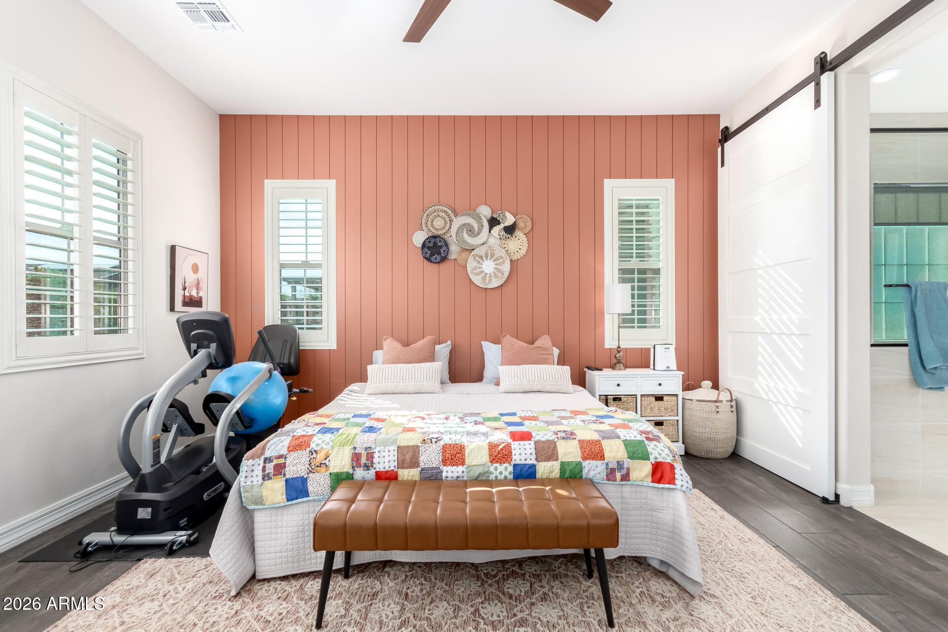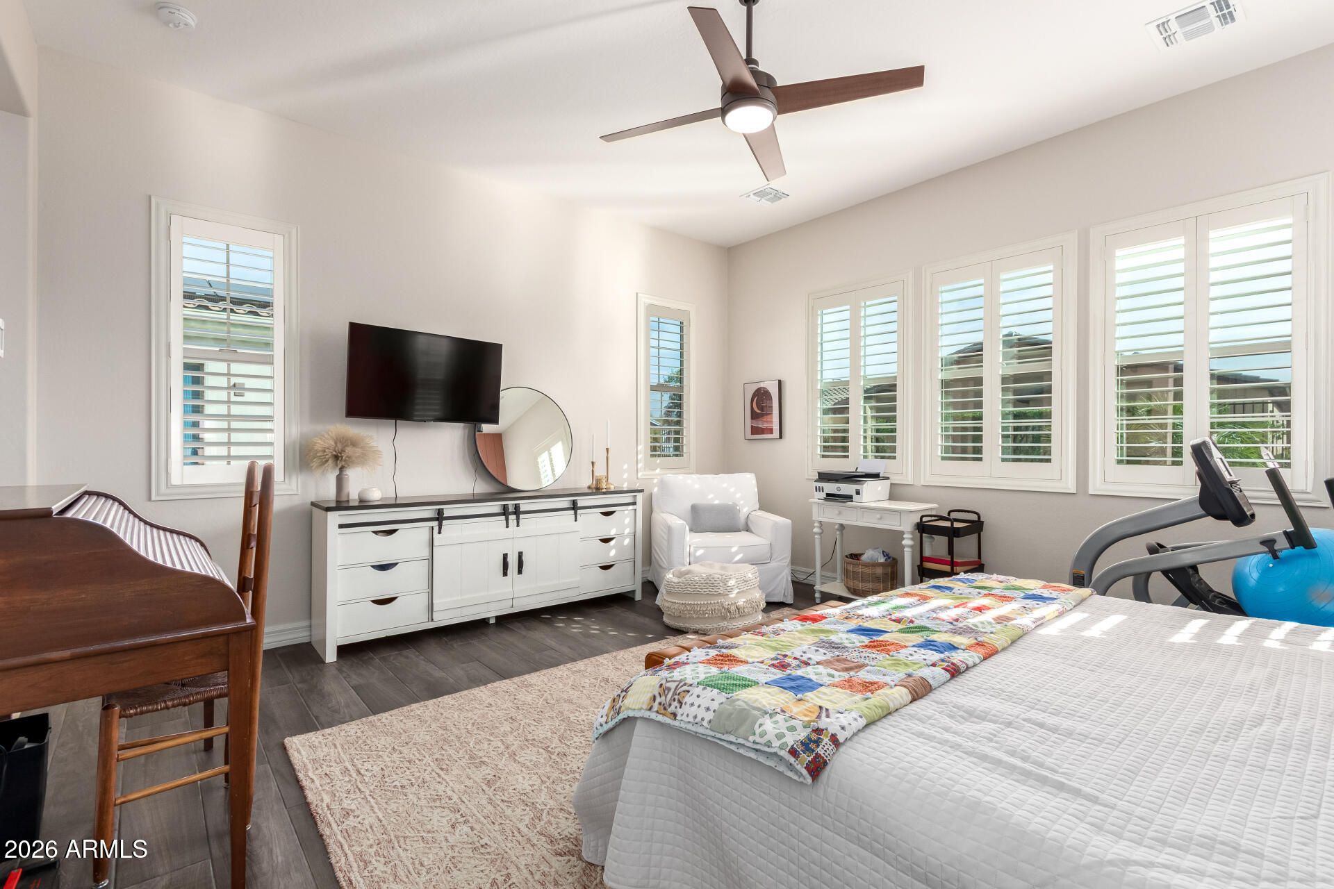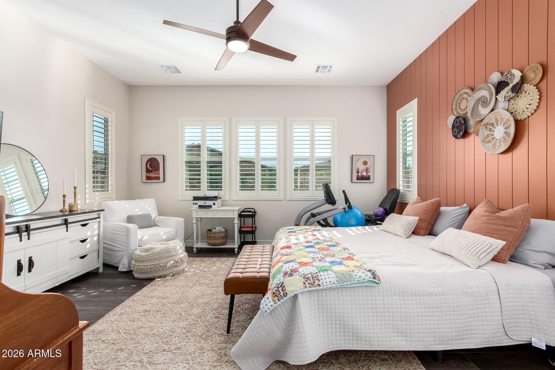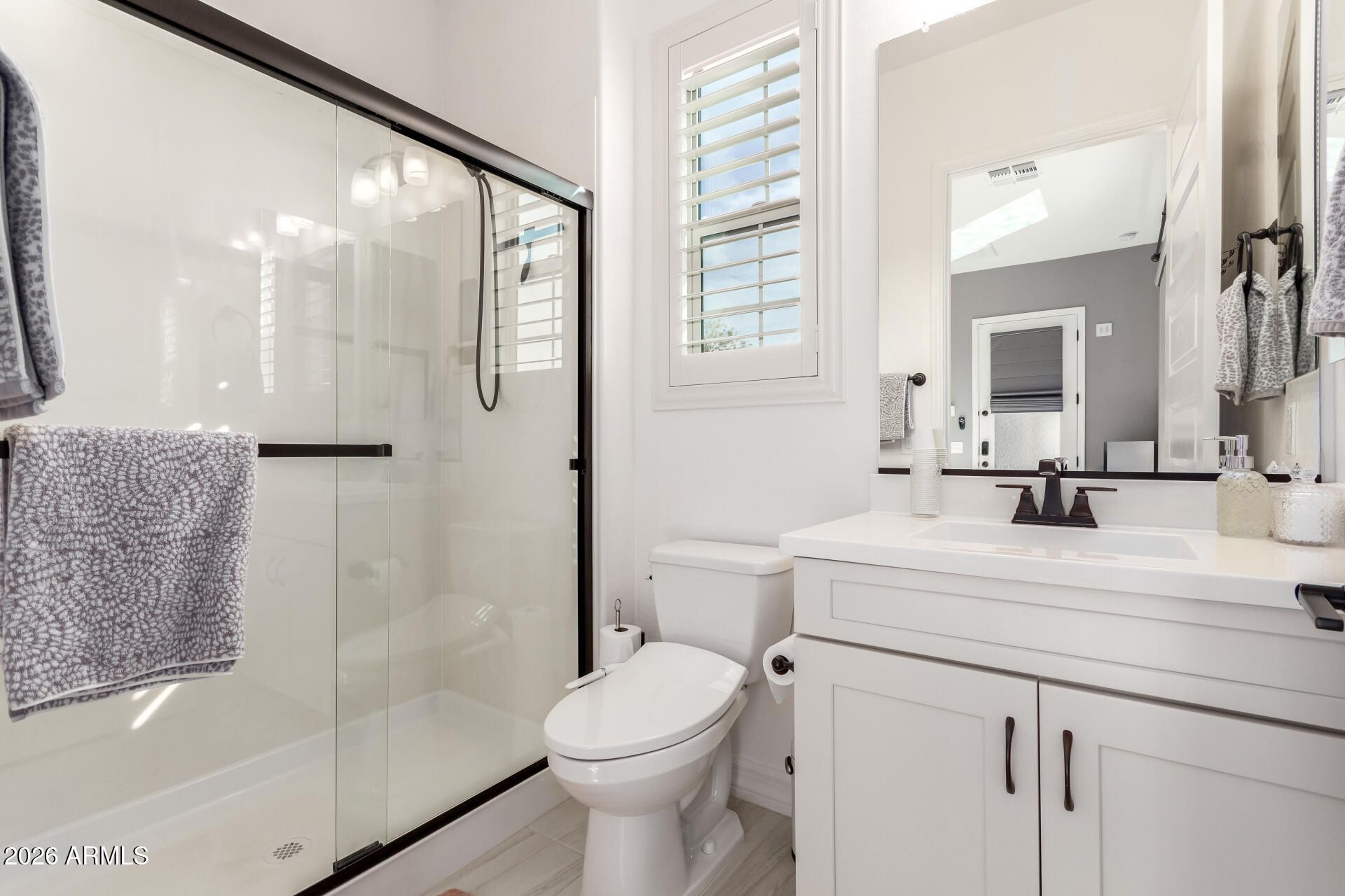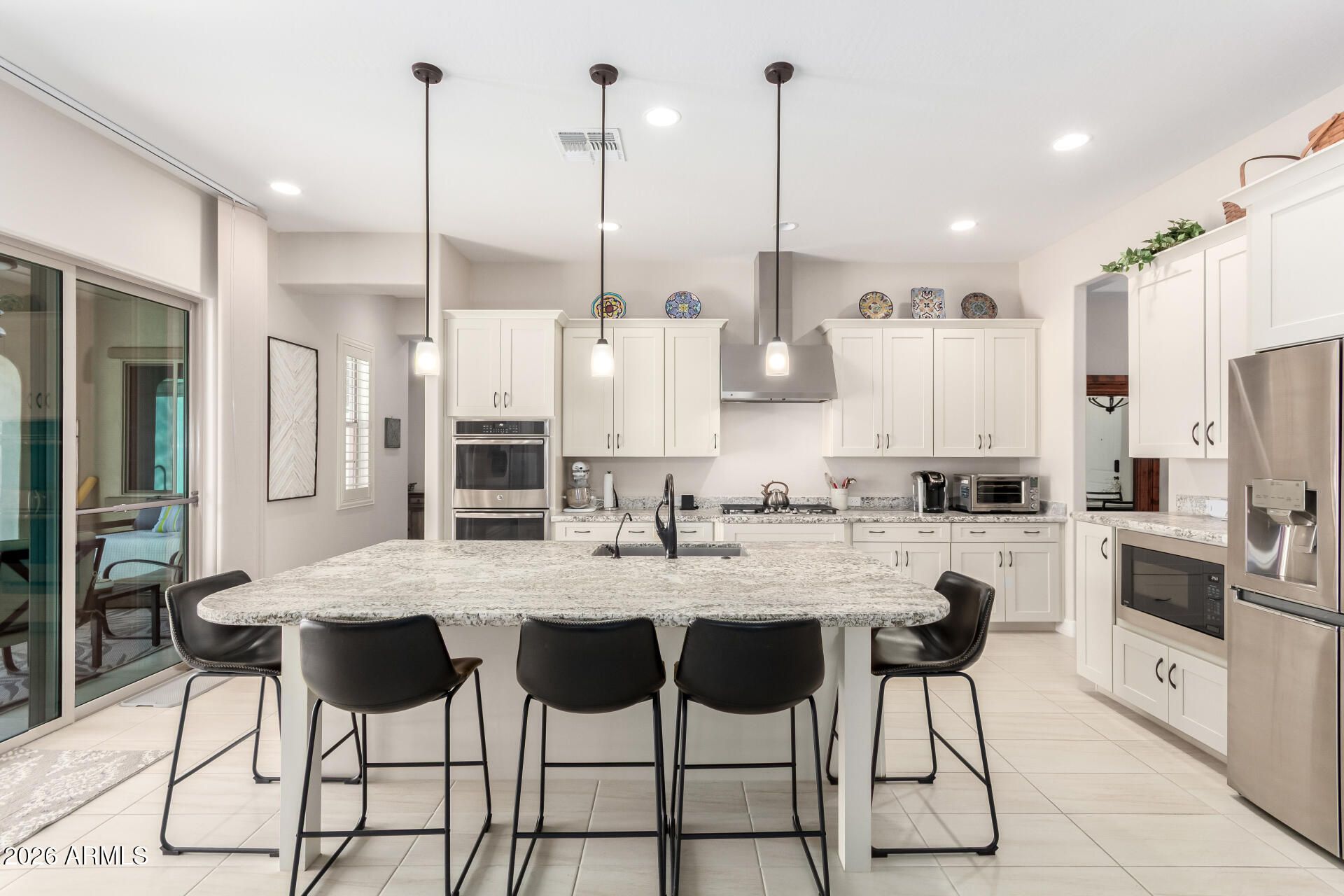 WOW! This beautiful pool home awaits you in a desirable corner lot in the sought-after Verrado! Inside, you'll find a perfect blend of style and comfort, featuring tile floors, contemporary lighting, plantation shutters, and a neutral palette. The gourmet kitchen is a chef's delight, complete with shaker cabinets adorned with crown molding, granite countertops, stainless steel appliances, and an island with a breakfast bar, perfect for entertaining and casual meals. Get a good night's rest in the main suite, offering a bathroom with double sinks. The laundry room and 2-car garage feature attached cabinets for added storage. Your guests will enjoy privacy with a spacious casita with a bathroom and a walk-in closet. Out back, your oasis showcases a covered patio ideal for morning coffee, elegant travertine pavers, a grass area, sparkling pool, and a relaxing spa! Home has paid off solar panels. Check it out now! You're gonna love it!
