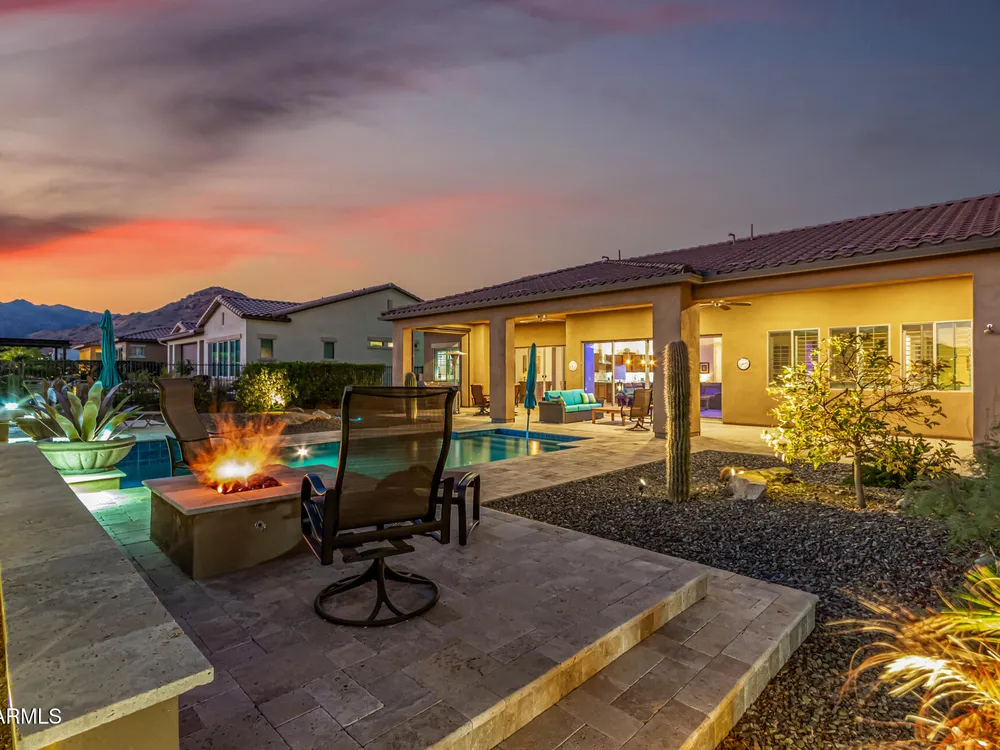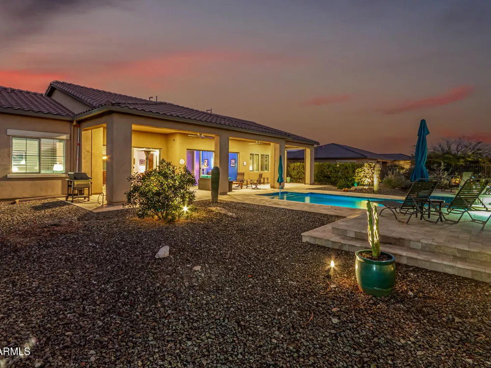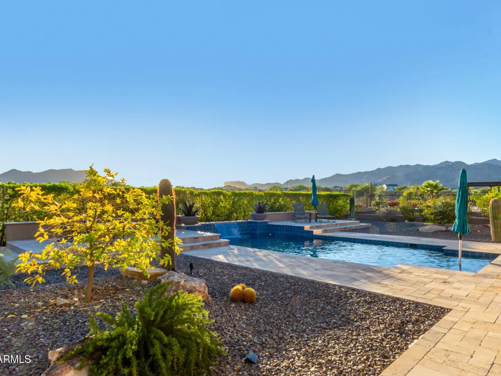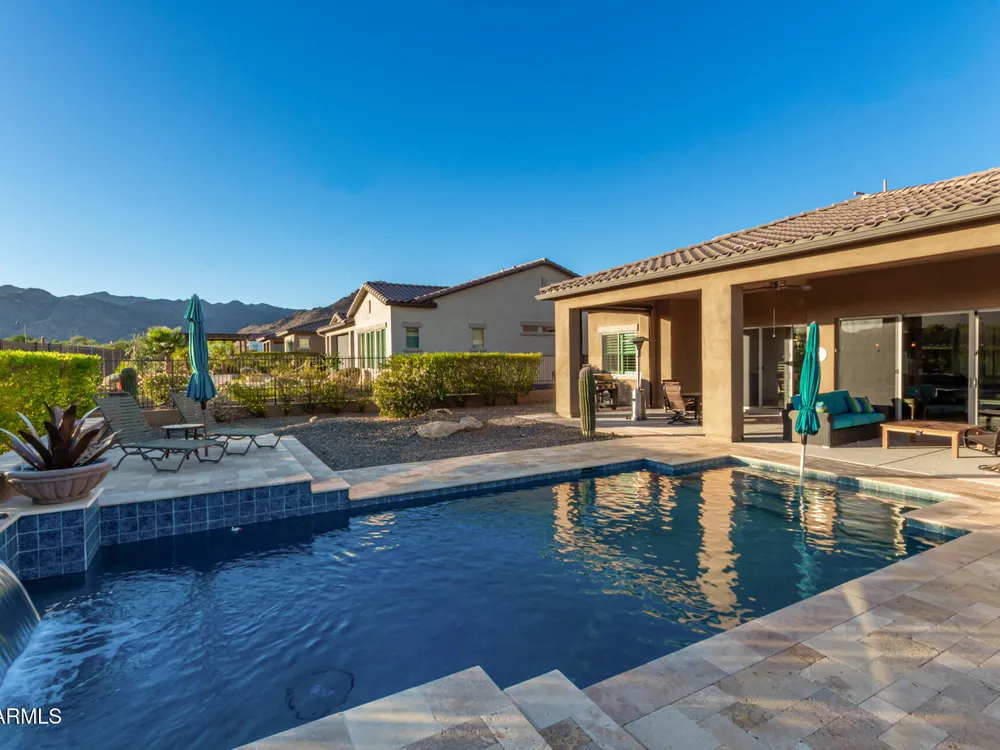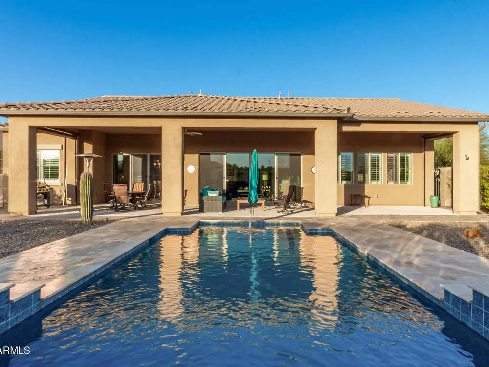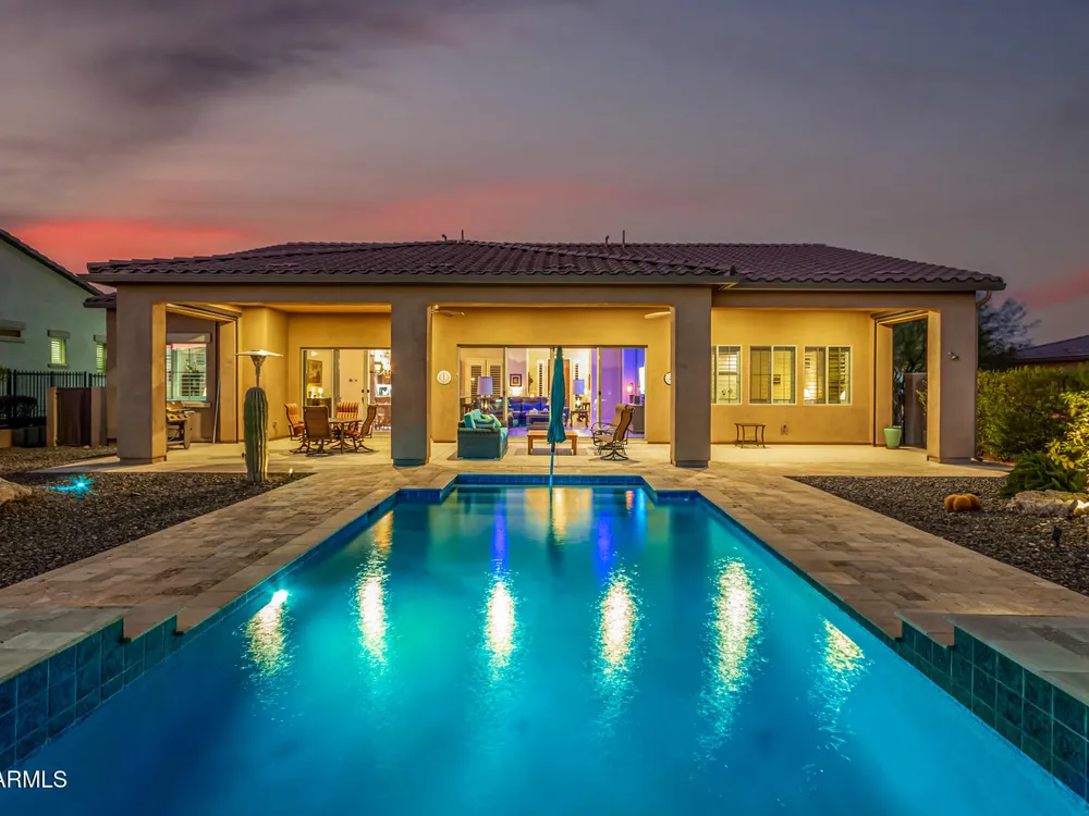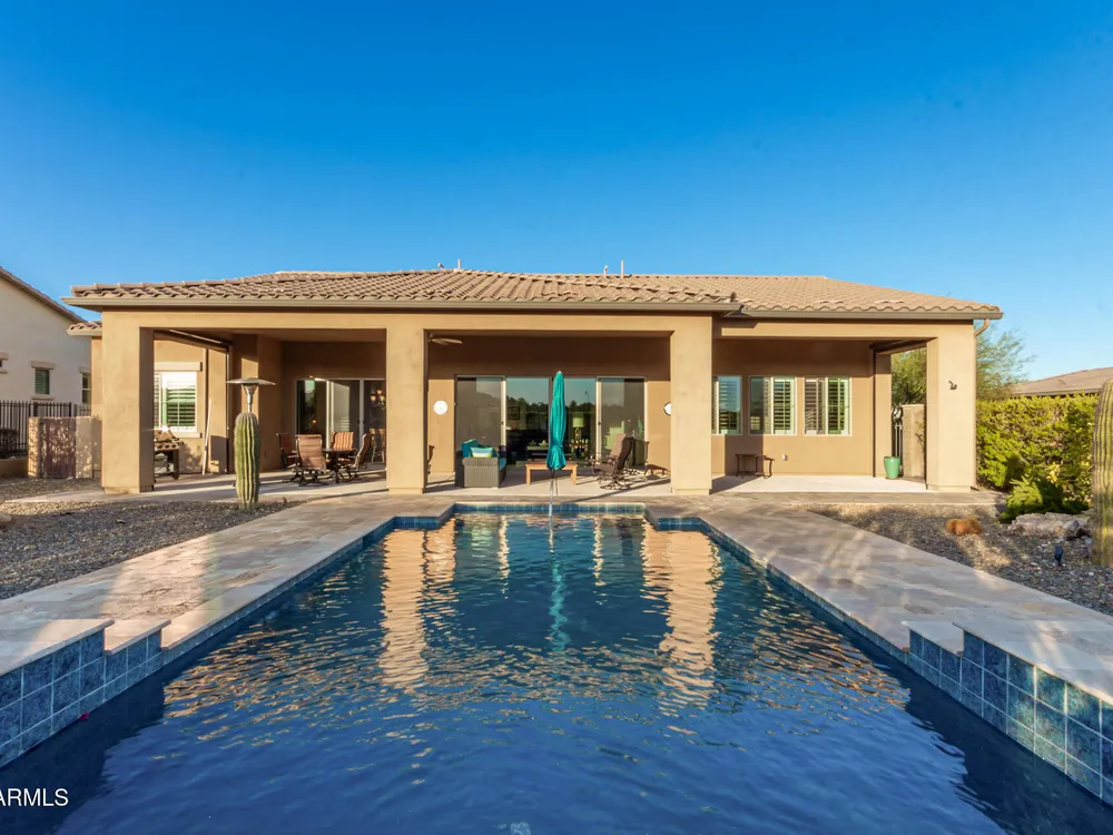 Welcome to your desert retreat in Verrado's Victory District where resort living meets David Weekley quality. This 3 bed 2.5 bath home sits on a 10,400 sf golf course lot w/mountain views & a sparkling saltwater pool. Enjoy seamless indoor outdoor living w/retractable patio screens, travertine deck, gas firepit, & hookups for grilling or outdoor heating. The open floor plan features a gourmet kitchen with a massive granite island, stainless appliances, & energy efficient design throughout. Split bedrooms provide privacy, & the primary suite offers a spa-like bath w/soaking tub, glass shower, & walk-in closet. A 3 car tandem garage adds space for a golf cart or workshop. A 55+ community w/golf, pickleball, pools, & clubhouse amenities. Luxury, efficiency, & Comfort come together here.