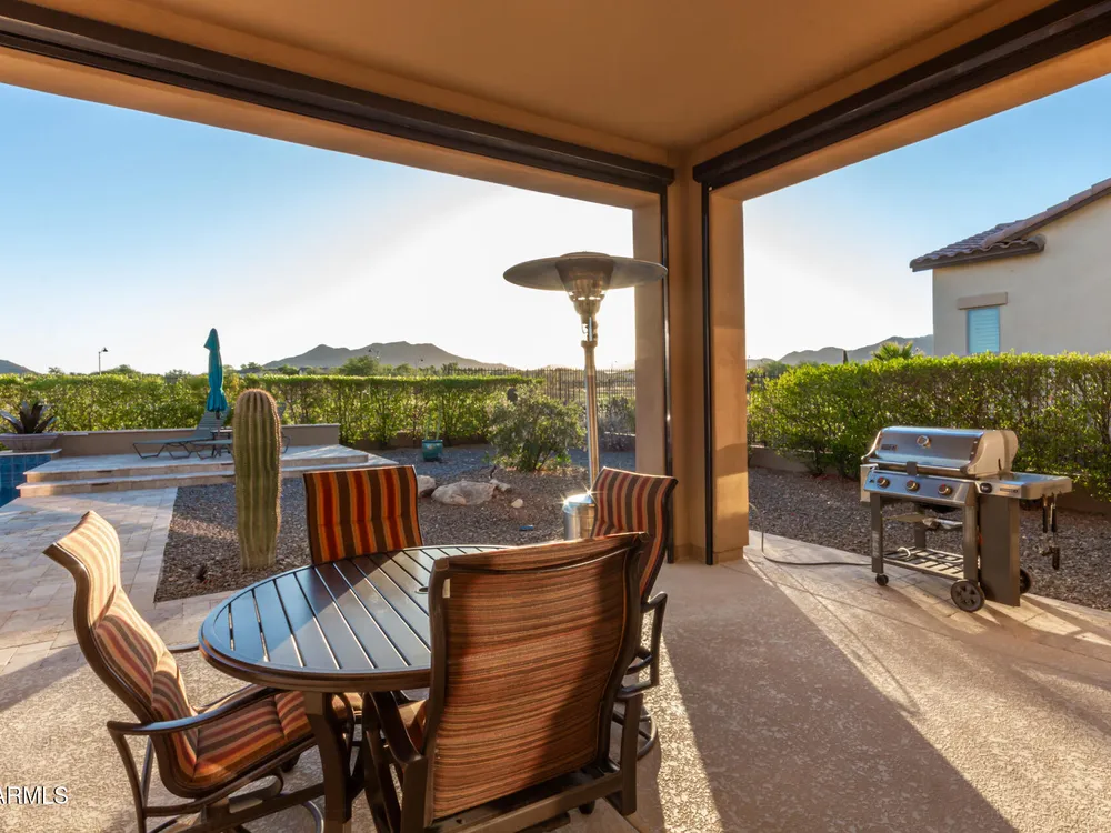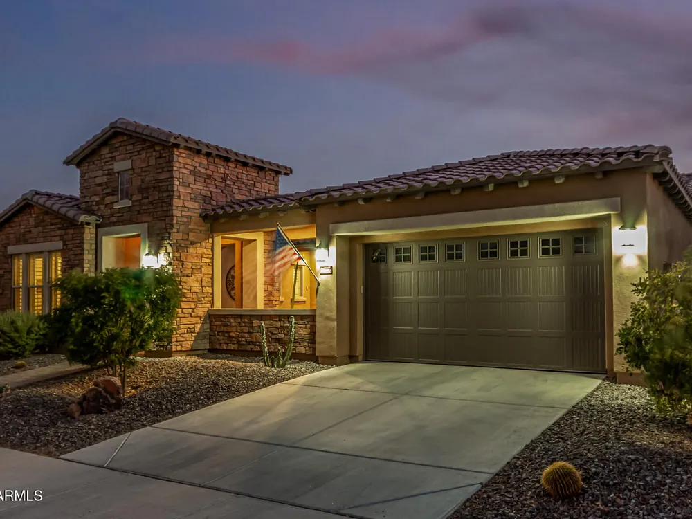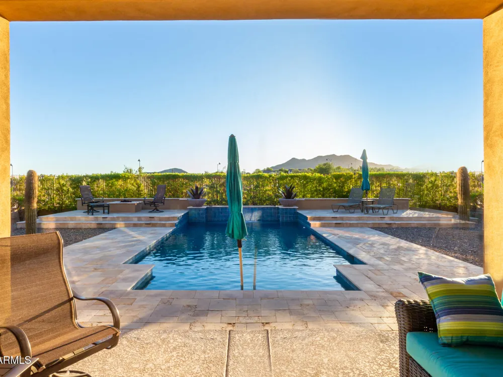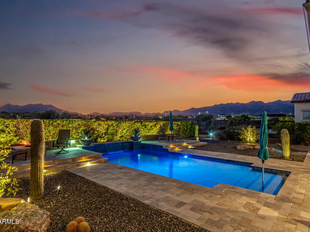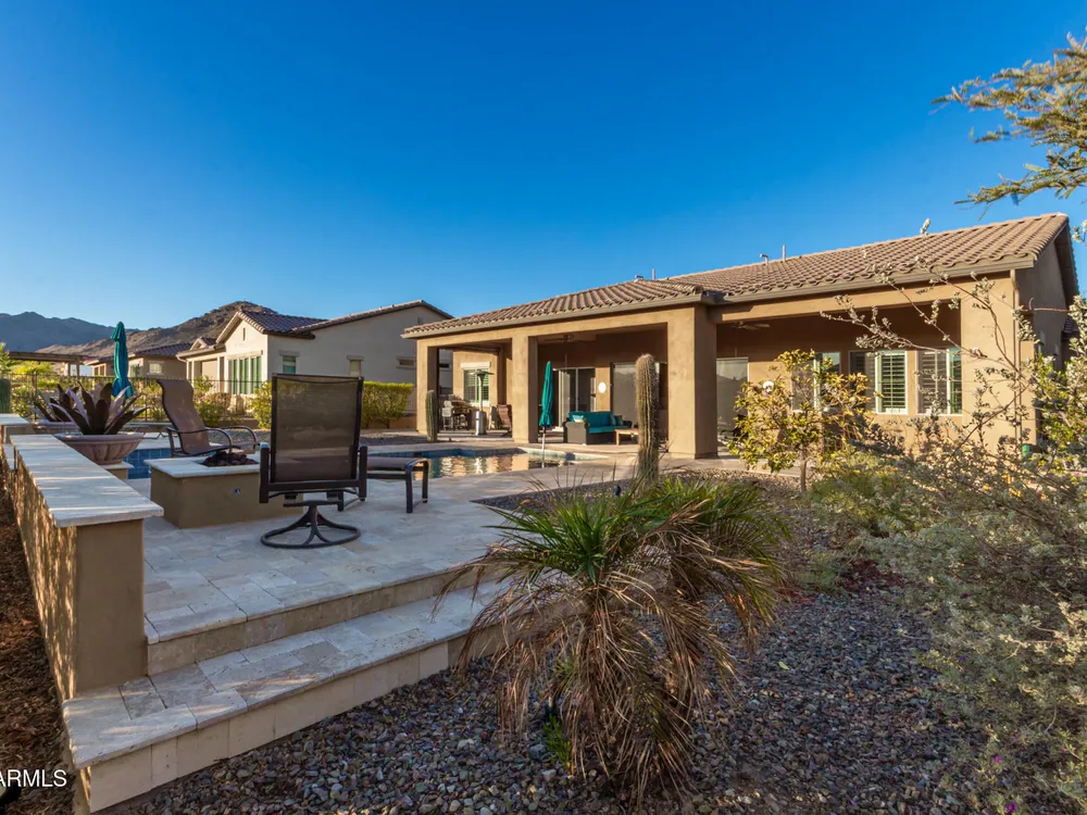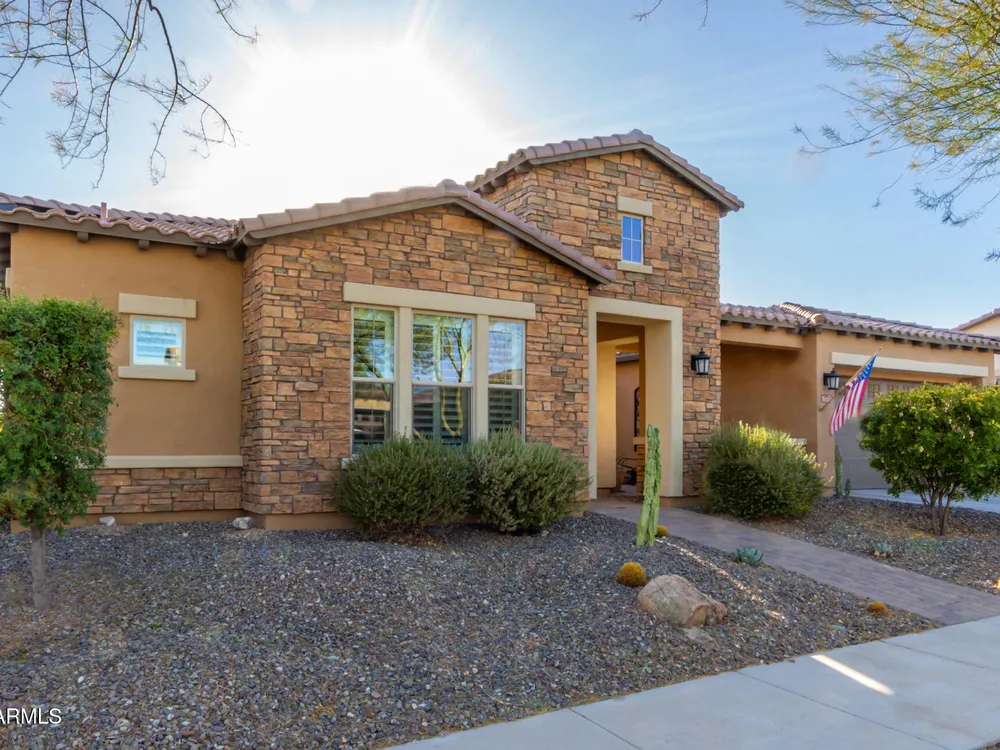 Welcome to your desert retreat in Verrado's Victory District where resort living meets David Weekley quality. This 3 bed 2.5 bath home sits on a 10,400 sf golf course lot w/mountain views & a sparkling saltwater pool. Enjoy seamless indoor outdoor living w/retractable patio screens, travertine deck, gas firepit, & hookups for grilling or outdoor heating. The open floor plan features a gourmet kitchen with a massive granite island, stainless appliances, & energy efficient design throughout. Split bedrooms provide privacy, & the primary suite offers a spa-like bath w/soaking tub, glass shower, & walk-in closet. A 3 car tandem garage adds space for a golf cart or workshop. A 55+ community w/golf, pickleball, pools, & clubhouse amenities. Luxury, efficiency, & Comfort come together here.