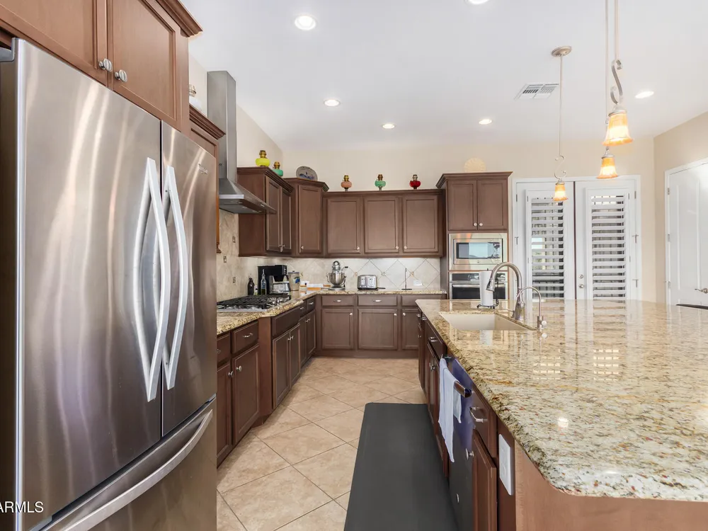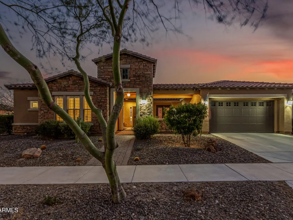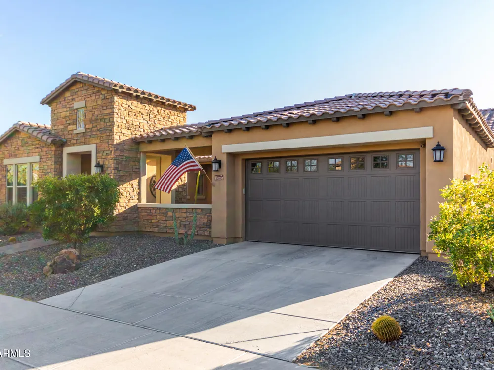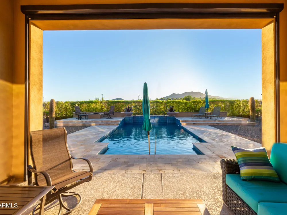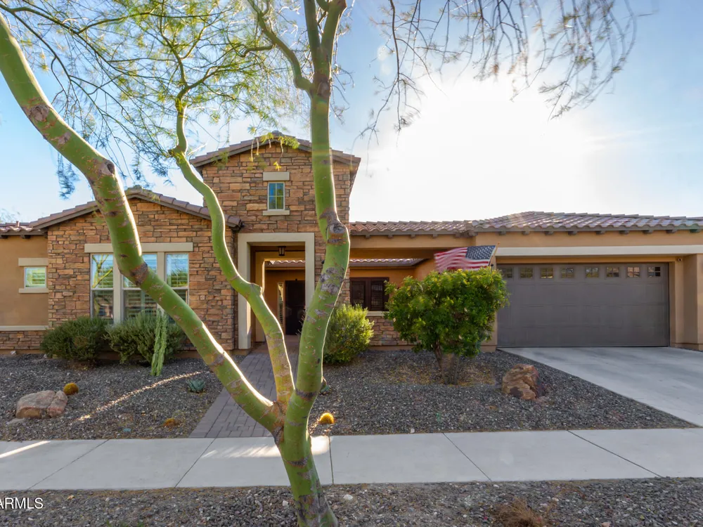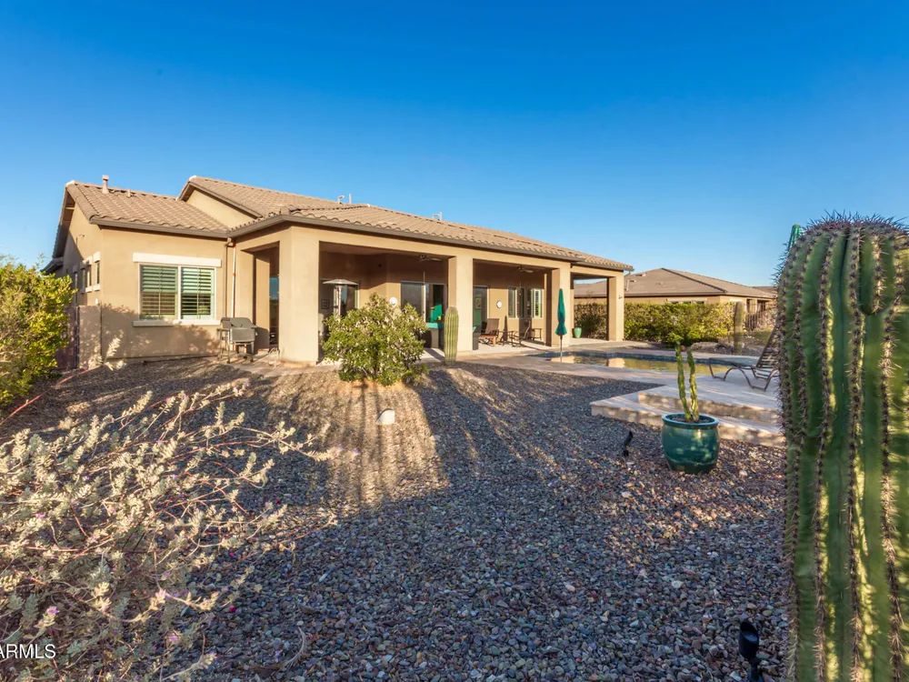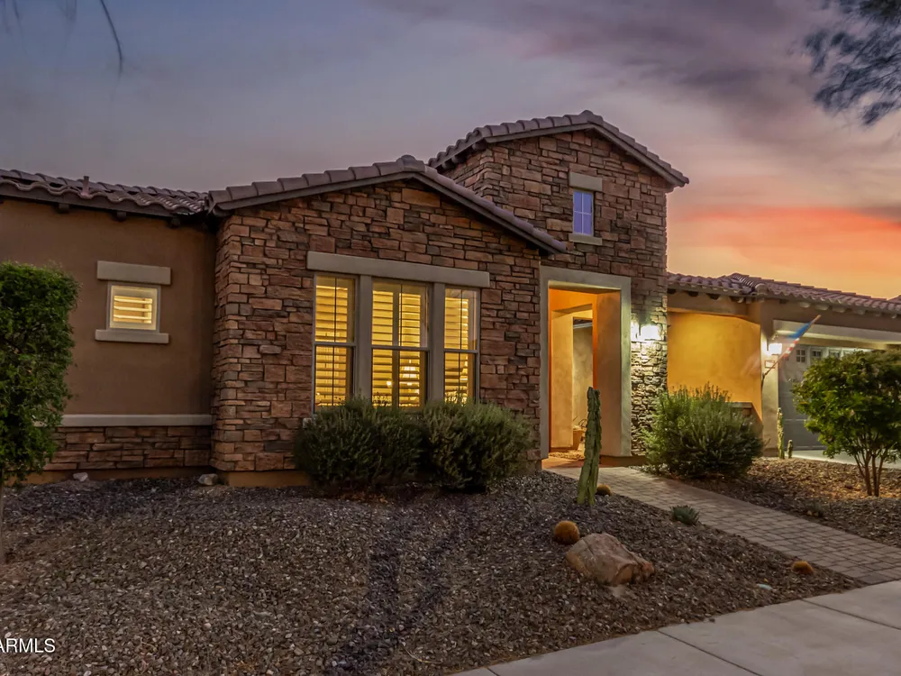 Welcome to your desert retreat in Verrado's Victory District where resort living meets David Weekley quality. This 3 bed 2.5 bath home sits on a 10,400 sf golf course lot w/mountain views & a sparkling saltwater pool. Enjoy seamless indoor outdoor living w/retractable patio screens, travertine deck, gas firepit, & hookups for grilling or outdoor heating. The open floor plan features a gourmet kitchen with a massive granite island, stainless appliances, & energy efficient design throughout. Split bedrooms provide privacy, & the primary suite offers a spa-like bath w/soaking tub, glass shower, & walk-in closet. A 3 car tandem garage adds space for a golf cart or workshop. A 55+ community w/golf, pickleball, pools, & clubhouse amenities. Luxury, efficiency, & Comfort come together here.