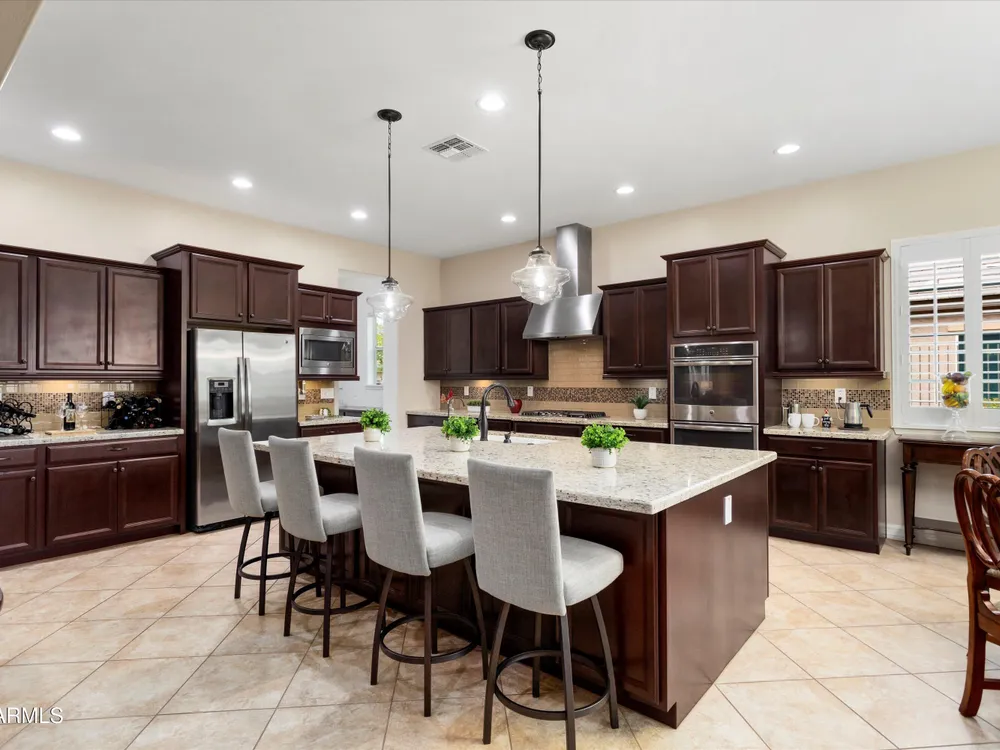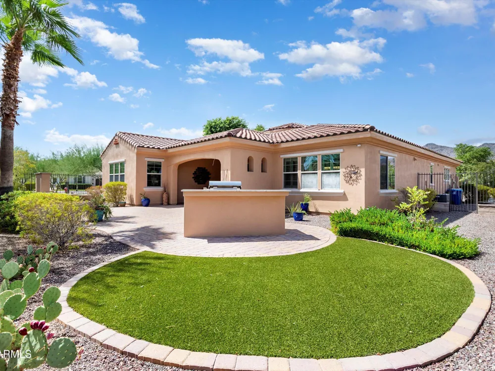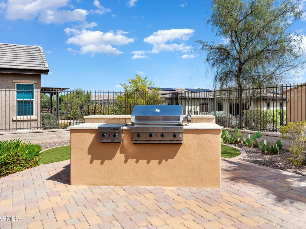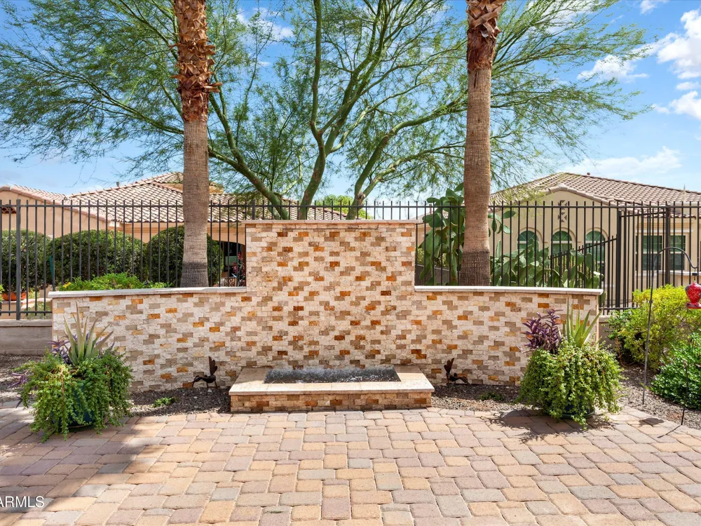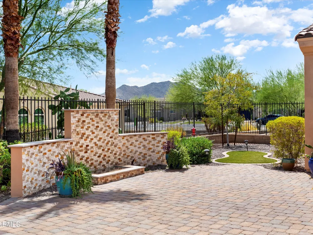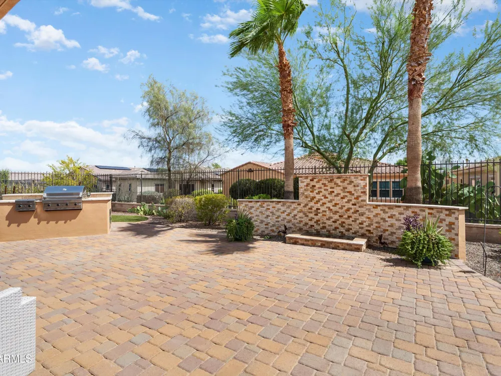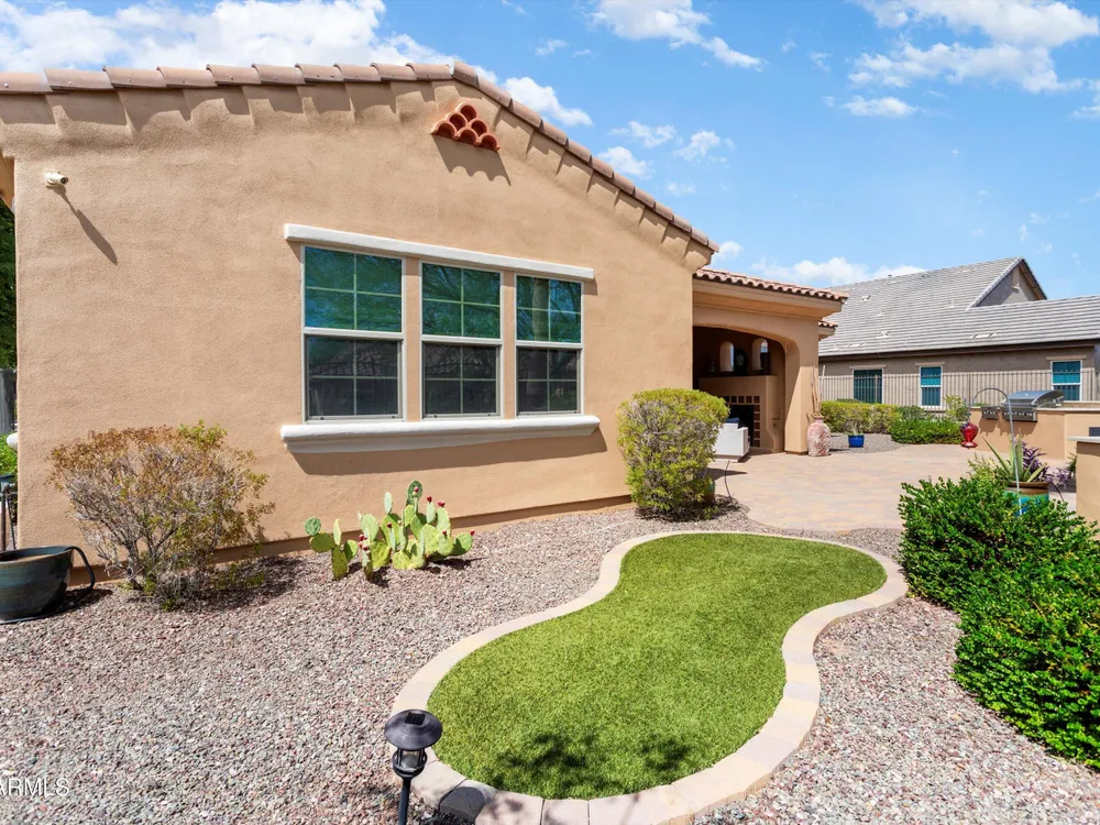 STUNNING MARACAY HOME IN VICTORY - Nestled at the foothills of the White Tank Mountains, this exquisitely upgraded residence is truly a dream come true. Featuring a breathtaking 18-foot rotunda entry illuminated by a custom chandelier from RH, this home is both energy-efficient and meticulously maintained. With 3 bedrooms, 3 bathrooms, and a den/study, the space highlights a gourmet kitchen equipped with custom cherry cabinetry, convenient pull-outs, under-mount lighting, upgraded granite countertops, stainless steel Profile appliances, double ovens, and a stainless hood over the gas cooktop. An intricately designed tile backsplash and a generous walk-in pantry enhance the kitchen's functionality. Abundant natural light flows throughout the home, thanks to expansive glass sliding doors and large windows along the southern exterior. Other notable features include an extended tile shower in the master bath, an enlarged master bedroom closet, plantation shutters throughout, and surround sound wiring in the great room and outdoor patio. Step outside to enjoy a built-in outdoor kitchen and an elegantly lit water feature, complemented by a cozy gas fireplaceperfect for relaxing and entertaining during Arizona's cool nights from September to April. Misting system for the warmer days of summer. Don't miss your chance to own this incredible home with over $70K in upgrades in the vibrant Victory at Verrado community.