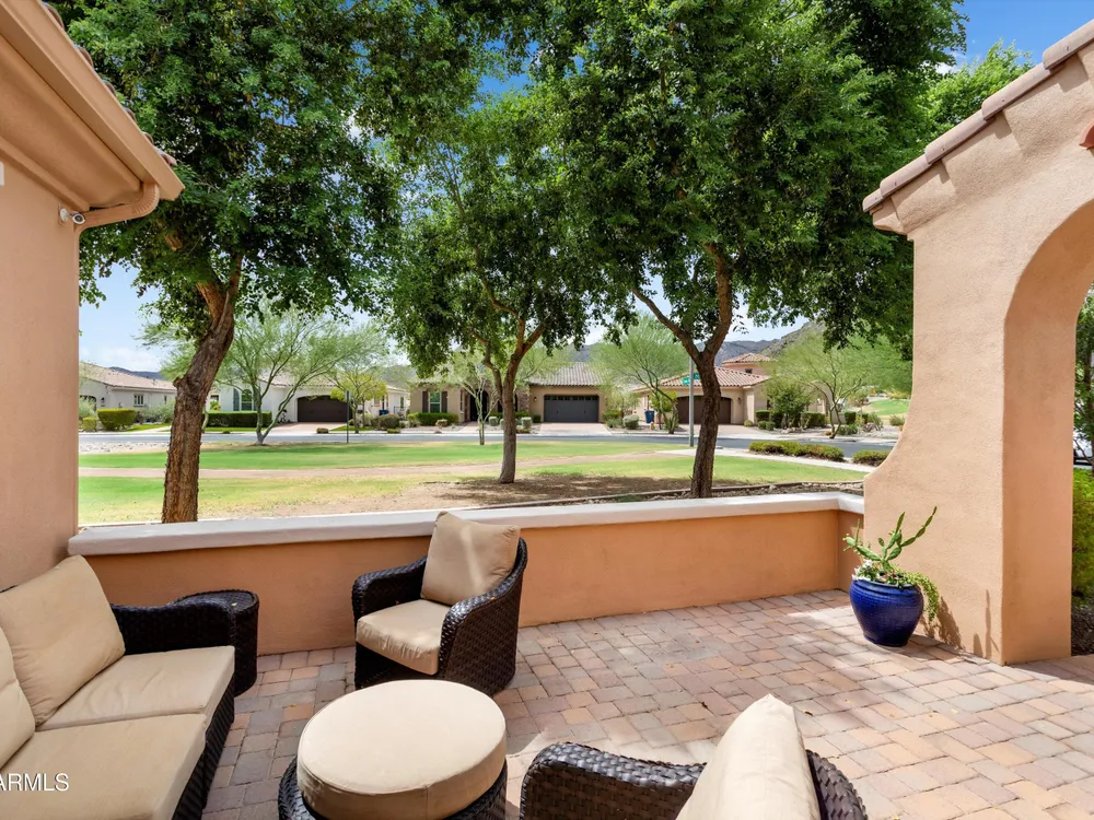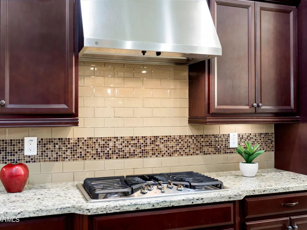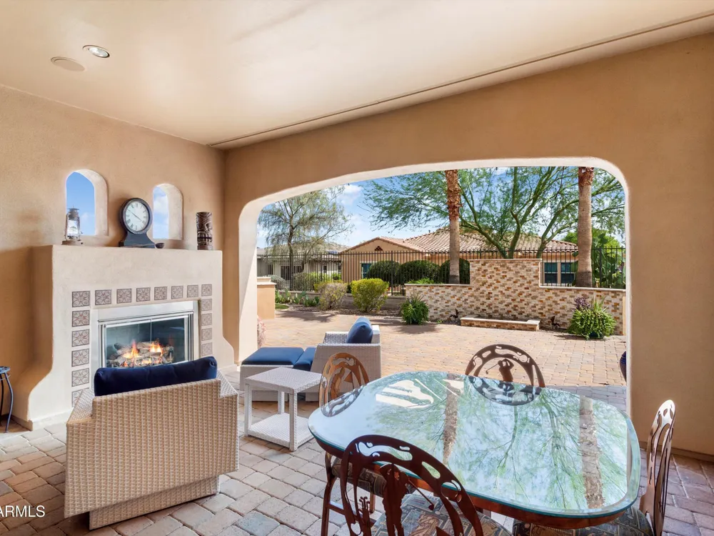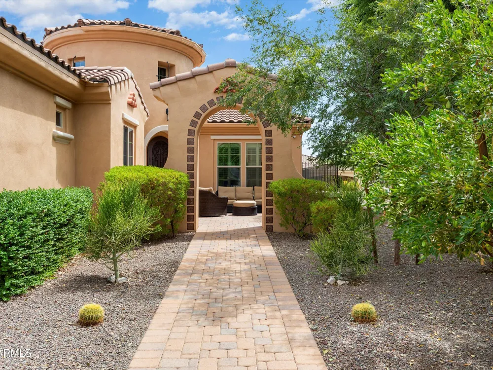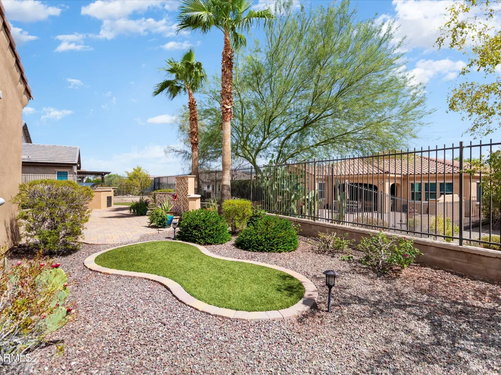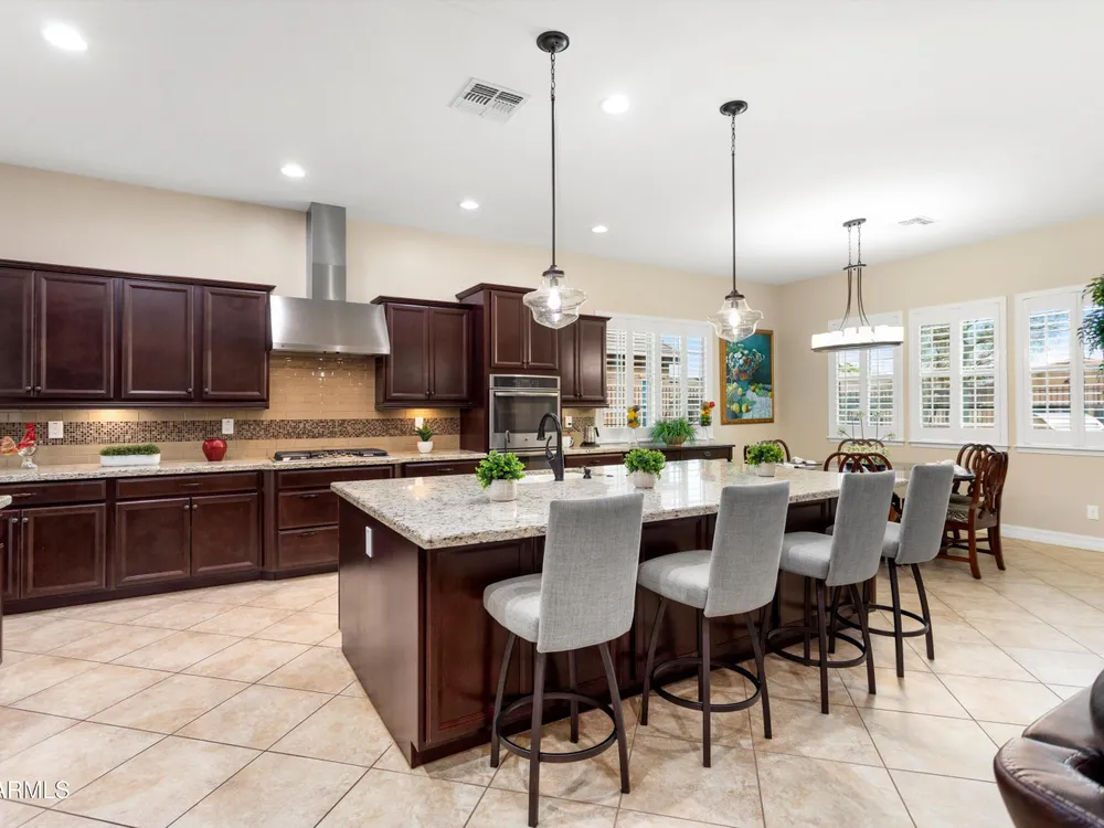 STUNNING MARACAY HOME IN VICTORY - Nestled at the foothills of the White Tank Mountains, this exquisitely upgraded residence is truly a dream come true. Featuring a breathtaking 18-foot rotunda entry illuminated by a custom chandelier from RH, this home is both energy-efficient and meticulously maintained. With 3 bedrooms, 3 bathrooms, and a den/study, the space highlights a gourmet kitchen equipped with custom cherry cabinetry, convenient pull-outs, under-mount lighting, upgraded granite countertops, stainless steel Profile appliances, double ovens, and a stainless hood over the gas cooktop. An intricately designed tile backsplash and a generous walk-in pantry enhance the kitchen's functionality. Abundant natural light flows throughout the home, thanks to expansive glass sliding doors and large windows along the southern exterior. Other notable features include an extended tile shower in the master bath, an enlarged master bedroom closet, plantation shutters throughout, and surround sound wiring in the great room and outdoor patio. Step outside to enjoy a built-in outdoor kitchen and an elegantly lit water feature, complemented by a cozy gas fireplaceperfect for relaxing and entertaining during Arizona's cool nights from September to April. Misting system for the warmer days of summer. Don't miss your chance to own this incredible home with over $70K in upgrades in the vibrant Victory at Verrado community.