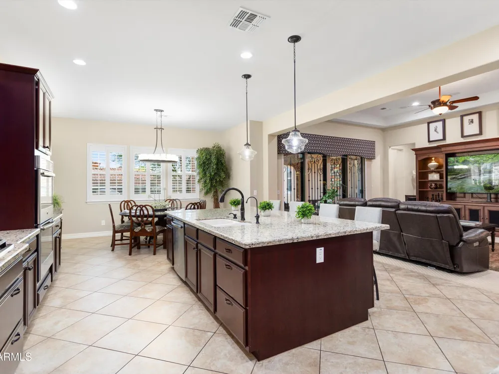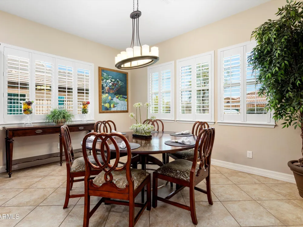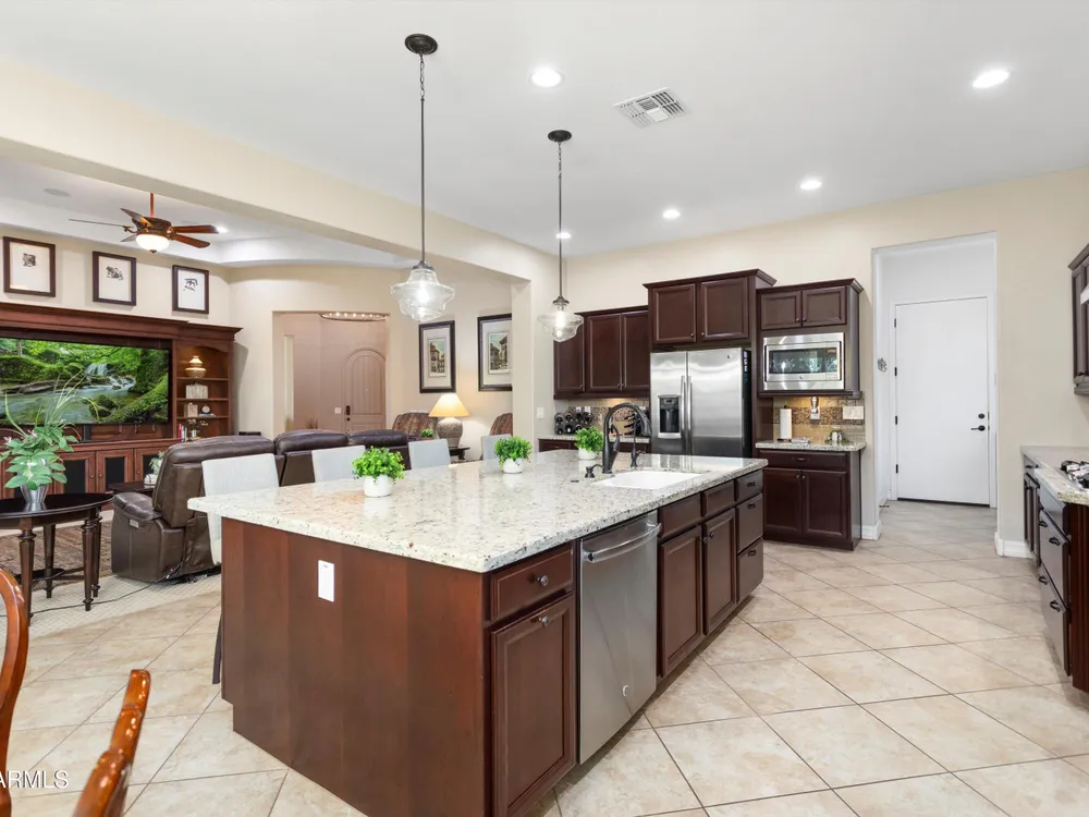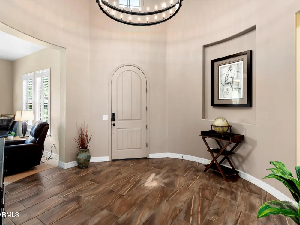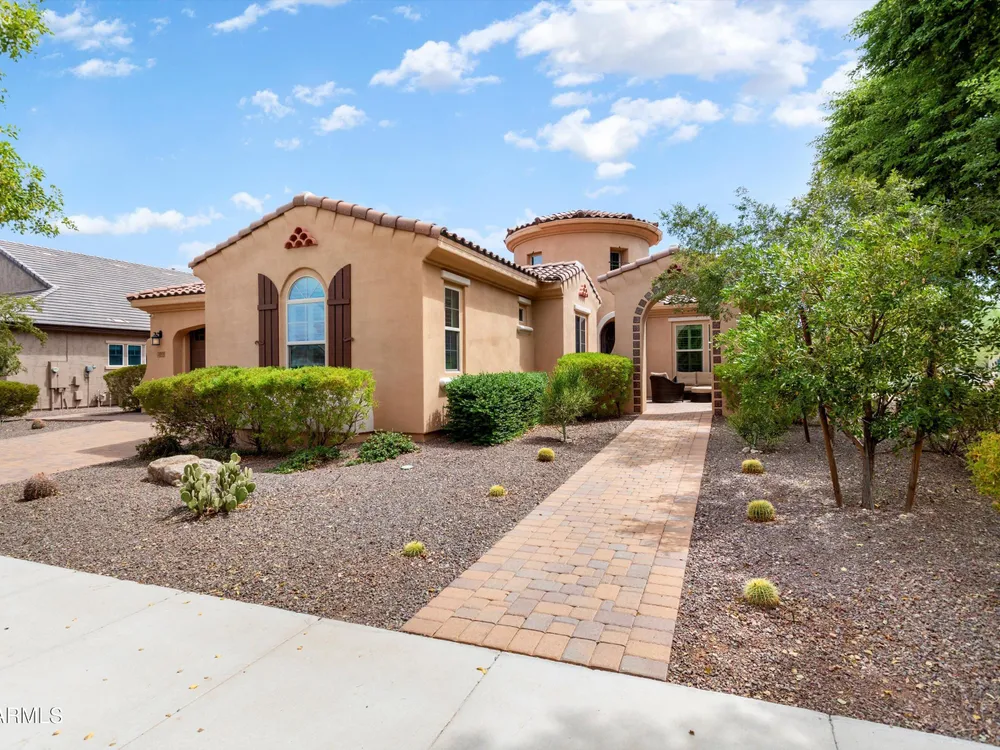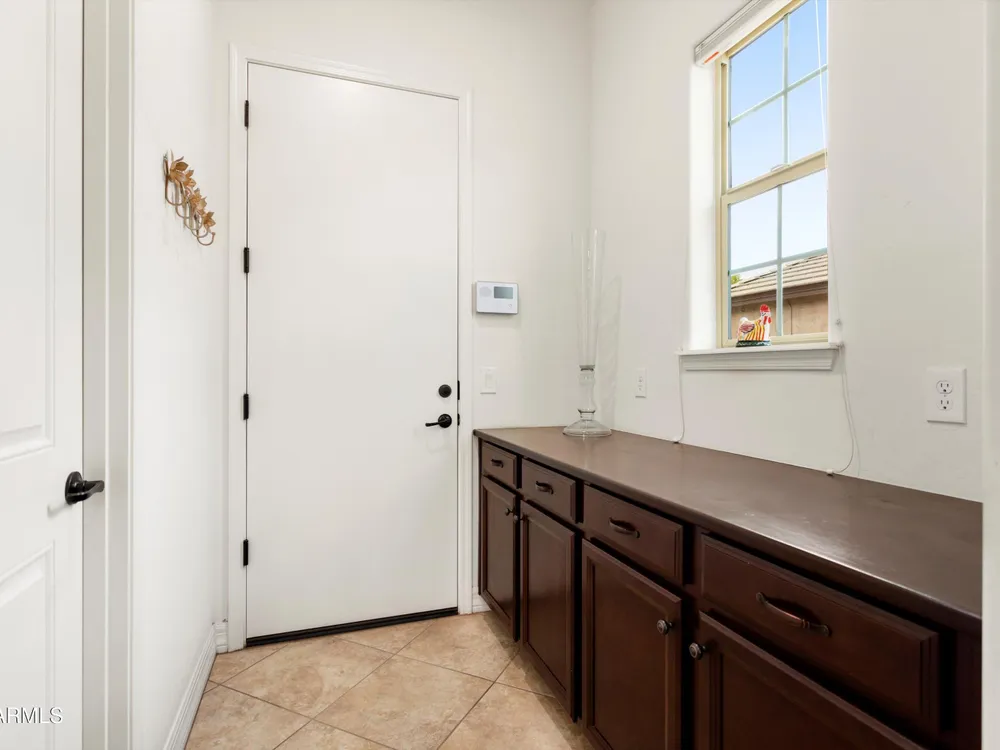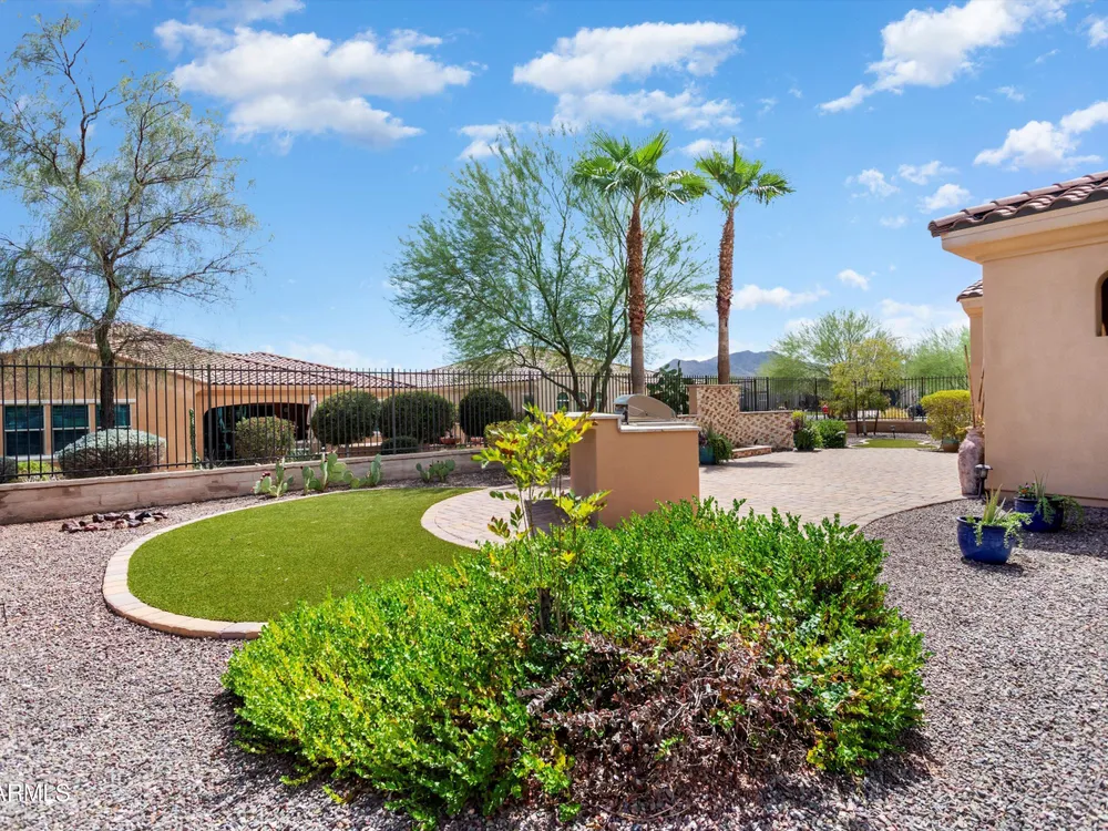 STUNNING MARACAY HOME IN VICTORY - Nestled at the foothills of the White Tank Mountains, this exquisitely upgraded residence is truly a dream come true. Featuring a breathtaking 18-foot rotunda entry illuminated by a custom chandelier from RH, this home is both energy-efficient and meticulously maintained. With 3 bedrooms, 3 bathrooms, and a den/study, the space highlights a gourmet kitchen equipped with custom cherry cabinetry, convenient pull-outs, under-mount lighting, upgraded granite countertops, stainless steel Profile appliances, double ovens, and a stainless hood over the gas cooktop. An intricately designed tile backsplash and a generous walk-in pantry enhance the kitchen's functionality. Abundant natural light flows throughout the home, thanks to expansive glass sliding doors and large windows along the southern exterior. Other notable features include an extended tile shower in the master bath, an enlarged master bedroom closet, plantation shutters throughout, and surround sound wiring in the great room and outdoor patio. Step outside to enjoy a built-in outdoor kitchen and an elegantly lit water feature, complemented by a cozy gas fireplaceperfect for relaxing and entertaining during Arizona's cool nights from September to April. Misting system for the warmer days of summer. Don't miss your chance to own this incredible home with over $70K in upgrades in the vibrant Victory at Verrado community.