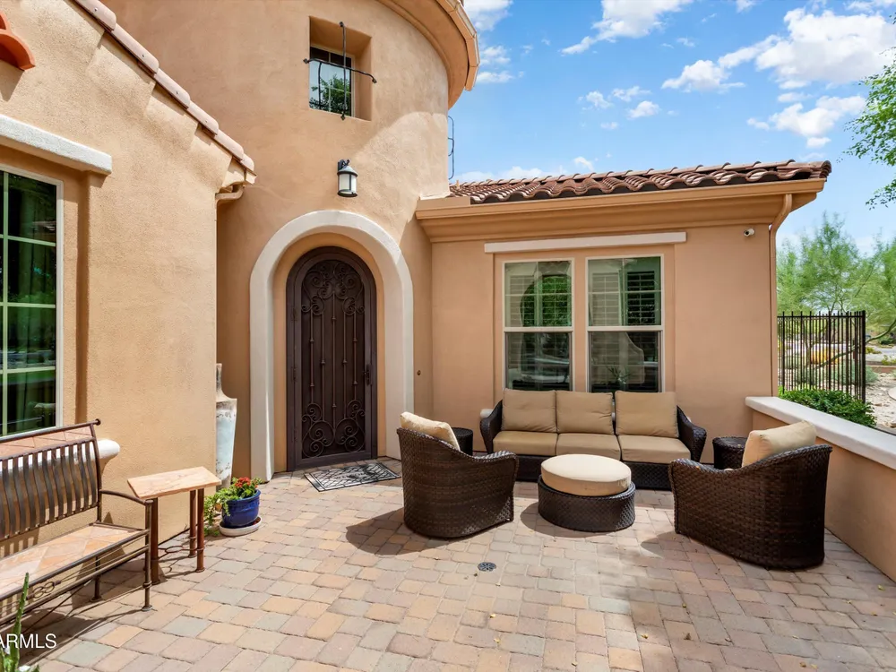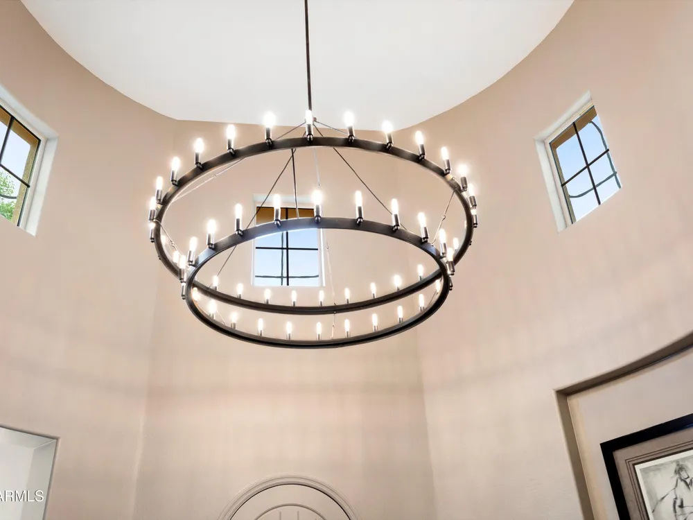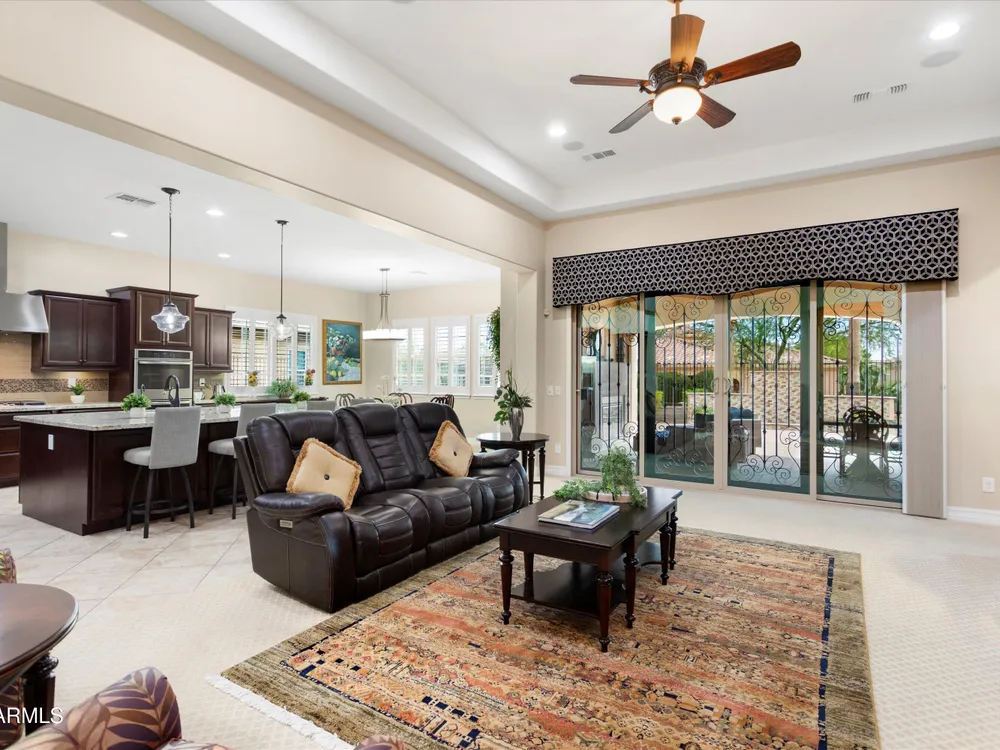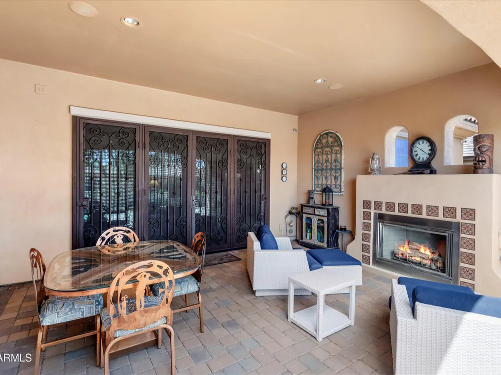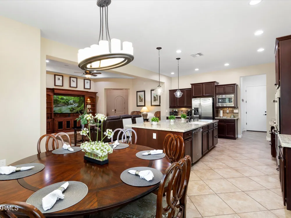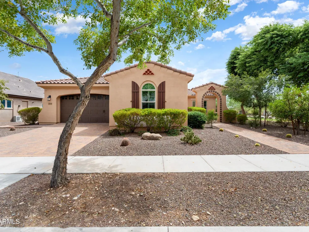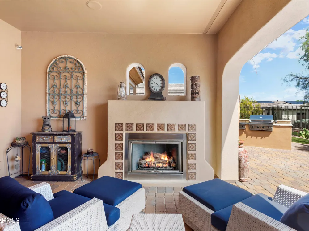 STUNNING MARACAY HOME IN VICTORY - Nestled at the foothills of the White Tank Mountains, this exquisitely upgraded residence is truly a dream come true. Featuring a breathtaking 18-foot rotunda entry illuminated by a custom chandelier from RH, this home is both energy-efficient and meticulously maintained. With 3 bedrooms, 3 bathrooms, and a den/study, the space highlights a gourmet kitchen equipped with custom cherry cabinetry, convenient pull-outs, under-mount lighting, upgraded granite countertops, stainless steel Profile appliances, double ovens, and a stainless hood over the gas cooktop. An intricately designed tile backsplash and a generous walk-in pantry enhance the kitchen's functionality. Abundant natural light flows throughout the home, thanks to expansive glass sliding doors and large windows along the southern exterior. Other notable features include an extended tile shower in the master bath, an enlarged master bedroom closet, plantation shutters throughout, and surround sound wiring in the great room and outdoor patio. Step outside to enjoy a built-in outdoor kitchen and an elegantly lit water feature, complemented by a cozy gas fireplaceperfect for relaxing and entertaining during Arizona's cool nights from September to April. Misting system for the warmer days of summer. Don't miss your chance to own this incredible home with over $70K in upgrades in the vibrant Victory at Verrado community.
