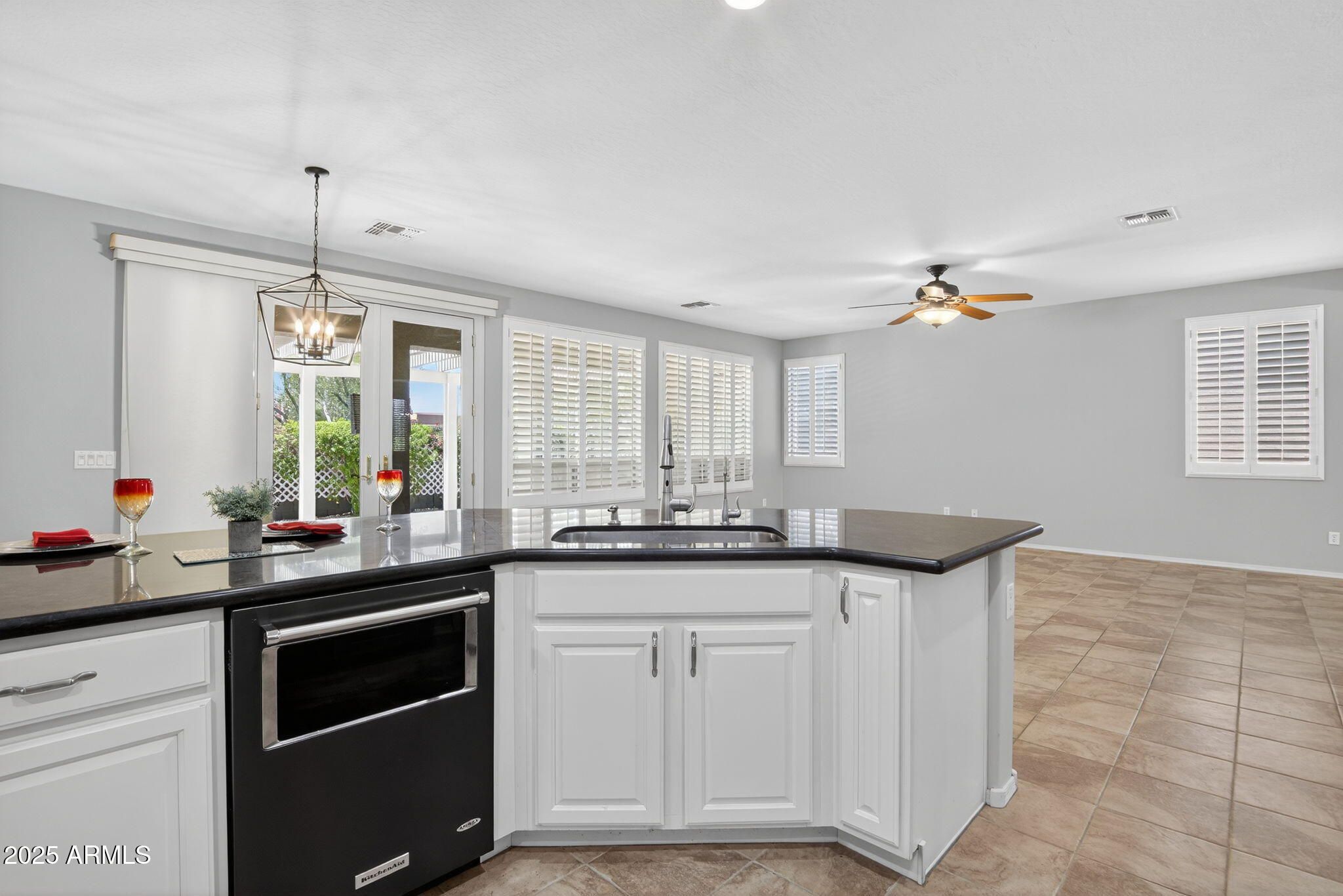 VA ASSUMABLE LOAN at 3.375% Discover beautifully updated living in the award-winning, age-restricted community of Province. This refreshed Lilac floor plan combines thoughtful upgrades, functional design, and inviting indoor-outdoor spaces. An expansive enclosed courtyard welcomes you at the entry—ideal for outdoor seating and entertaining. Inside, the gourmet kitchen features quartz countertops, stainless steel appliances, crown-molded cabinetry with pull-out shelving, wall oven and microwave, and a five-burner gas cooktop. The kitchen opens seamlessly to the spacious Great Room, creating an ideal layout for gatherings and everyday living. Tile flooring and plantation shutters add timeless style throughout the home. The Primary Suite includes a bay window, direct patio access, and a recently renovated shower with modern glass enclosure and updated fixtures. A den with French doors offers flexible space for a home office, hobby room, or additional living area. The secondary bedroom provides comfortable accommodations for guests. The backyard is thoughtfully landscaped with mature greenery, a covered patio, gas BBQ stub, and an outdoor jacuzziperfect for enjoying Arizona's beautiful weather. Recent improvements include a new roof, new garage door, new water heater, reverse osmosis system, new garbage disposal, and an extended garage with built-in storage cabinets. The laundry room is equipped with additional cabinetry and a utility sink for added convenience. Residents of Province enjoy access to resort-style amenities including indoor and outdoor pools, spa facilities, a fitness center, tennis courts, pickleball courts, and a variety of clubs and activities. The clubhouse is within easy walking distance. This well-maintained home offers modern comfort in a vibrant, amenity-rich setting.