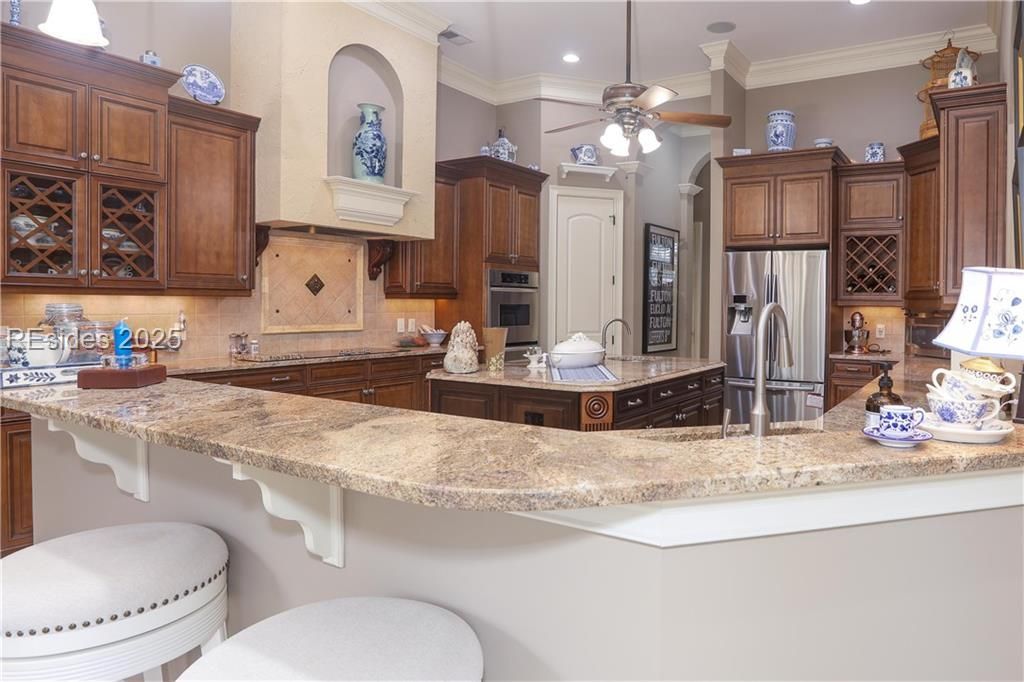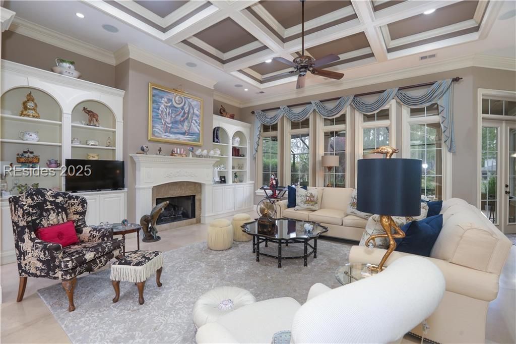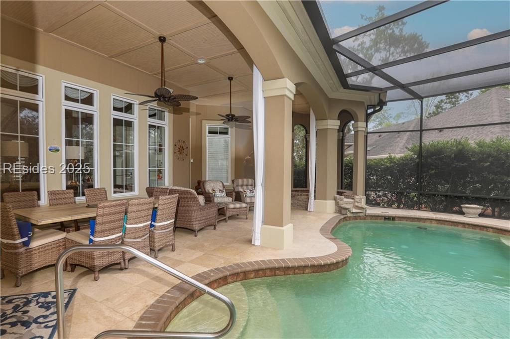 Back on the market--Buyer's plans changed--no concerns about this home with extraordinarily, gorgeous curb appeal, lightly-used, elegant ACH Custom Home on a peaceful lagoon in gated 55+ Sun City-Hilton Head's desirable Riverbend community. 2025 Pool and Spa were resurfaced, added new Birdcage Lanai, AprilAire Dehumidifier, Soffit Lights on front of home; 2024 Architectural 50-year Shingle Roof & new under-counter Kitchen Ice Maker; 2016 Brazilian Cherry floors; added Custom California-style closet shelving in pantry and bedroom walk-in closets. 4 Bedrooms 3 with en-suite bathrooms plus main bathroom next to Bedroom 3 and powder room with access door to the lanai and pool. Office has gorgeous built-in desk with storage and shelving. Inviting eat-in kitchen opens to a beautiful Great Room with gas Fireplace, coffered ceiling & built-ins. Relax and entertain in the quiet, peaceful and lovely Lanai with Nov. 2025 NEW RESURFACING of heated pool, spa & outdoor kitchen with newer grill & sink. 2 Walk-in attics provide lots of storage plus extra closet storage throughout the home. 12' & 14' ceilings, 8' doors. Bonus bedroom 4 over the garage has a large walk-in closet and en-suite bathroom. Custom shutters on all windows. Circular paver driveway. Heat & AC in 3-car plus rear-entry golf cart garage (900 sf). Garage fridge conveys. $98K amenities: 130+ clubs, 6 pools, 3 golf courses/fitness centers, theater, softball, pickleball, tennis, dock, trails, dog park, & more.