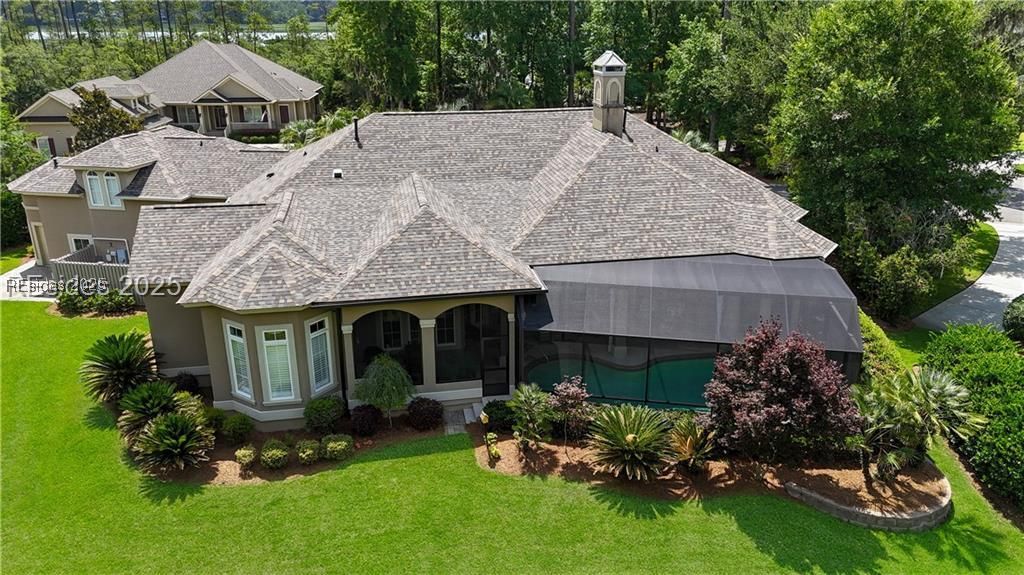 Extraordinarily gorgeous curb appeal, lightly-used, elegant ACH Custom Home on a peaceful lagoon in gated 55+ Sun City-Hilton Head's desirable Riverbend community. 2025 added AprilAire Dehumidifier & Birdcage Lanai 2024 Roof & Ice Maker; 2016 Brazilian Cherry floors. 4 Bedrooms w/en-suite baths, Office, & powder room. Inviting eat-in kitchen opens to a beautiful Great Room w/gas FP, coffered ceiling & built-ins. Lanai w/NEW RESURFACING of heated pool, spa & outdoor kitchen w/new grill & sink--relax & entertain. Circular paver driveway. Heated & AC in 3-car plus rear-entry golf cart garage. $98K amenities: 130+ clubs, 6 pools, 3 golf courses/fitness centers, theater, softball, pickleball, tennis, dock, trails, dog park, & more.