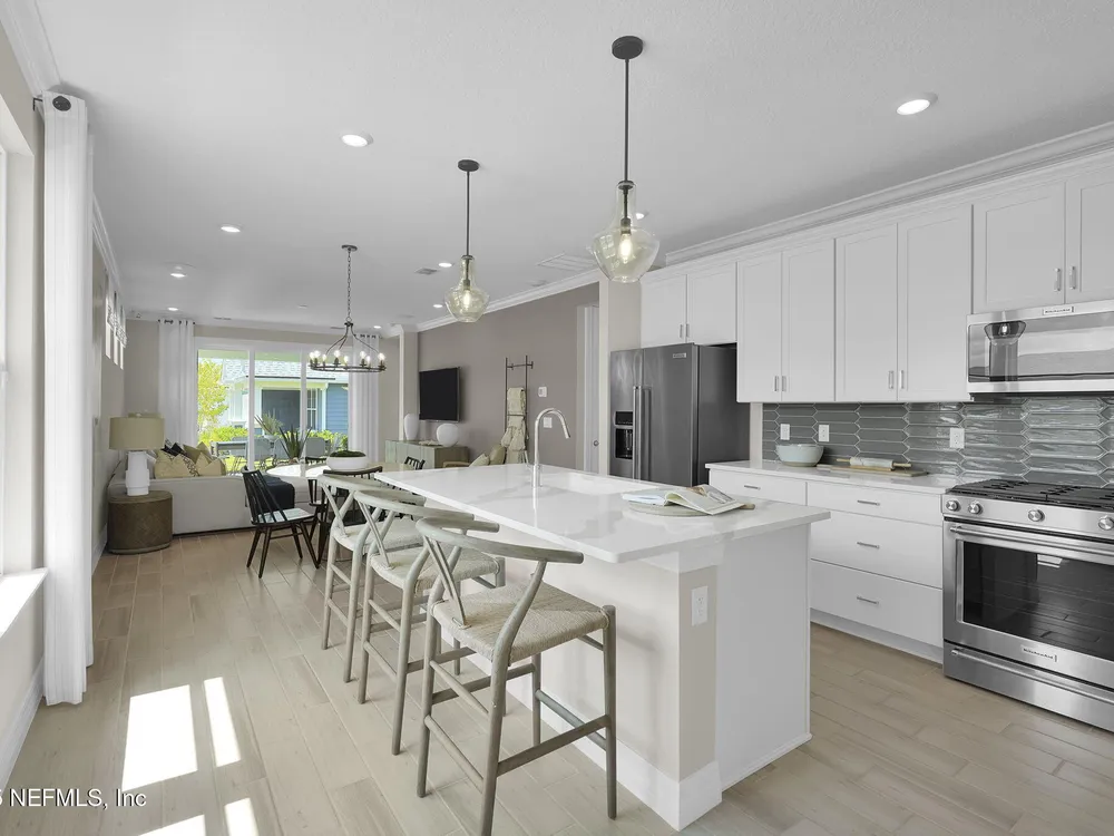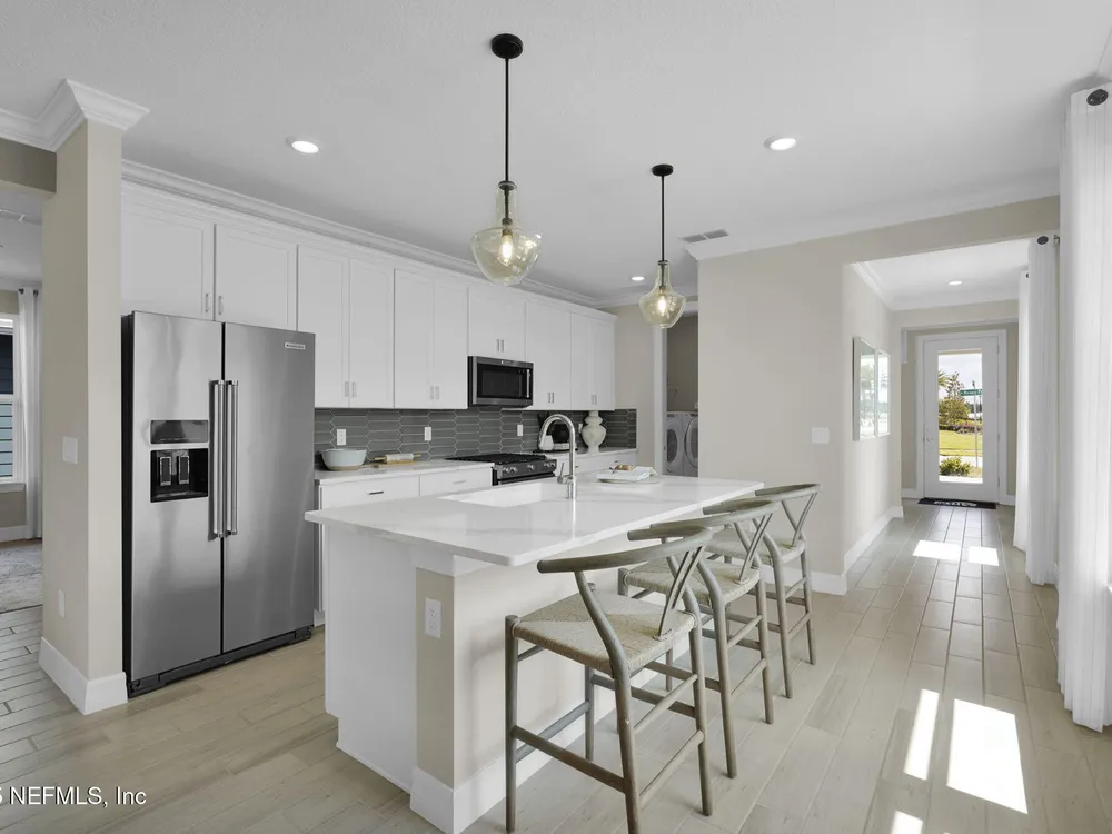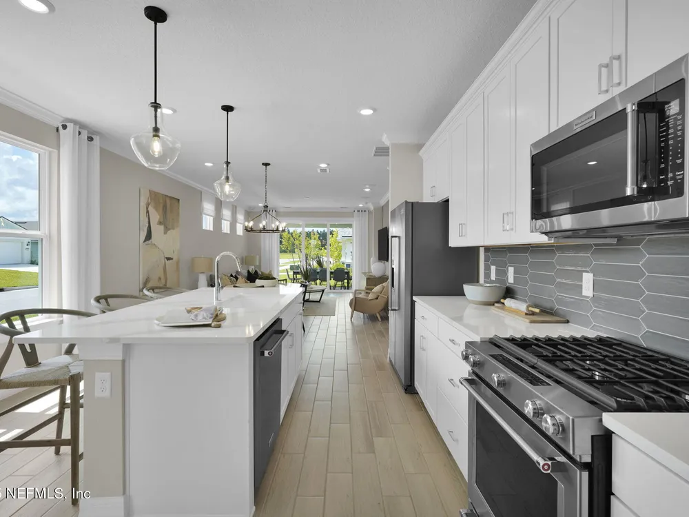 This Hallmark model home combines classic style with modern functionality. The Traditional exterior welcomes you into an upgraded interior with 2 bedrooms, 2 bathrooms, a 2-car garage with 4' extension, and an enclosed flex room—perfect for a home office or hobby space. Luxury vinyl plank flooring carries throughout the main living areas and owner's suite. The upgraded laundry room includes added cabinetry for extra storage. The gourmet kitchen offers built-in stainless steel Whirlpool appliances, 42'' white cabinets, quartz countertops, and a clean white tile backsplash. The kitchen connects effortlessly to the café and gathering room, flowing right out to your covered lanai—making indoor/outdoor entertaining simple.The owner's suite serves as a quiet retreat, complete with a dual-sink vanity, soft-close cabinets, a walk-in glass shower, and a large walk-in closet.