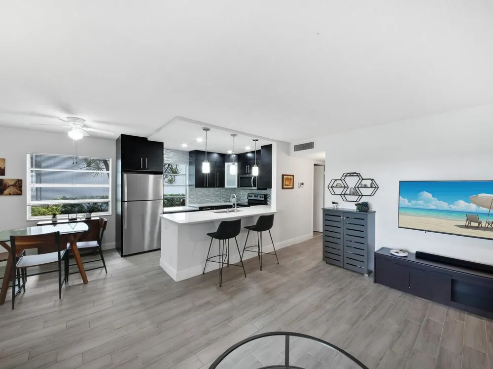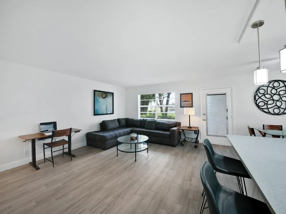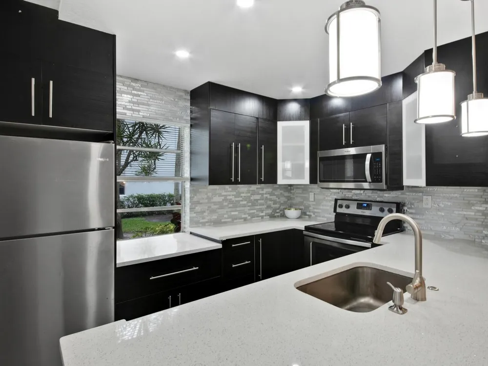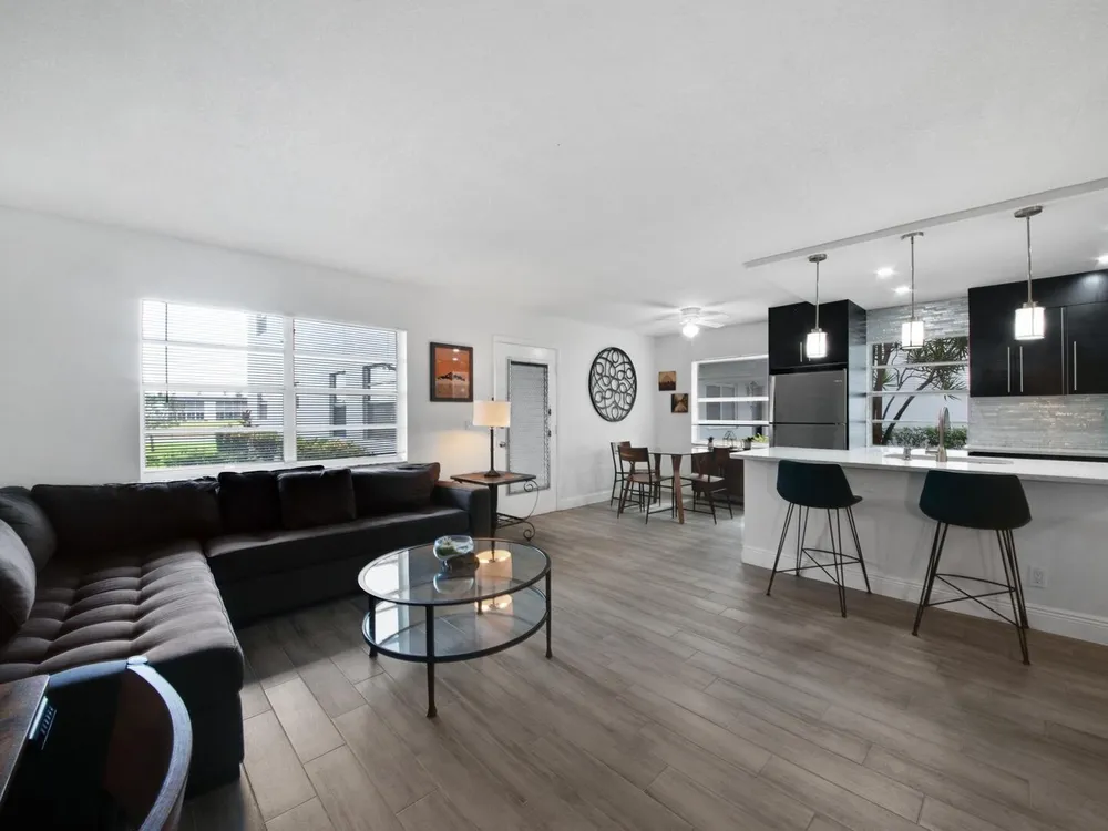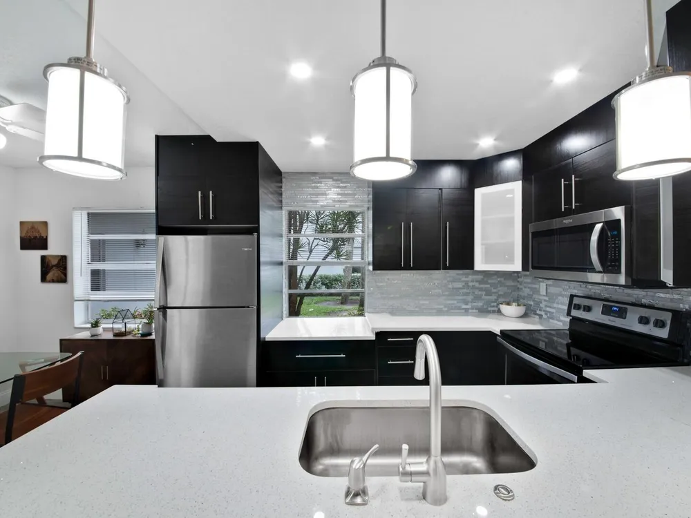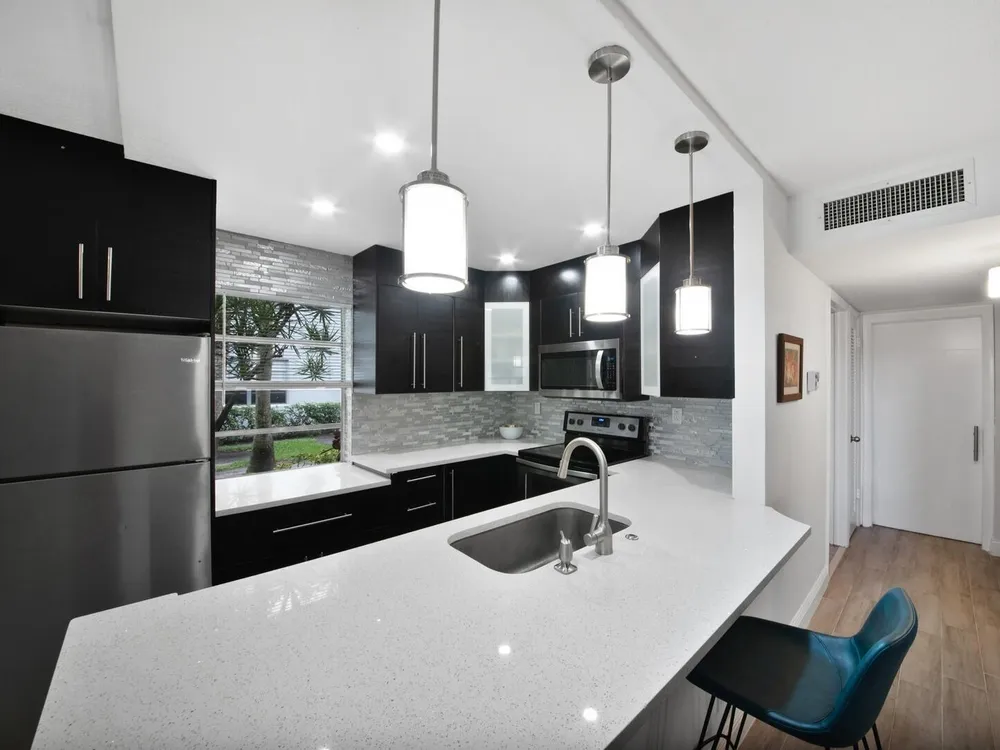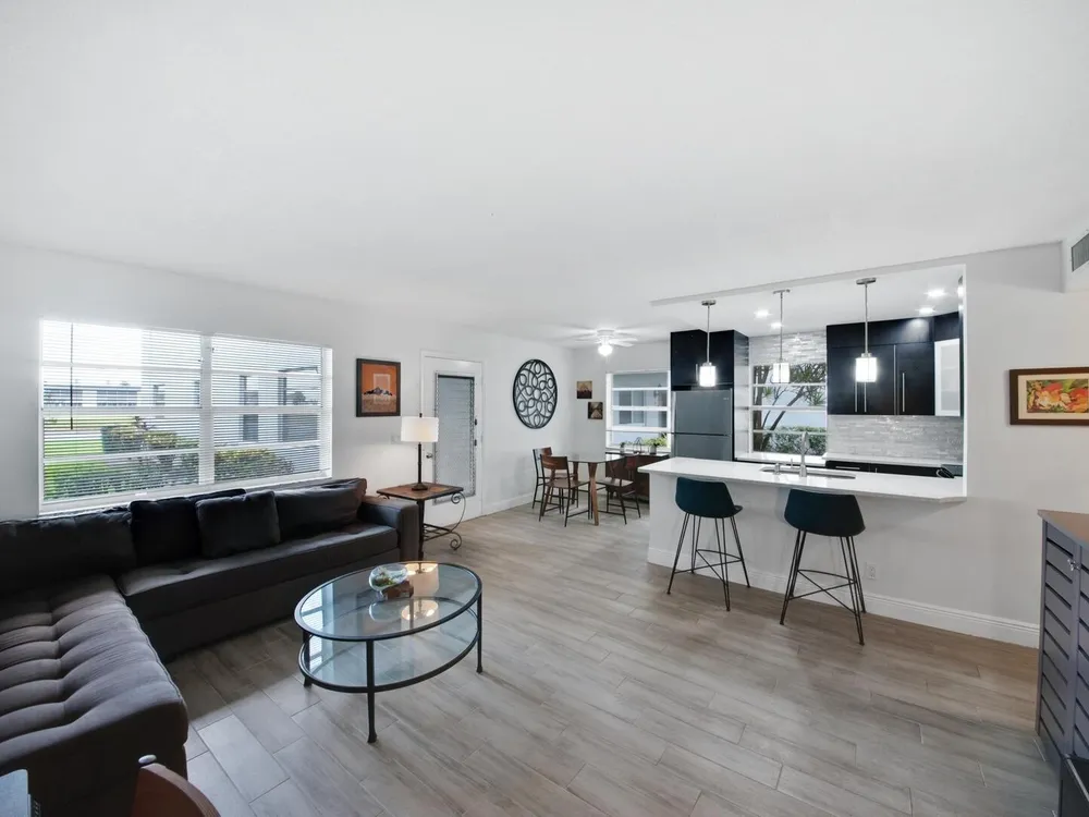 Step into this meticulously updated 2-bedroom, 2-bathroom condo where every detail has been thoughtfully curated for modern living. Located on the first floor for easy access.The gourmet kitchen is a chef's delight, boasting custom-designed cabinets, brilliant quartz countertops, all newer stainless steel appliances, and contemporary fixtures. The open-concept living area flows seamlessly, offering stunning, golf course and water views.The entire unit features durable, elegant wood-look tile flooring, providing a cohesive and upscale feel. Both bathrooms have been fully remodeled with luxurious marble and designer tilework. Retreat to the enclosed sunroom/patio, featuring a beautiful ceramic tile, offering a serene garden area view. Located in a prime, quiet section of the community.