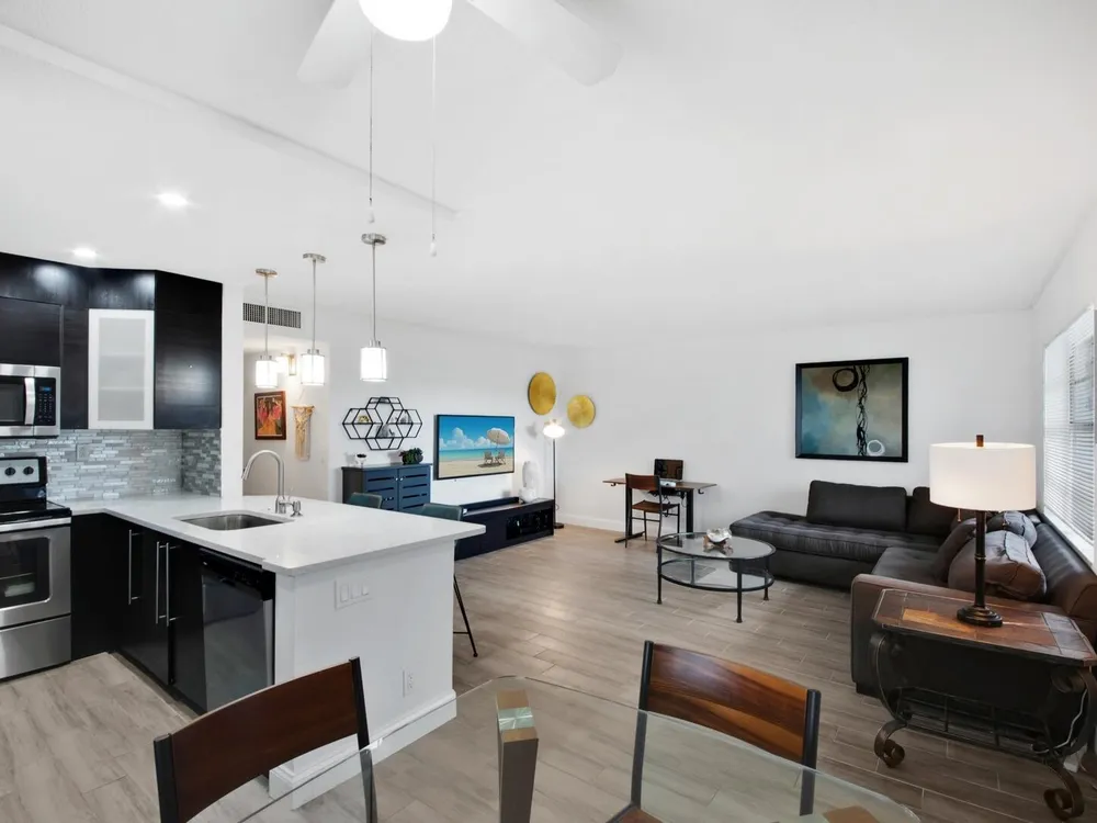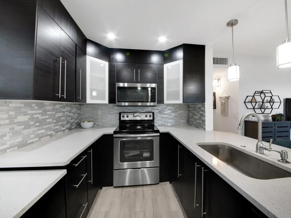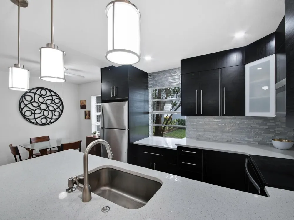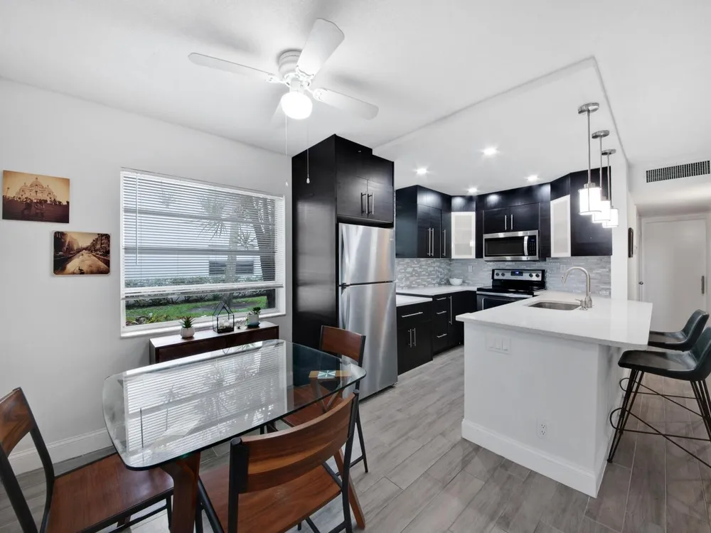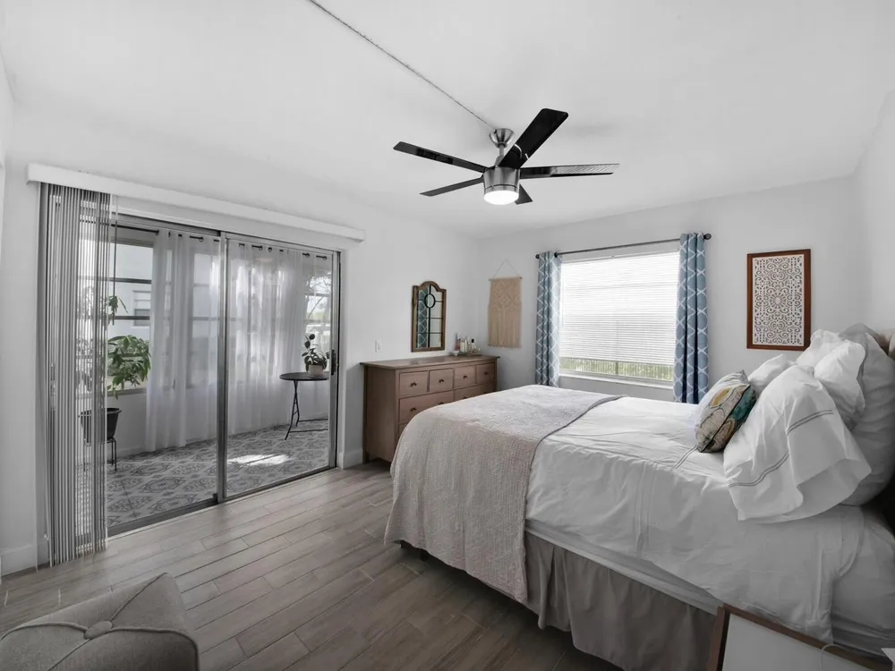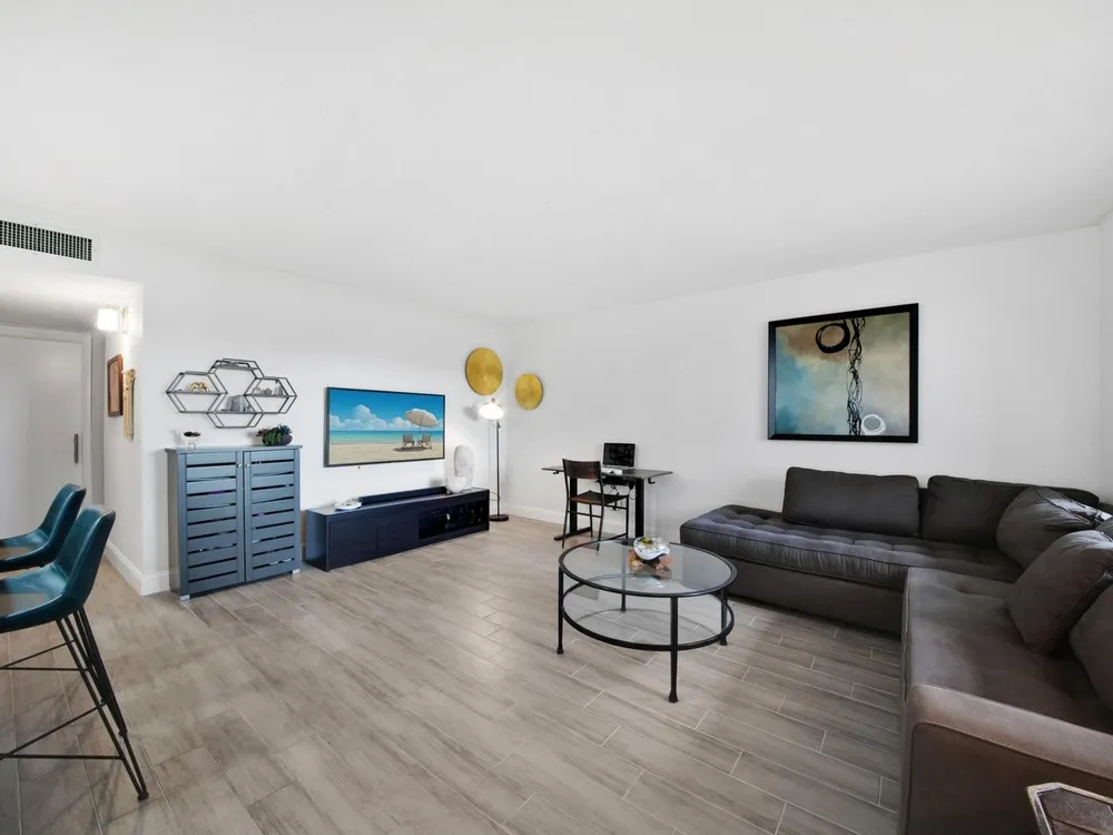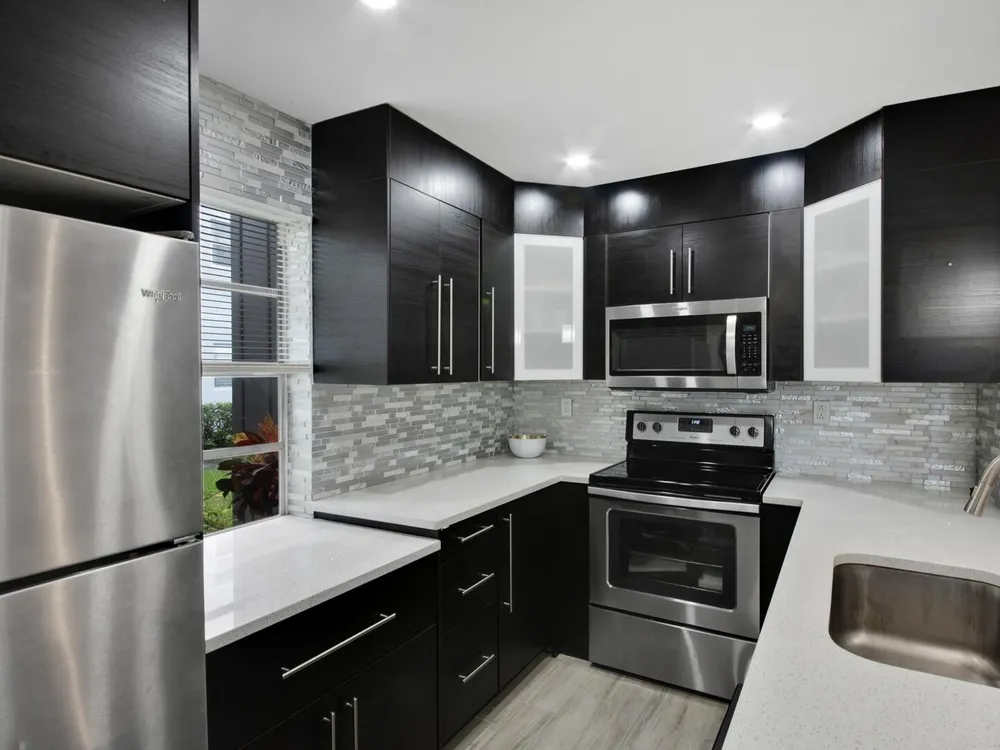 Step into this meticulously updated 2-bedroom, 2-bathroom condo where every detail has been thoughtfully curated for modern living. Located on the first floor for easy access.The gourmet kitchen is a chef's delight, boasting custom-designed cabinets, brilliant quartz countertops, all newer stainless steel appliances, and contemporary fixtures. The open-concept living area flows seamlessly, offering stunning, golf course and water views.The entire unit features durable, elegant wood-look tile flooring, providing a cohesive and upscale feel. Both bathrooms have been fully remodeled with luxurious marble and designer tilework. Retreat to the enclosed sunroom/patio, featuring a beautiful ceramic tile, offering a serene garden area view. Located in a prime, quiet section of the community.